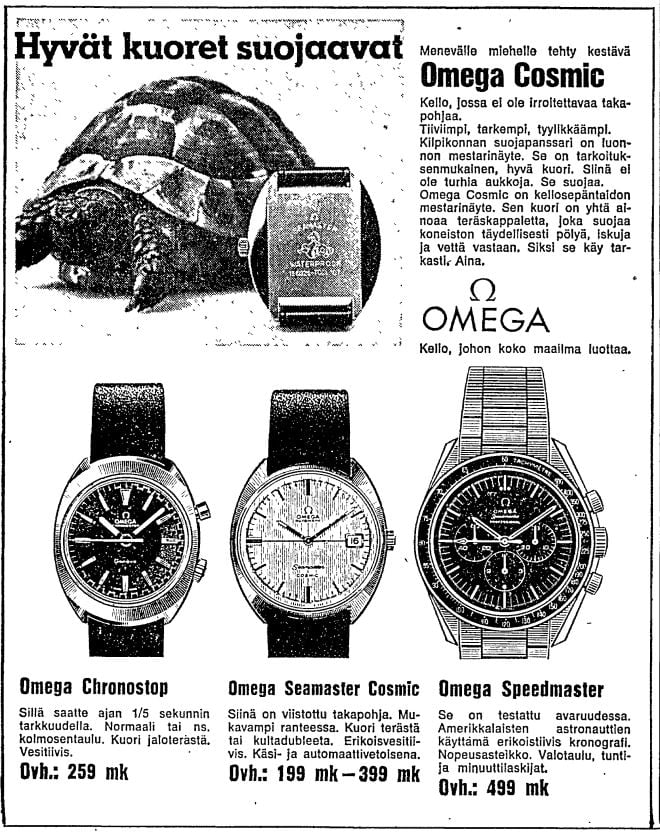 Finnish advertisement from 1969. It states that Cosmic is made for an “active man” and compares the monocoque case to a shell of a tortoise which the ad calls “a masterpiece of nature” because it has “no unnecessary gaps” and therefore offers great protection. Stealing a bit of Certina’s thunder there eh? As you can see, in 1969 a manual wind Cosmic set you back 199 Finnish marks. That translates to about 330 USD today. Note the price difference compared to a Speedmaster (500 Mk or 850 USD in 2022)