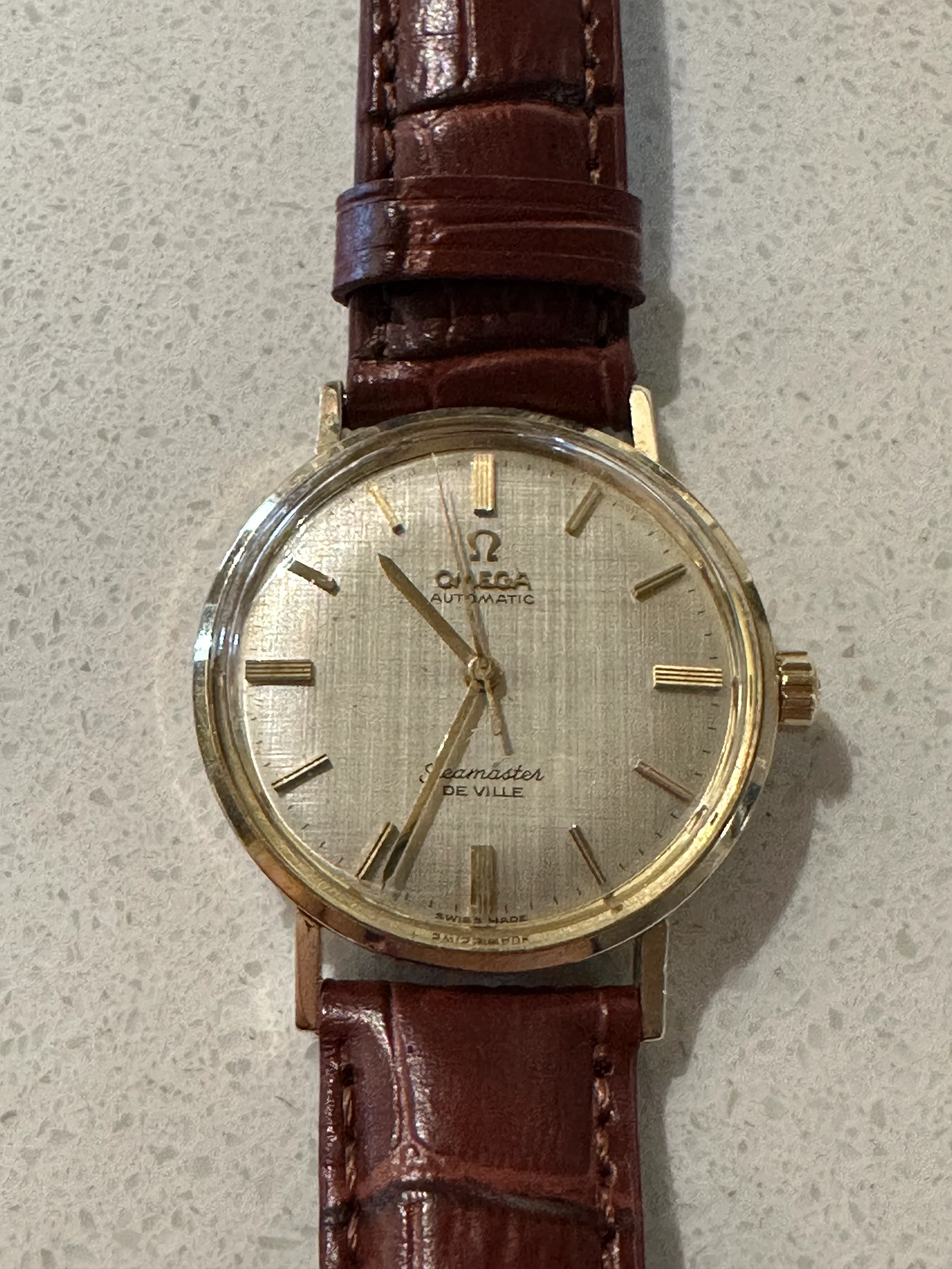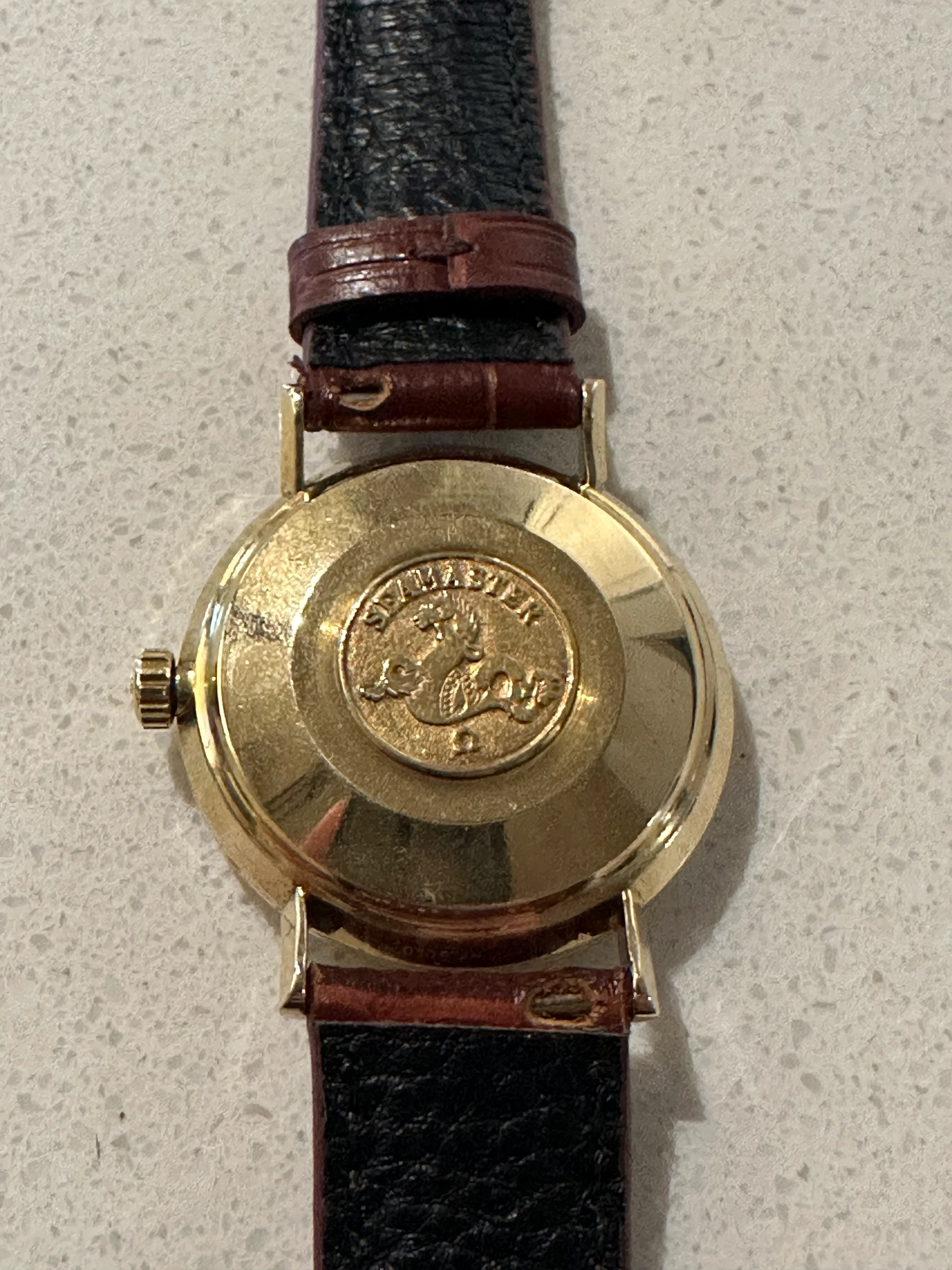 From the serial, what I can tell is it was made around 1963, caliber 550, 14k case. I ended up getting a strap from StrapsCo and also what I assume a fake-ish Omega buckle from eBay as well. I'm not a fan of the quick release spring bars so put some normal ones on. Also if anyone needs a 18mm gold omega buckle, let me know as I didn't realize I actually needed a 16mm one...