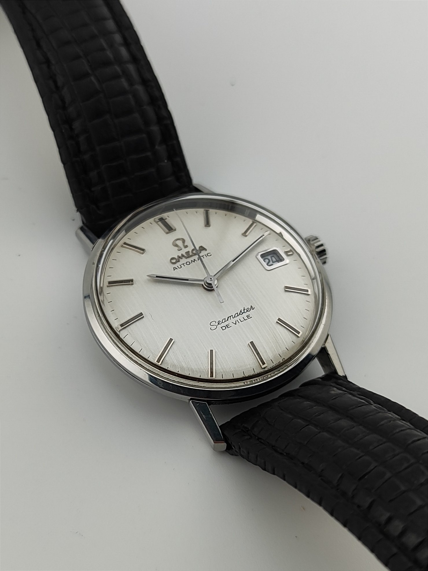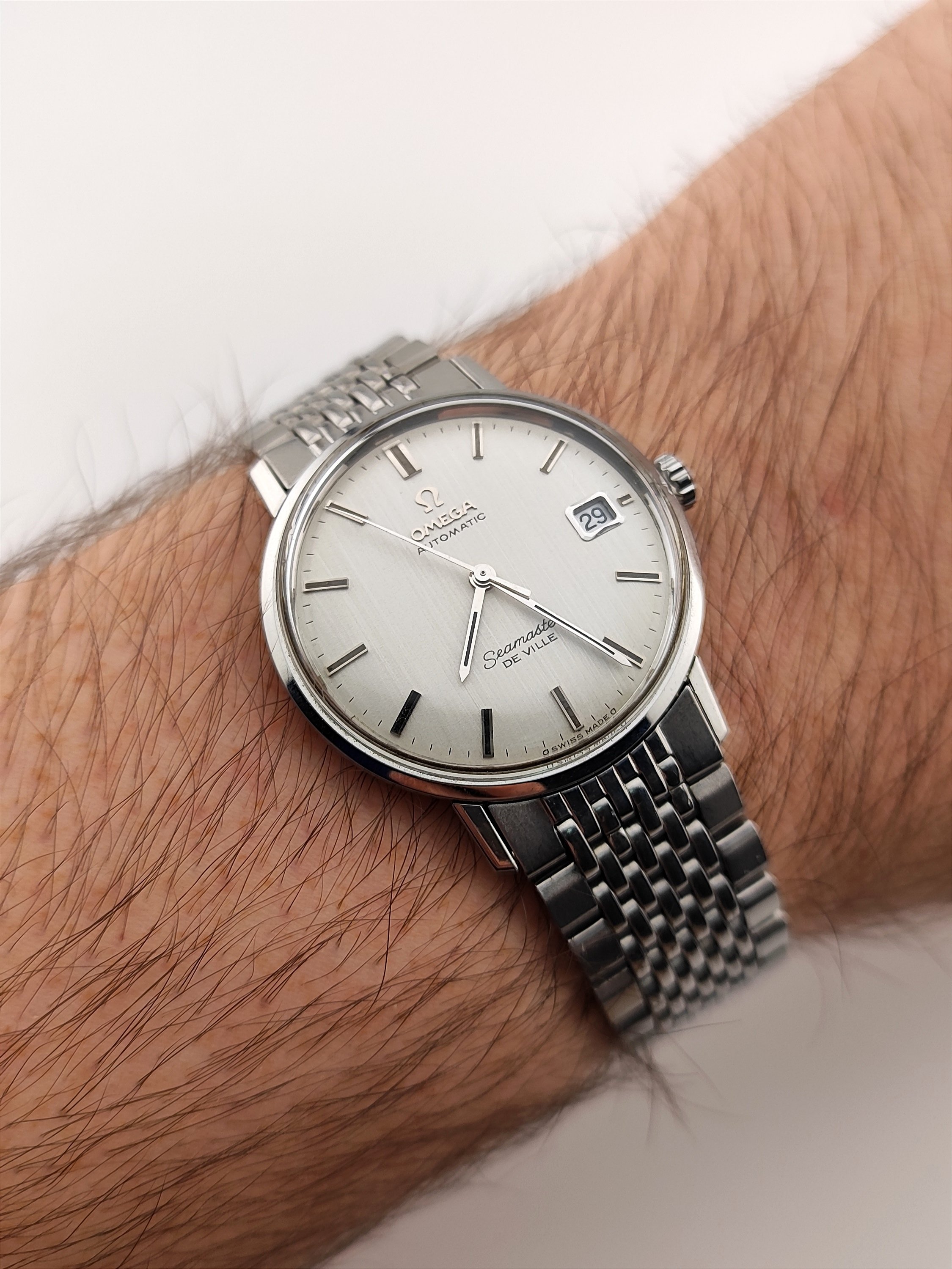 ·Hi all. I got offered this watch today and decided to go for it. It's a Seamaster DeVille, ref 166.020, with a textured sigma dial, and a caliber 563 movement. A small watch at 34.5mm, but it wears almost as a 36mm and even on my larger wrists it looks quite nice. Has been serviced a few weeks ago.