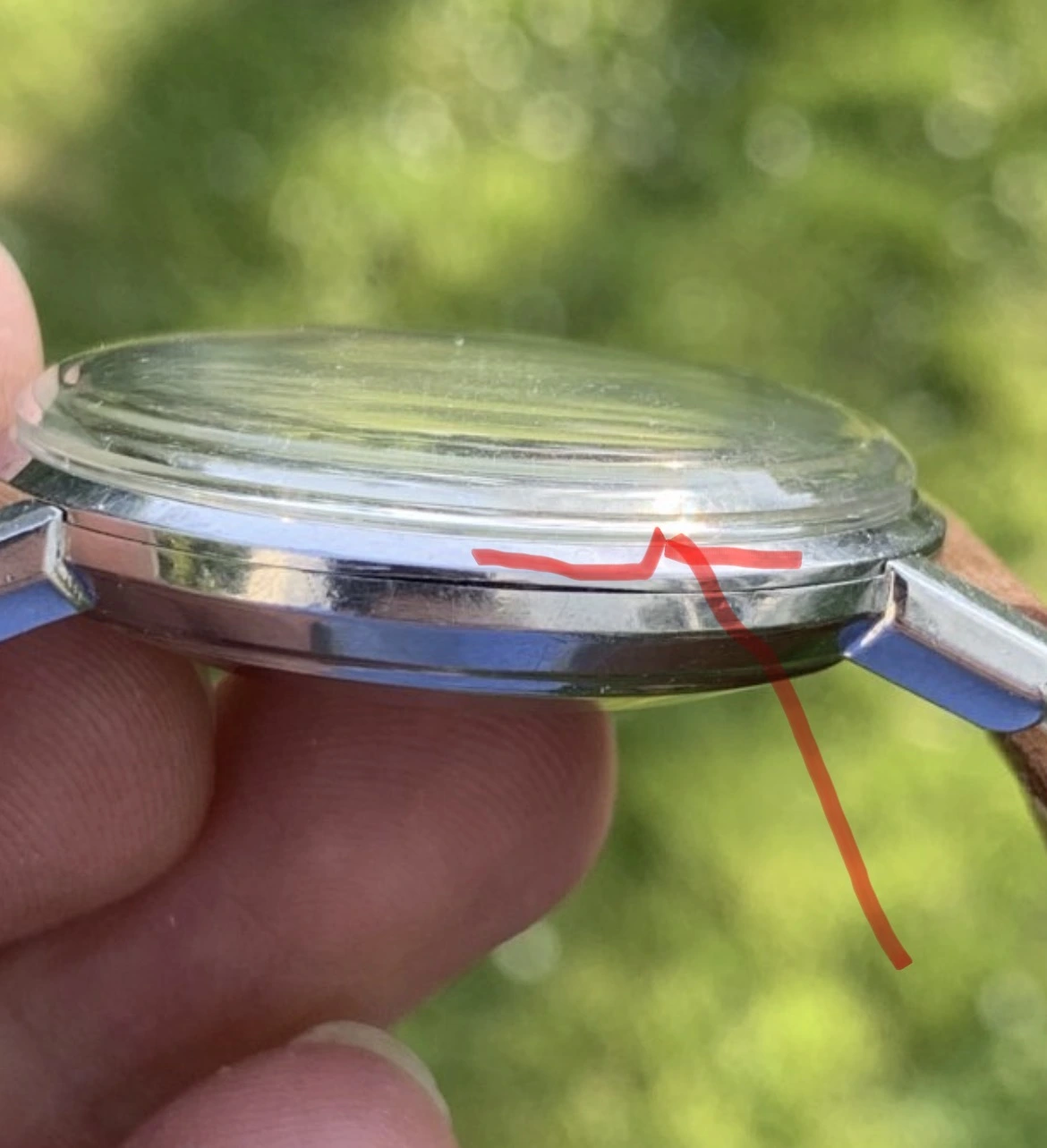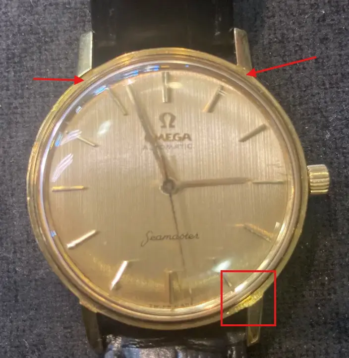 See the first photo that SOG53 posted above. Your photo clearly shows the recessed area where the bezel would sit (see arrows). You can also see the different finish at the bottom compared to the rest of the case.