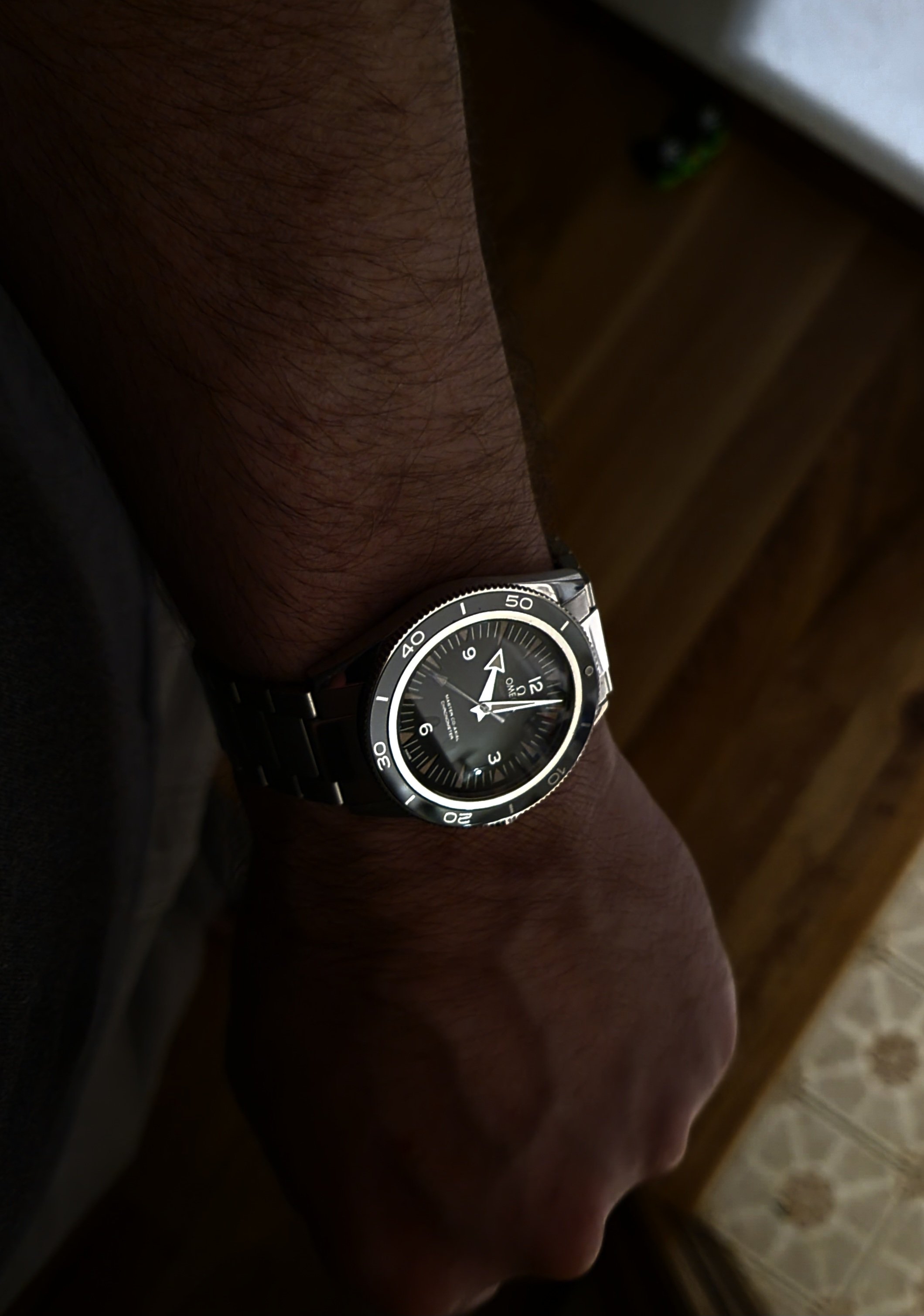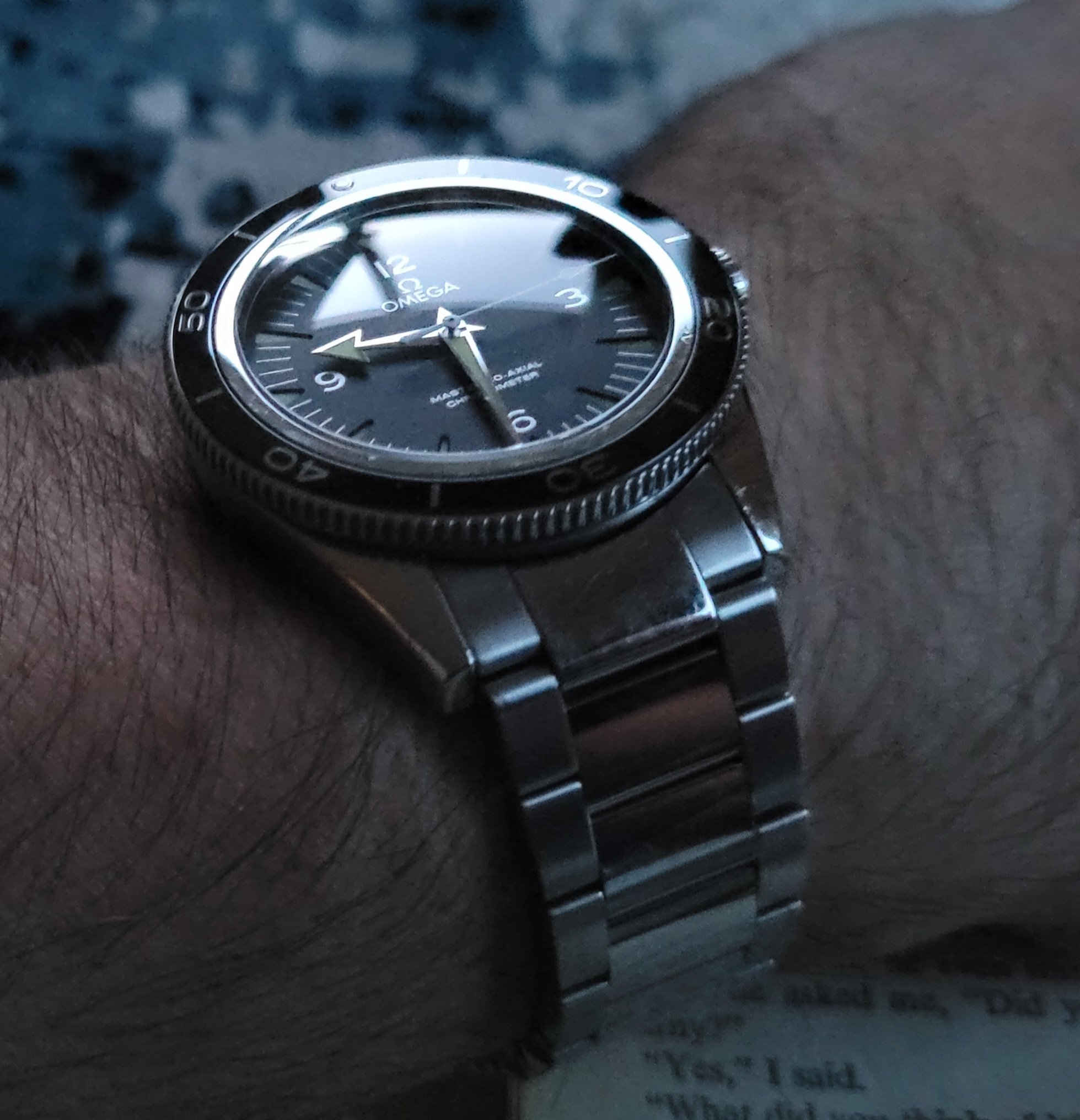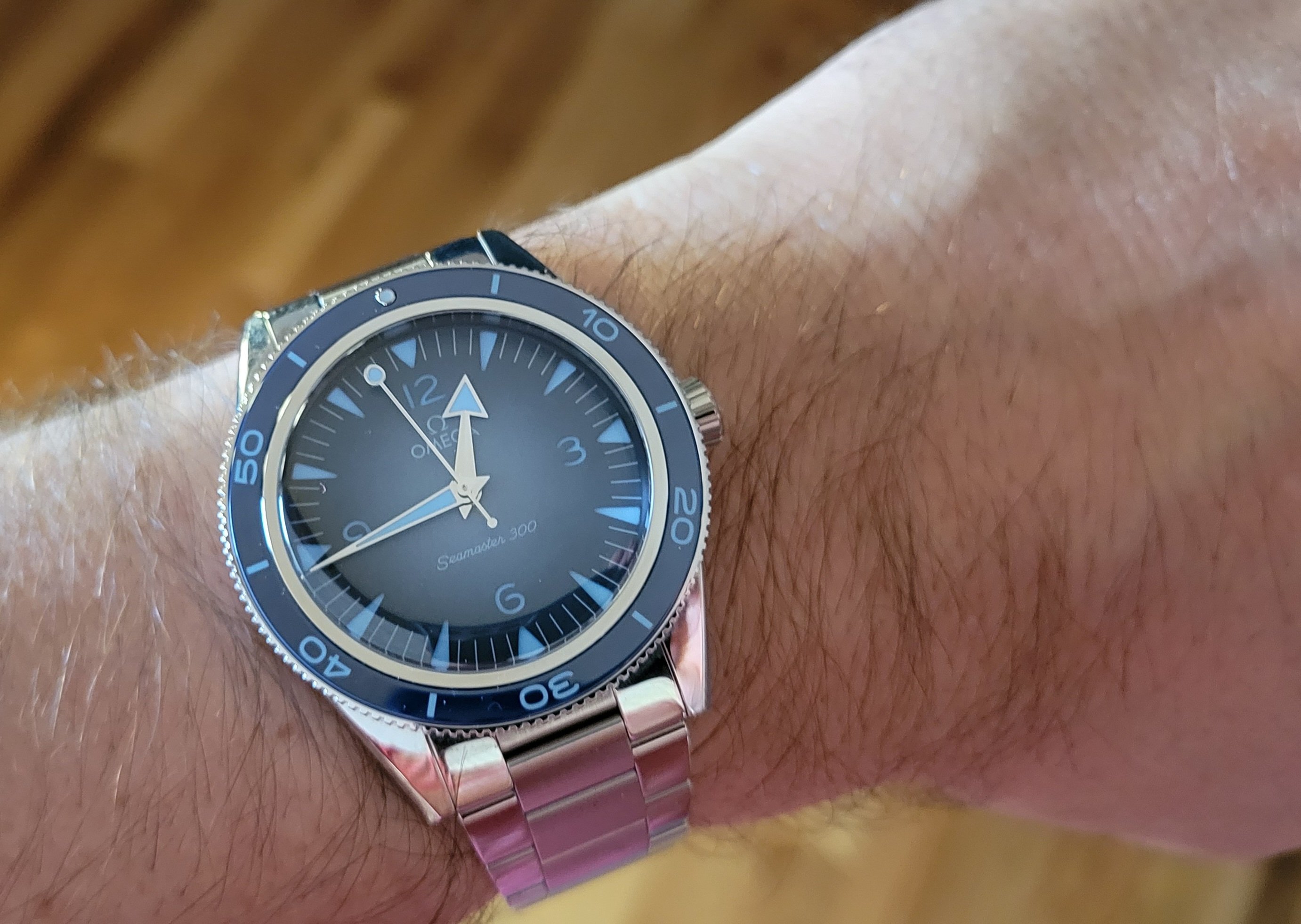 All things being equal, I would prefer a ceramic bezel insert to aluminum for its increased durability. That being said, it's my understanding that Omega chose an aluminum insert for the "standard" 300 Heritage model because it is more in keeping with the vintage character of the watch. It's also my understanding that the aluminum insert has a special coating which makes it substantially more durable and scratch resistant than a standard aluminum bezel, but still considerably less so than ceramic. I've had my 300 since earlier this summer and the bezel has taken a few hits with no damage so far. I actually really like the fact that the bezel is lumed. Not that I'm timing anything in the middle of the night, but if I were, it would be a nice feature. As shown in my photo above, the overall lume on the watch is just outstanding and, once charged, it lasts through the night.