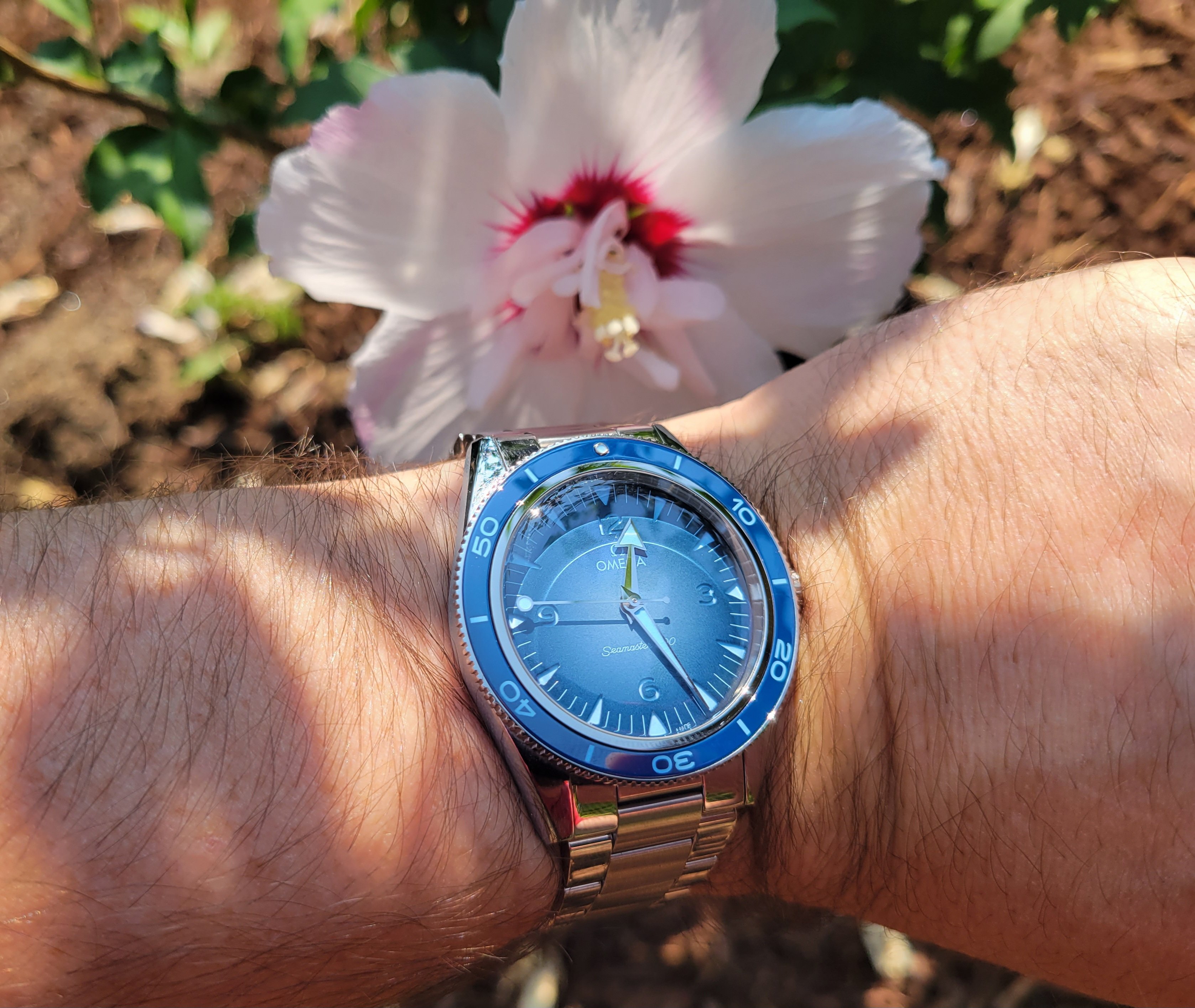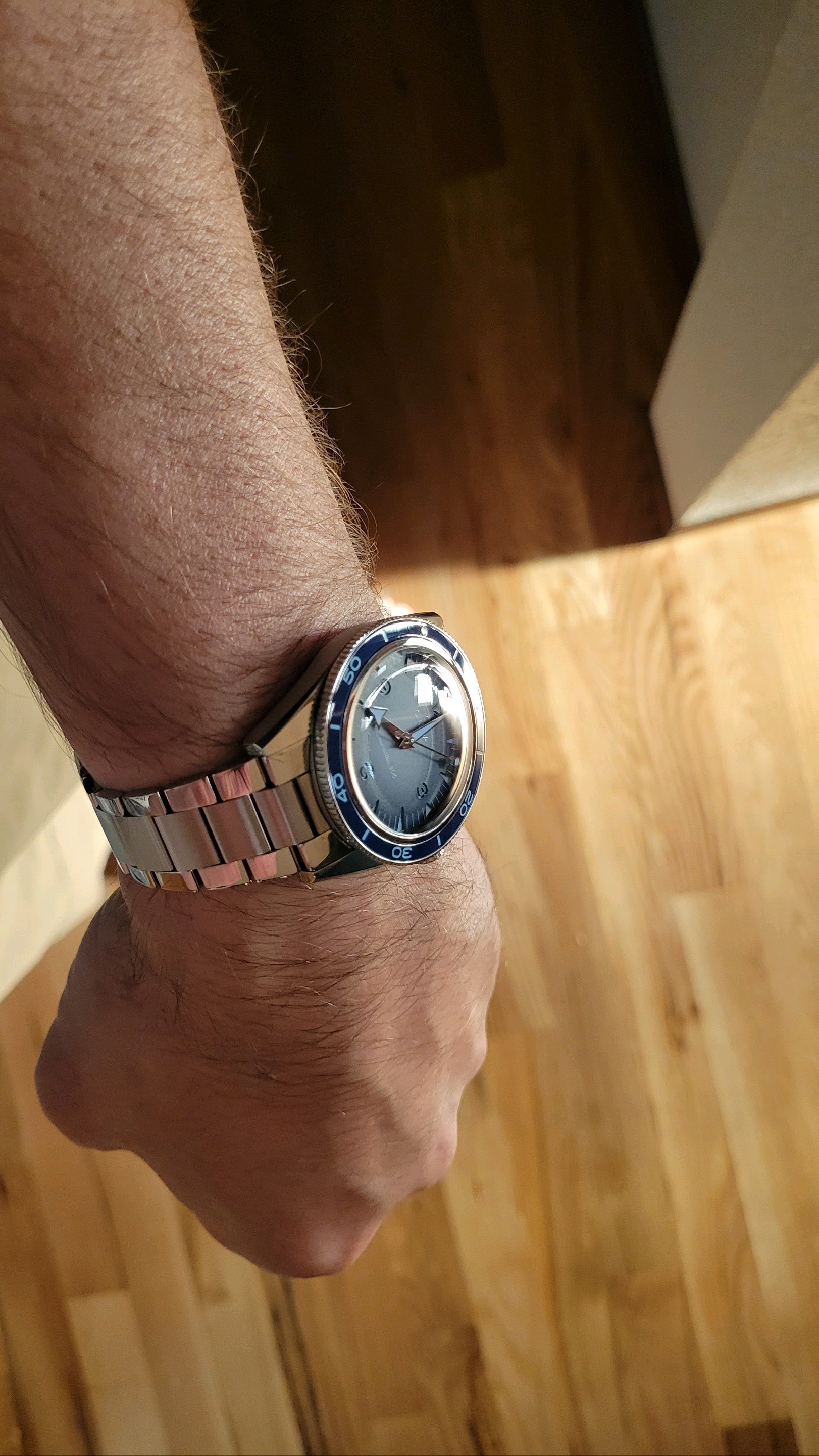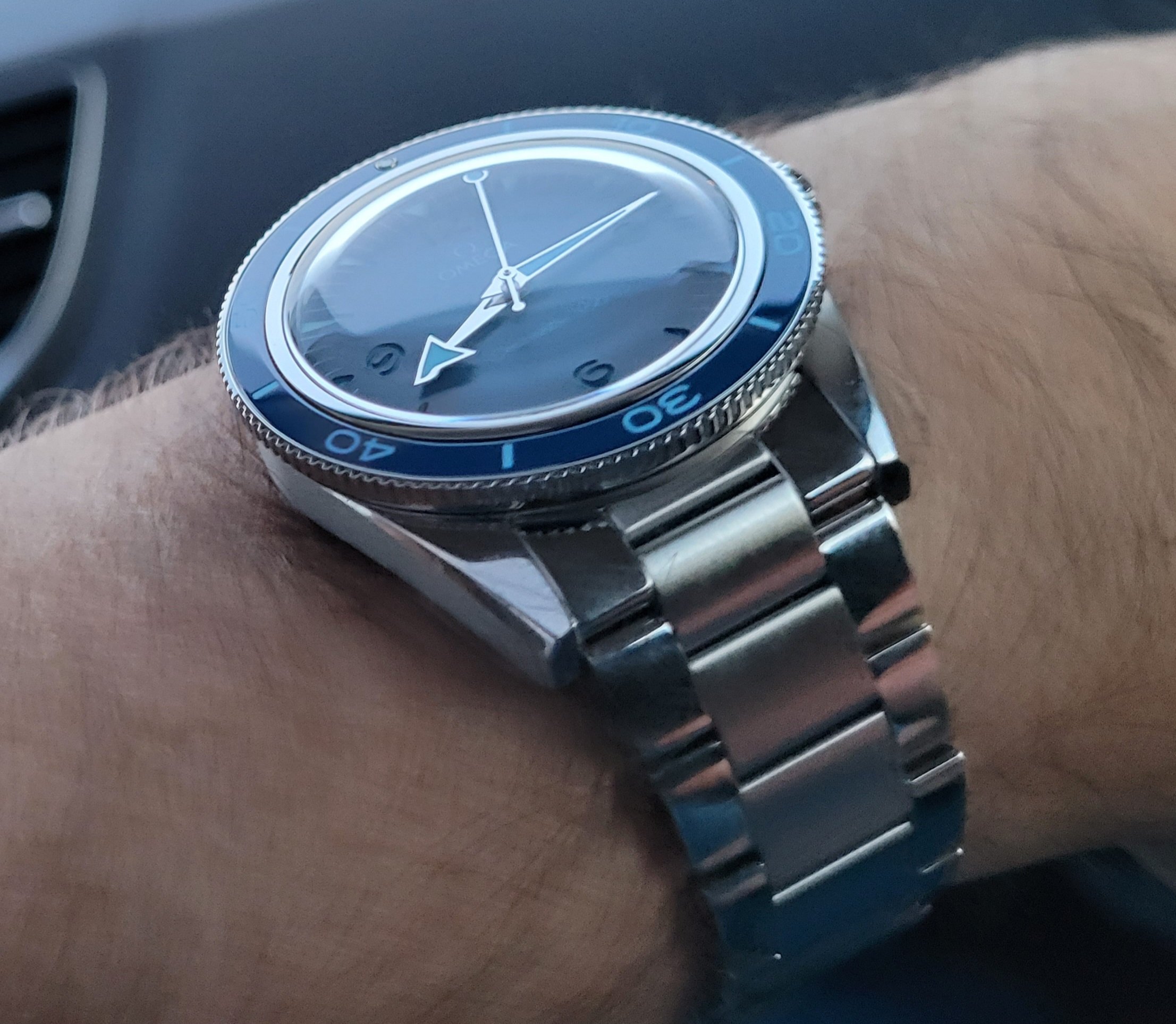 All things being equal, I would prefer a ceramic bezel insert to aluminum for its increased durability. That being said, it's my understanding that Omega chose an aluminum insert for the "standard" 300 Heritage model because it is more in keeping with the vintage character of the watch. It's also my understanding that the aluminum insert has a special coating which makes it substantially more durable and scratch resistant than a standard aluminum bezel, but still considerably less so than ceramic. I've had my 300 since earlier this summer and the bezel has taken a few hits with no damage so far. I actually really like the fact that the bezel is lumed. Not that I'm timing anything in the middle of the night, but if I were, it would be a nice feature. As shown in my photo above, the overall lume on the watch is just outstanding and, once charged, it lasts through the night.