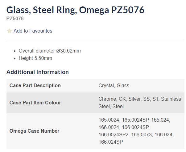·Hello. I have an Omega Seamaster Ref 166.073 (cal 565) in desperate need of a new crystal. I have no idea what the correct part number is for the crystal but saw one small blip that crystal (PZ 5076) for the Seamaster 300, ref 166.024 fits ref 166.073. Can anyone confirm this? If this correct, then the tension ring for the 166.024 would also work for the 166.073. Anyone have an idea of that part number? Thanks for any info and any other reference sources!