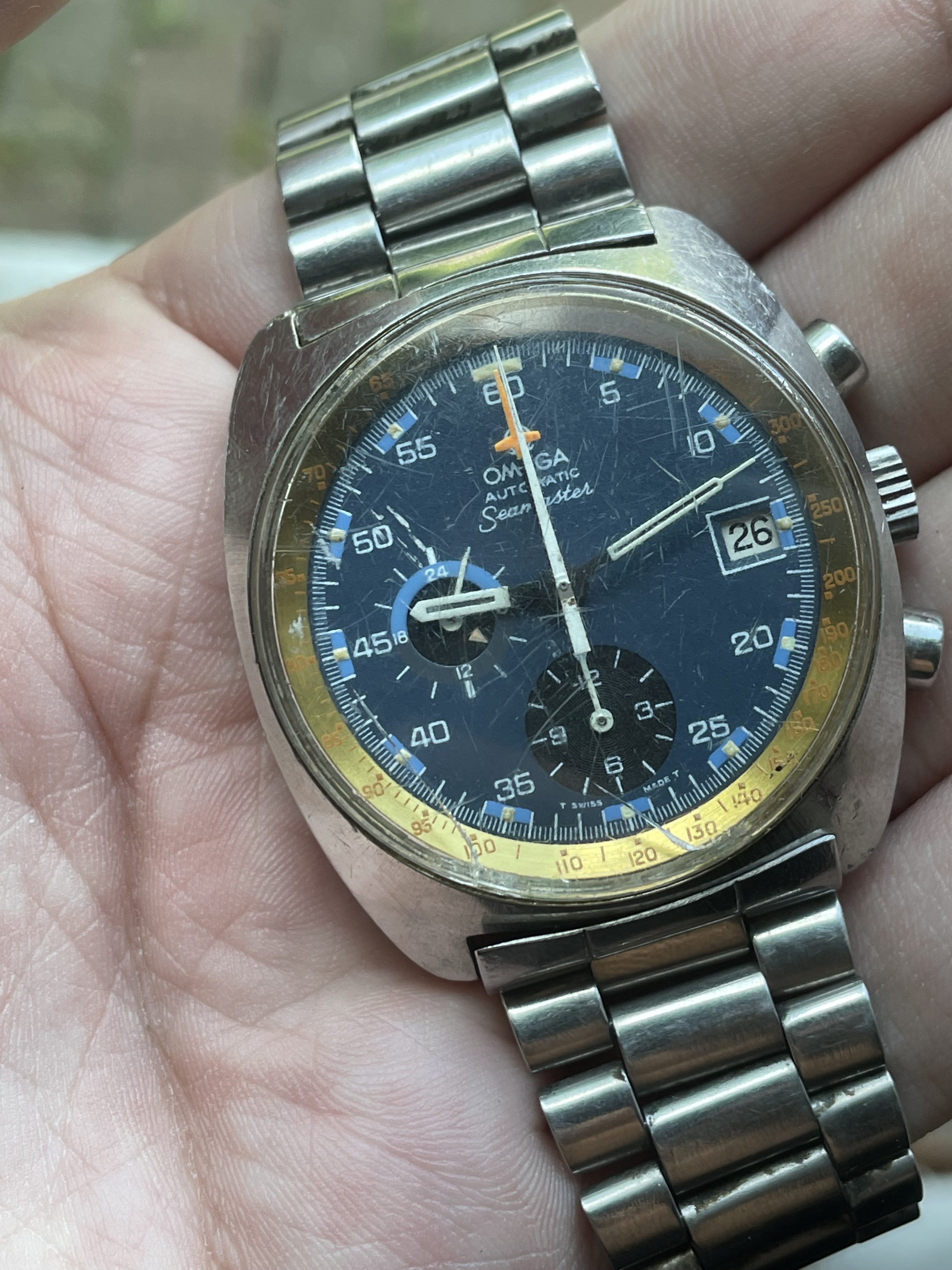 ·Hi all, I recently snagged this on eBay with the intention of getting it serviced/restored. It seemed like a bargain that left me a lot of room for a service...possibly by Omega in Bienne. The inner bezel color struck me as odd and my plan was to have it replaced with a correct white one. The seller believed it may have been original, but upon some research I surmise it may have been taken from a gold plated model. Can anyone confirm this for me?