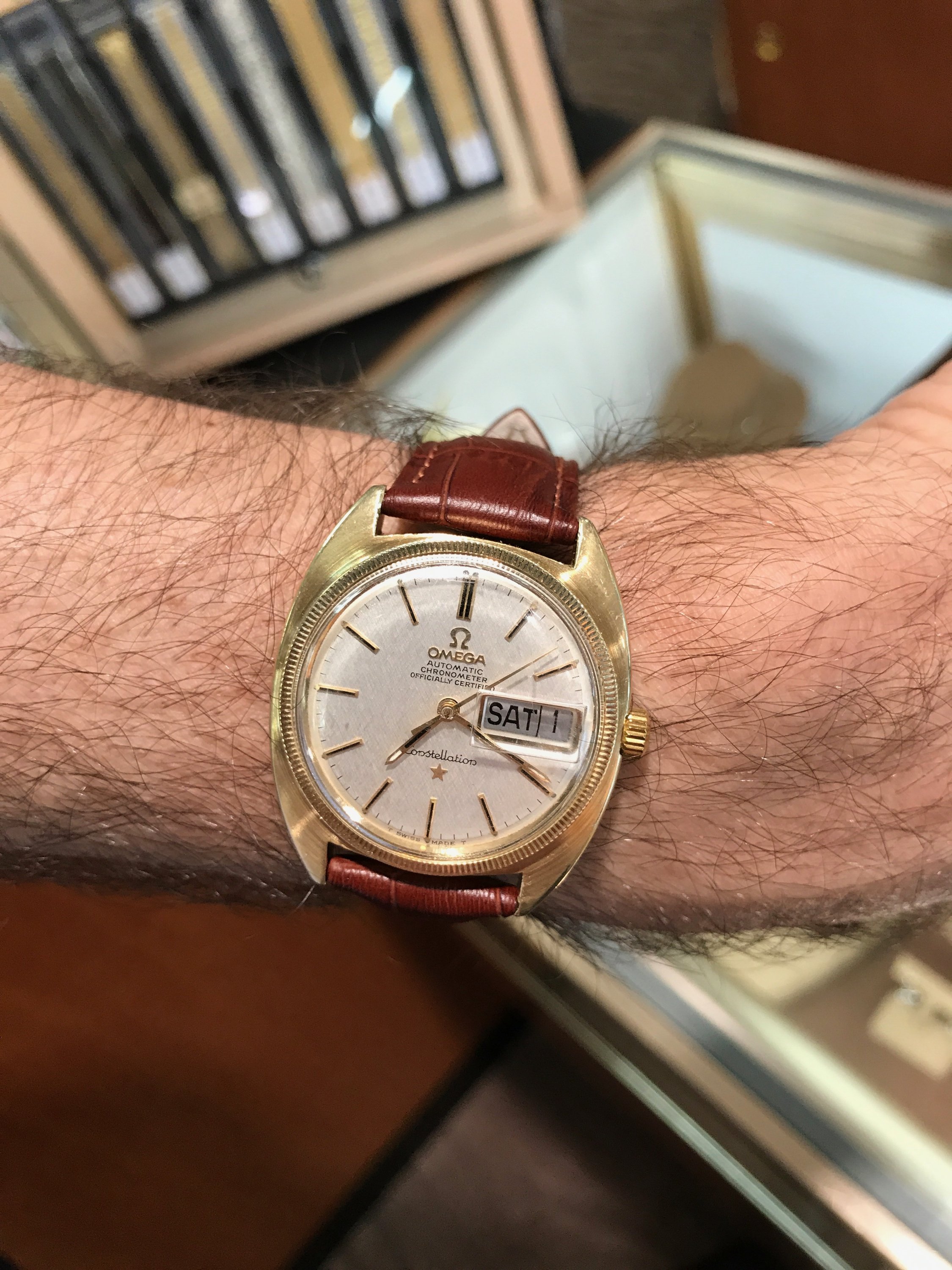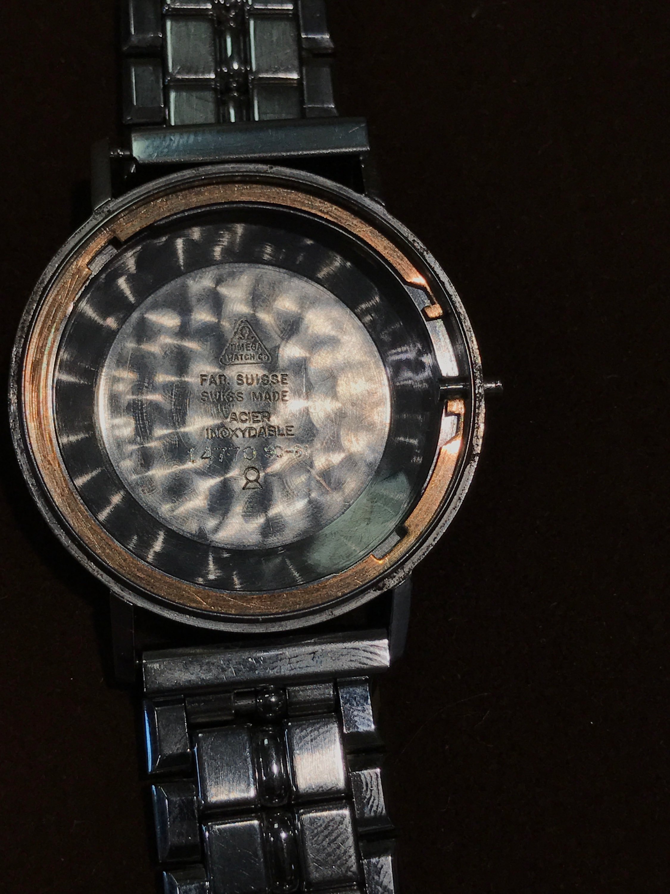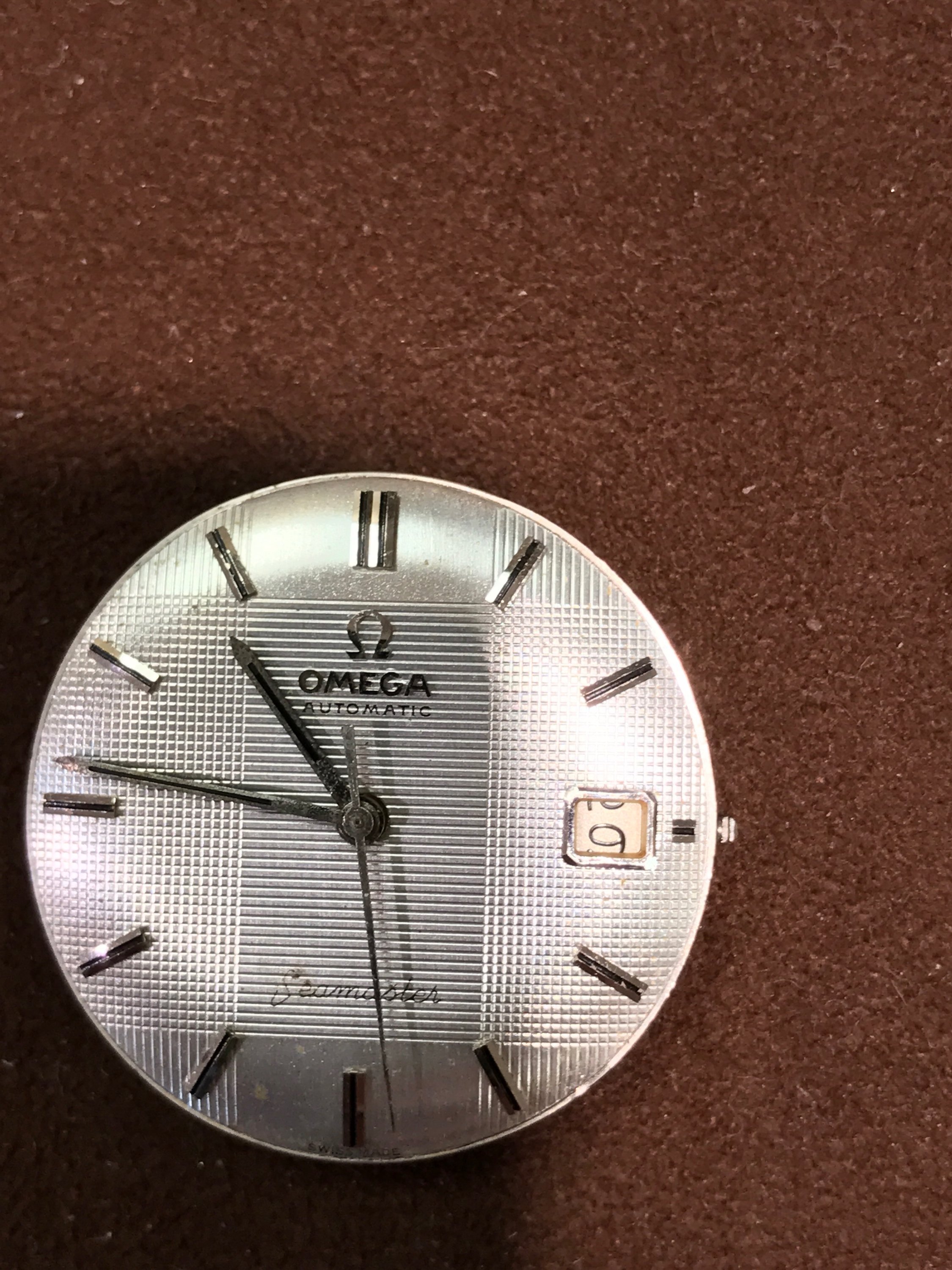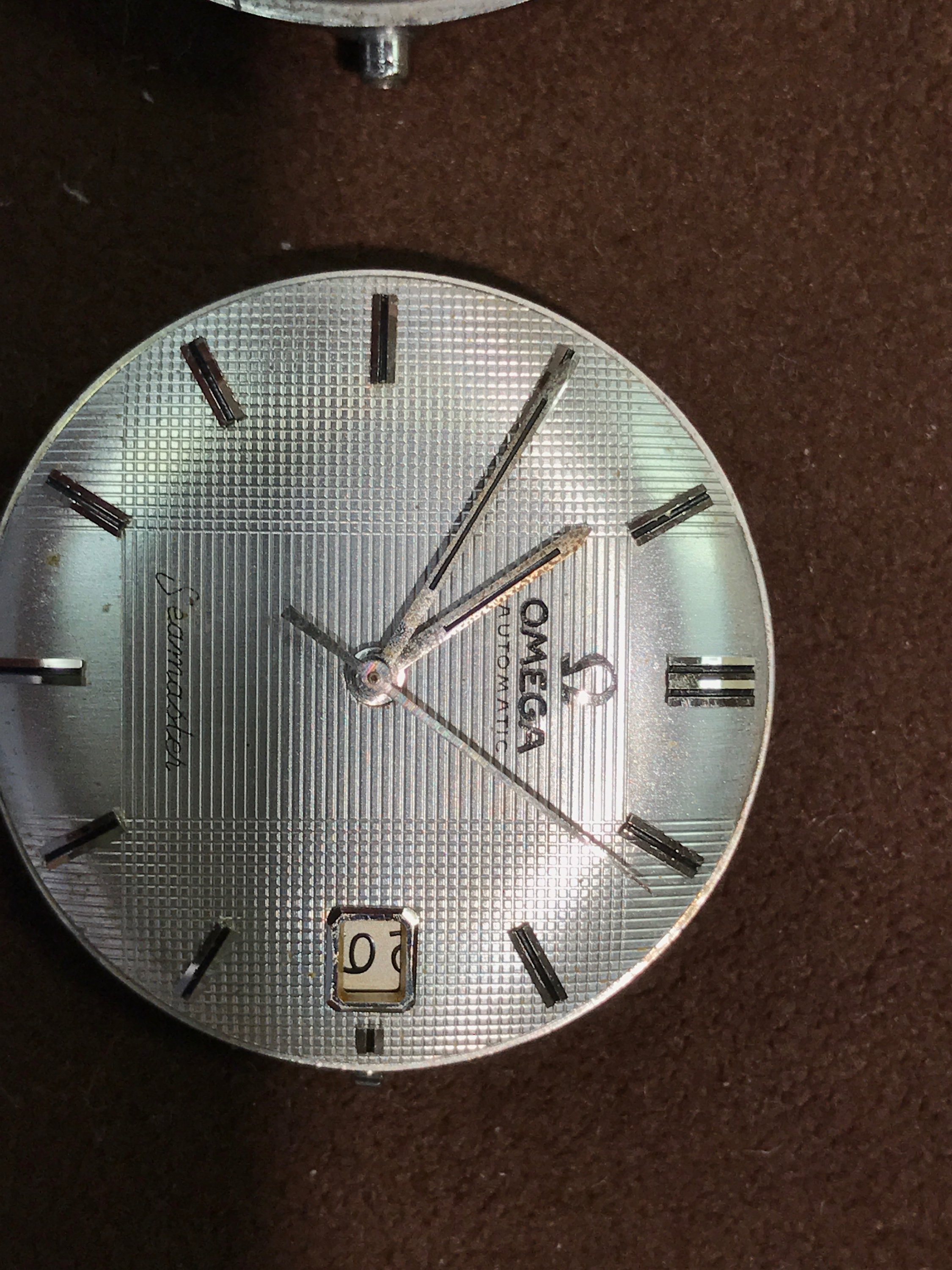 The OMEGA is not centred correctly, the vertical bar of the E should be closer to centre, that is, almost directly beneath the gap in the Ω. However, the AUTOMATIC seems to be correctly positioned which makes the OMEGA stand out even more.