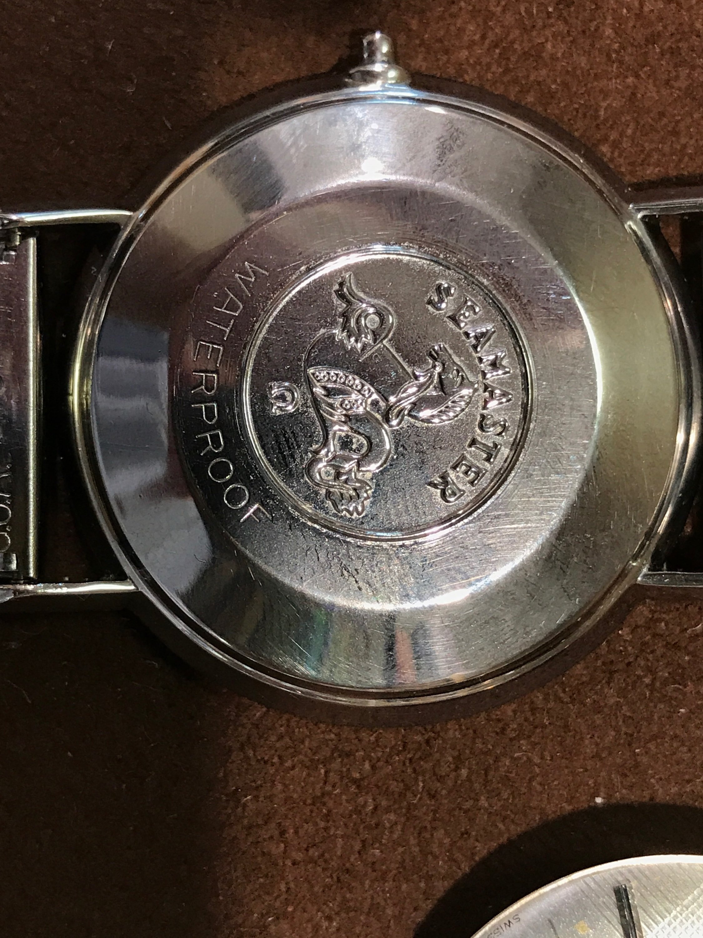The Seamaster is tilted, not level with the etching.