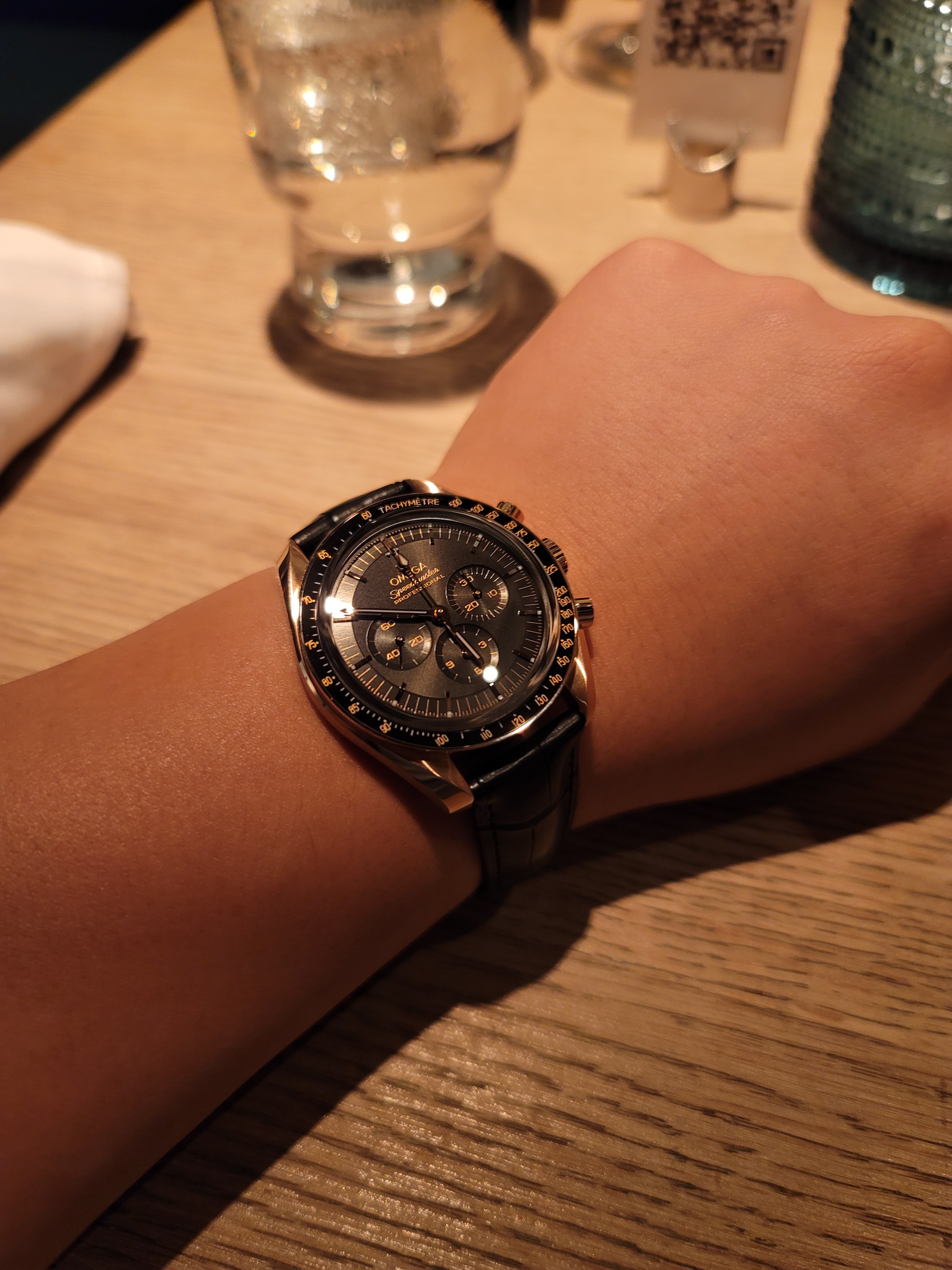 The gold indices are nice. Better than onyx. Plus they are long. It's a nice feature. The whole dial seems great. Stepped, AML but in gold. I even like that the bezel in aluminum instead of ceramic. A little more authenticity. Refined but still consistent with moonwatch features.