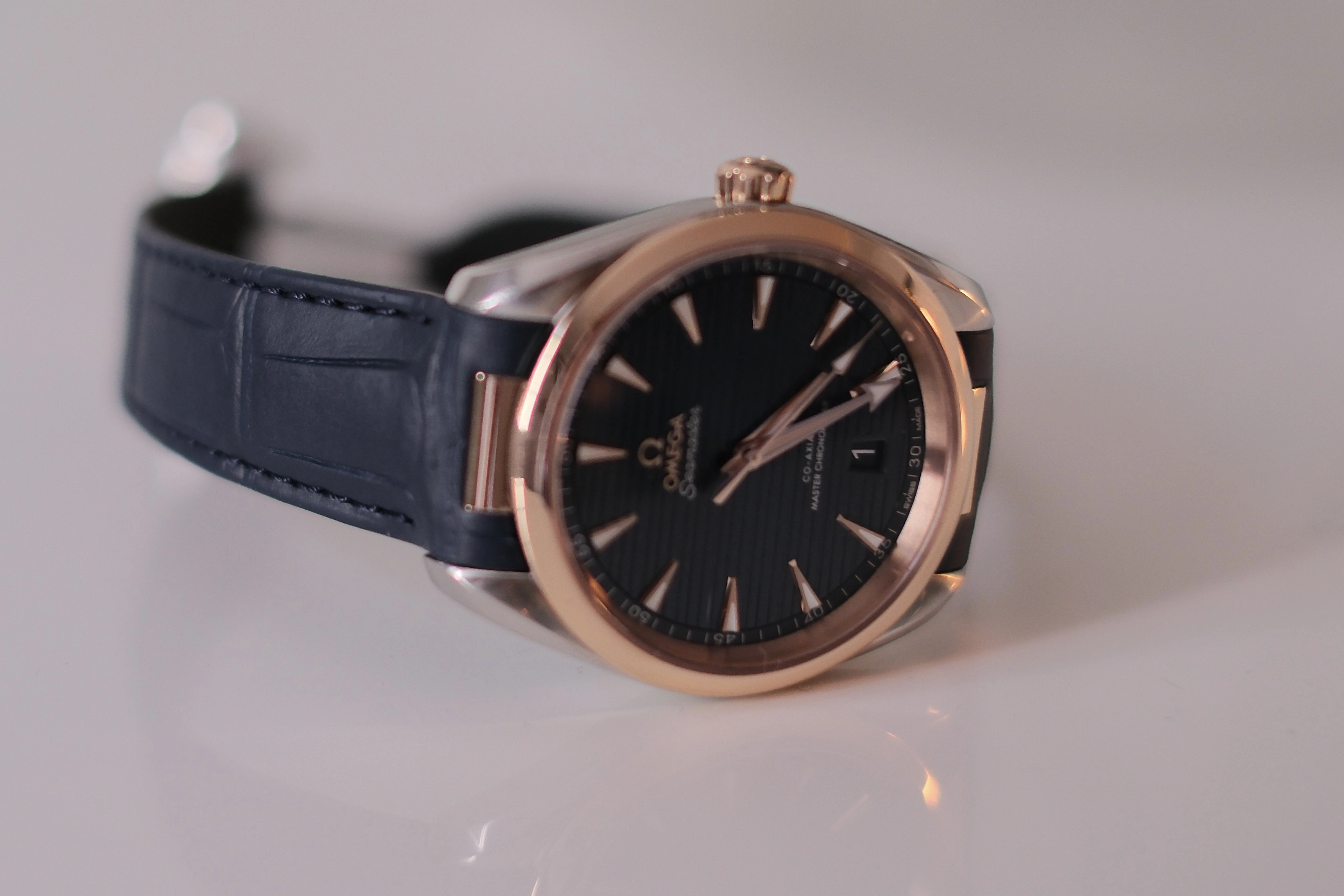 ·I have now completed my enhancements on my 38 mm Sedna/Steel Aqua Terra ref 220.23.38.20.03.001. I purchased the Sedna end links and the blue integrated leather strap that is available on the Omega Tokyo Olympics model but fits the 38mm models. I also have the rubber strap for swimming. I thought I would share. All sorts of cool combinations you can put together with the Aqua Terra if you dig through the Omega catalogue! I hope Omega makes some more versions of this integrated leather strap some day—would love it in black. Cheers.