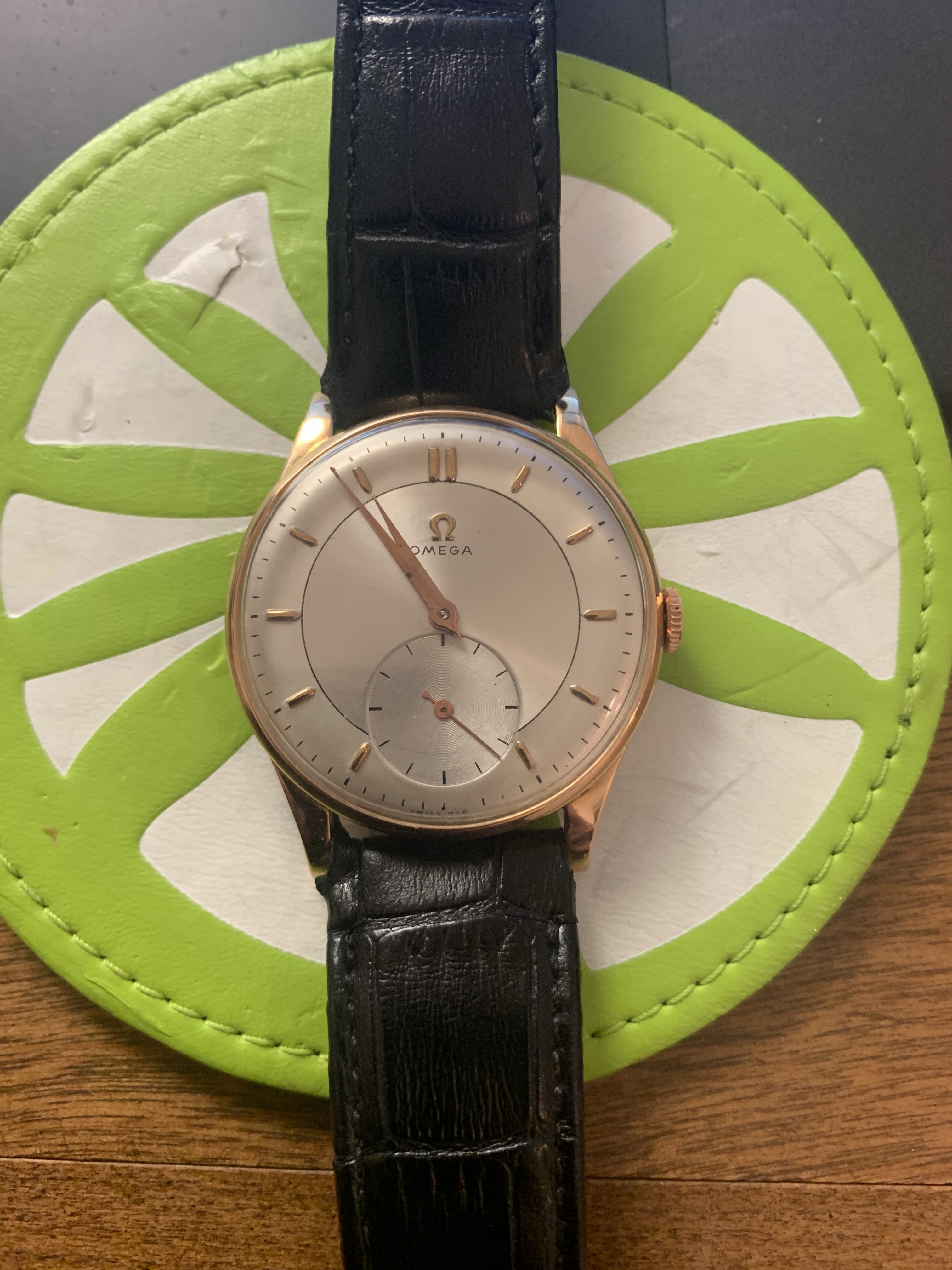 1. ~ 1944 18K rose gold, manual wind, two-tone silver dial with large sub second hand, raised rose gold markers and rose gold hands. The case is 37 x 43 x 9.5 mm (case w/o crown, lug to lug, and thickness. Movement 30T2, 15 jewels.