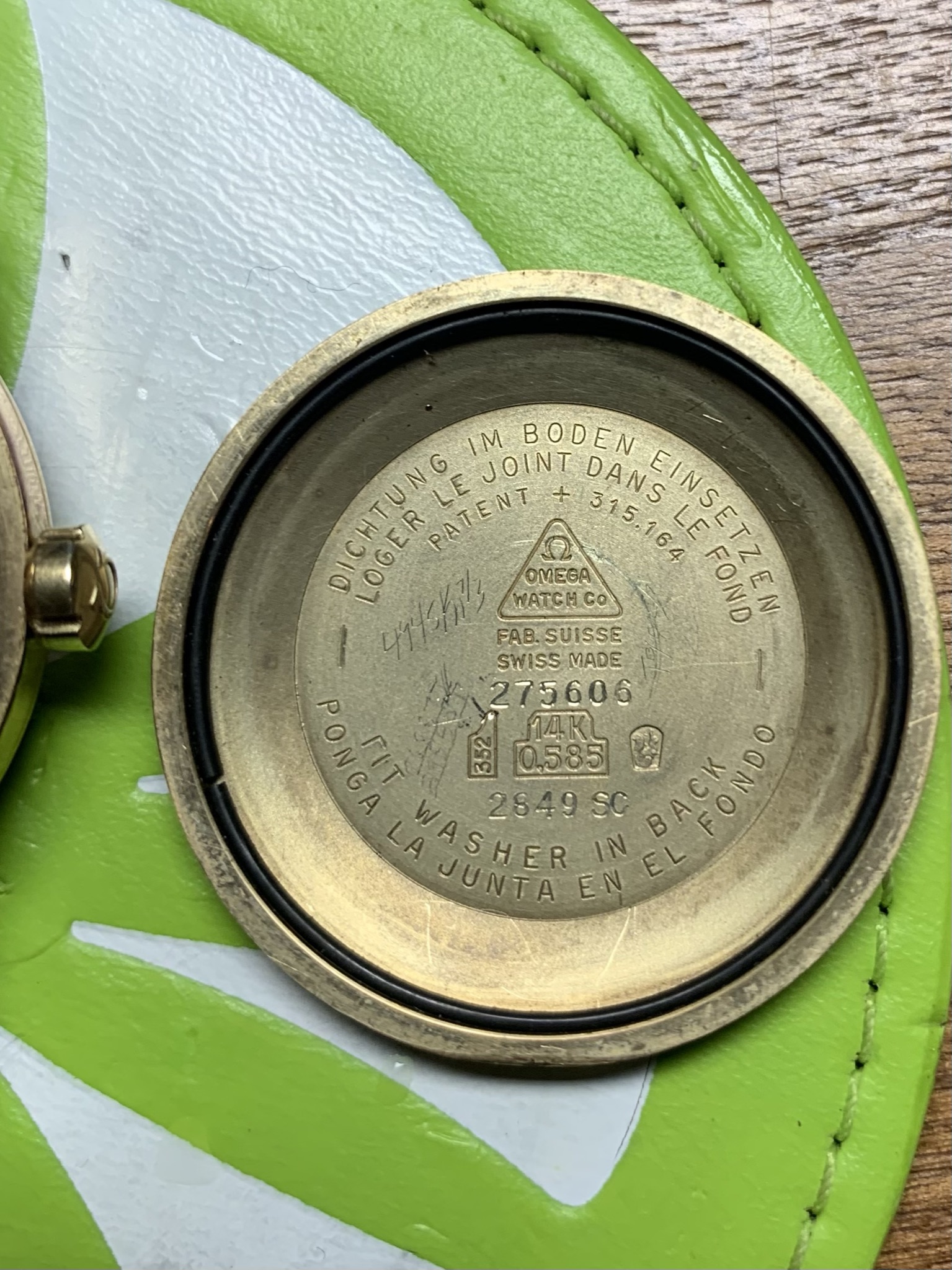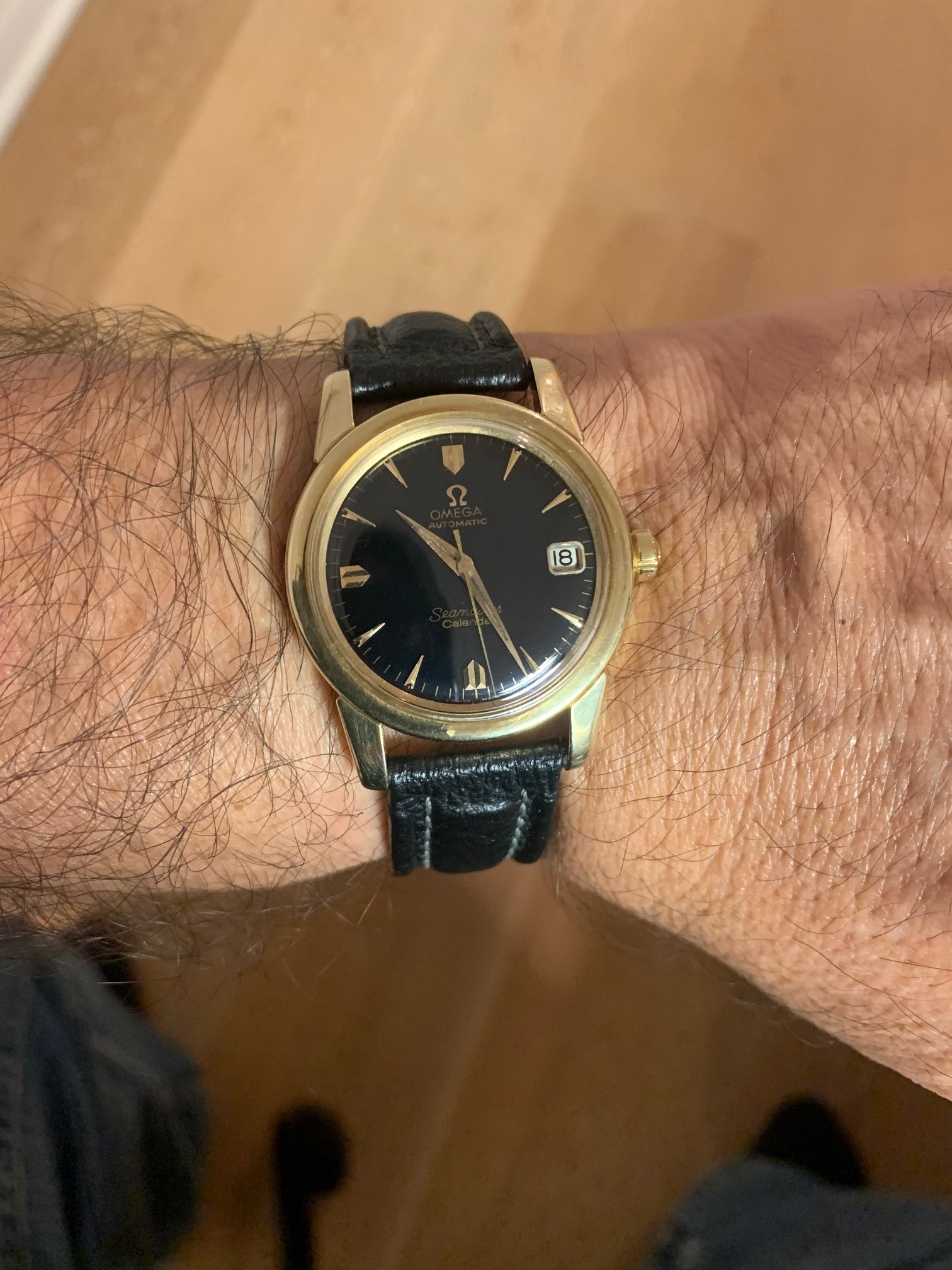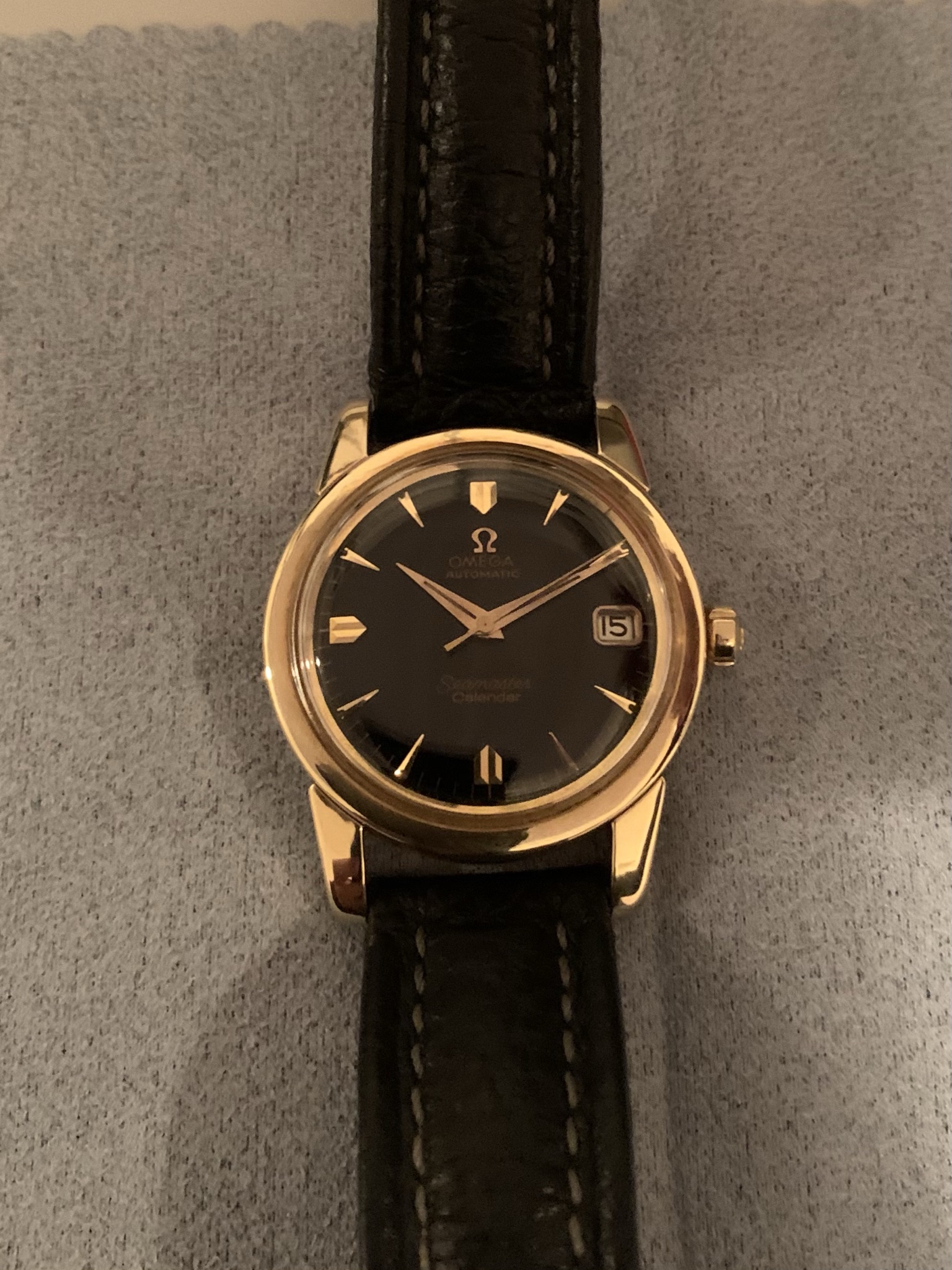 2. ~ 1958 14K gold Seamaster Date with black dial. Case is 34 x 42 x 12 mm. I have the original receipt on this watch, bought in Wiesbaden, Germany on November 14, 1958. I also have the signed guarantee card and manual. I had the original box but have lost it. Reference #2849 Cal. 503, 20 jewels. The movement s/n is the same as on the receipt - so original movement.