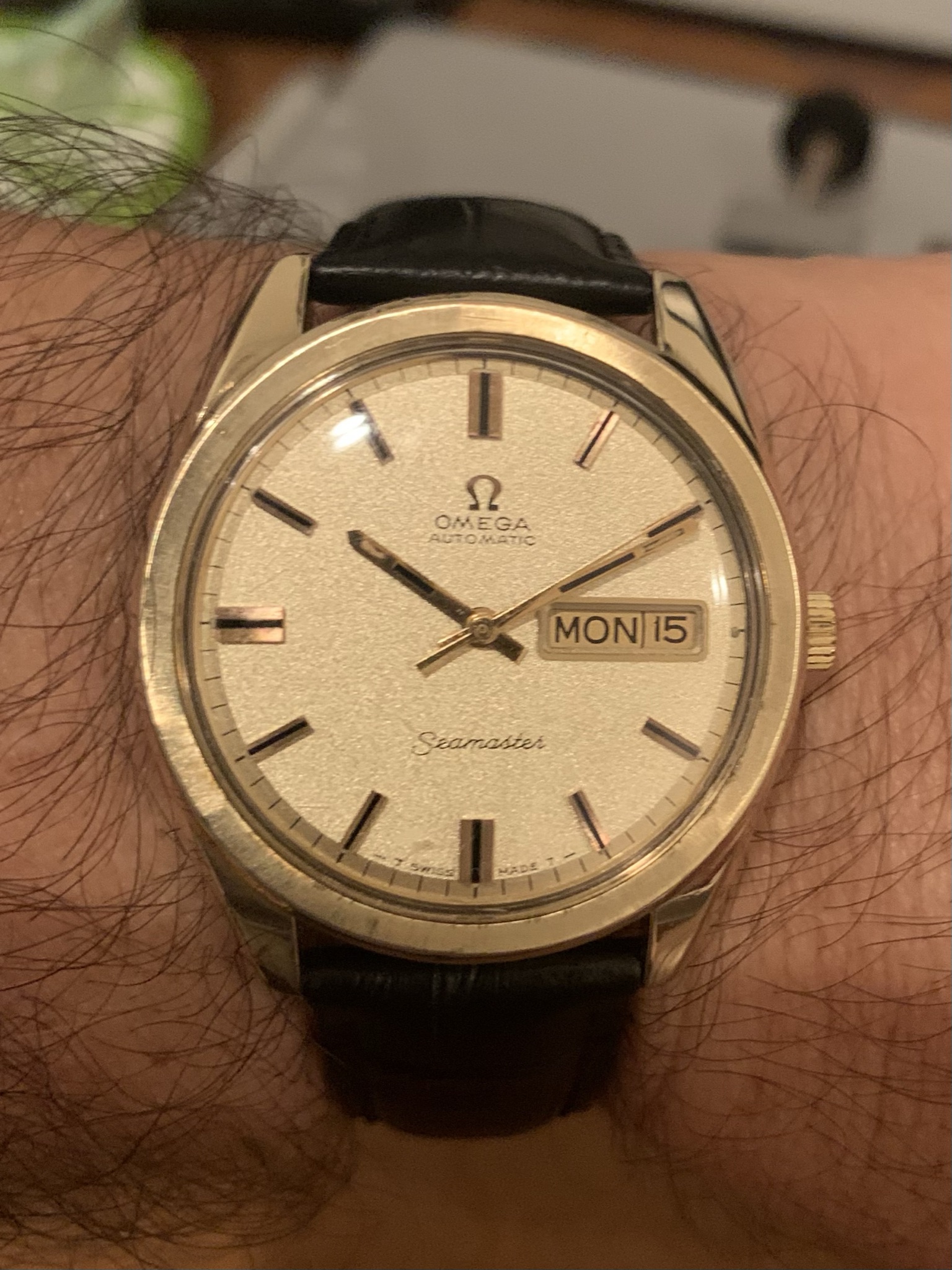 3. ~1969 14K gold cap Seamaster Day-Date with" sparkle dial". Case is 36 x 41.5 x 11.5mm. Movement is 750, and the inside of the back case is stamped 166.032.