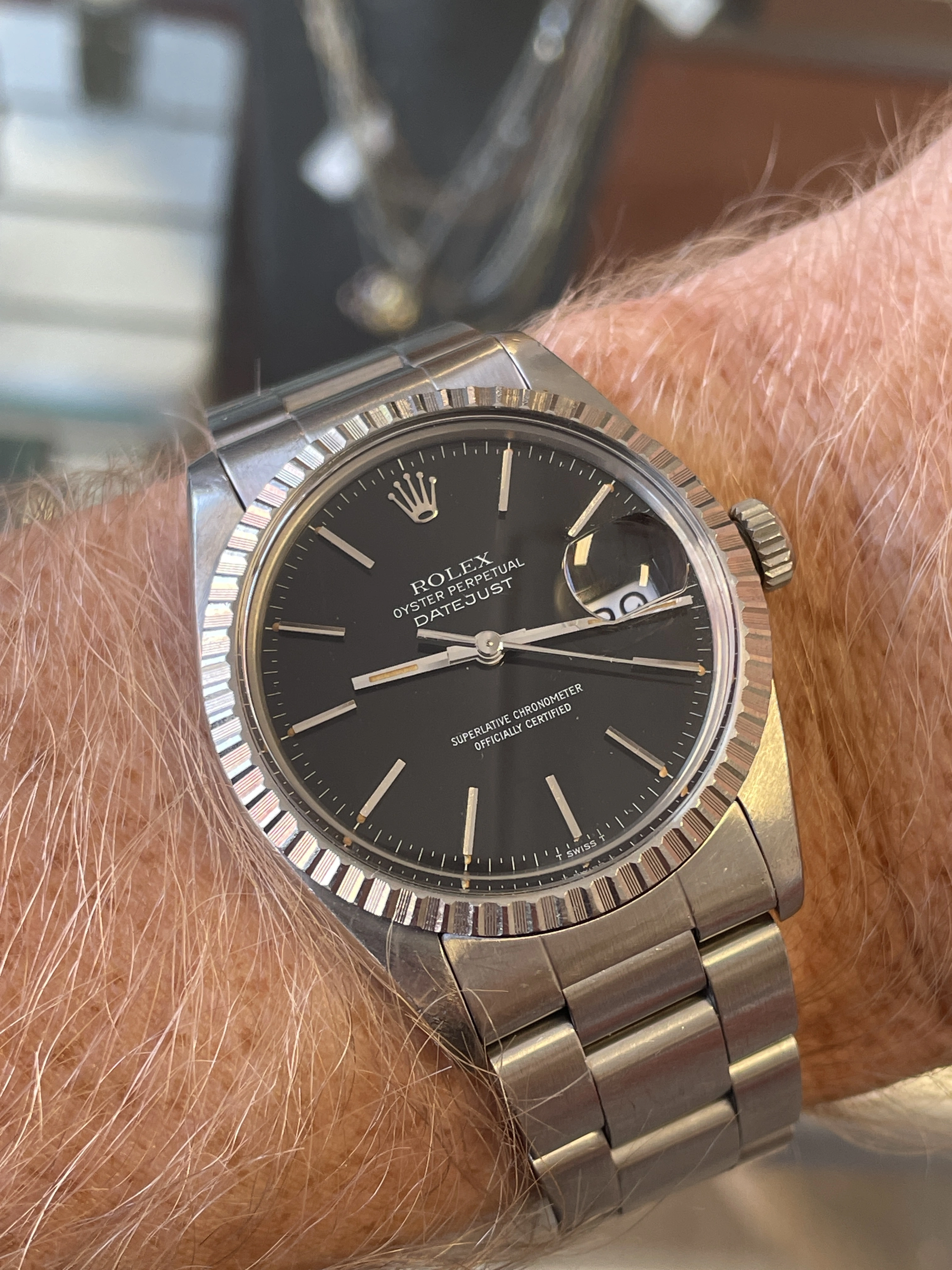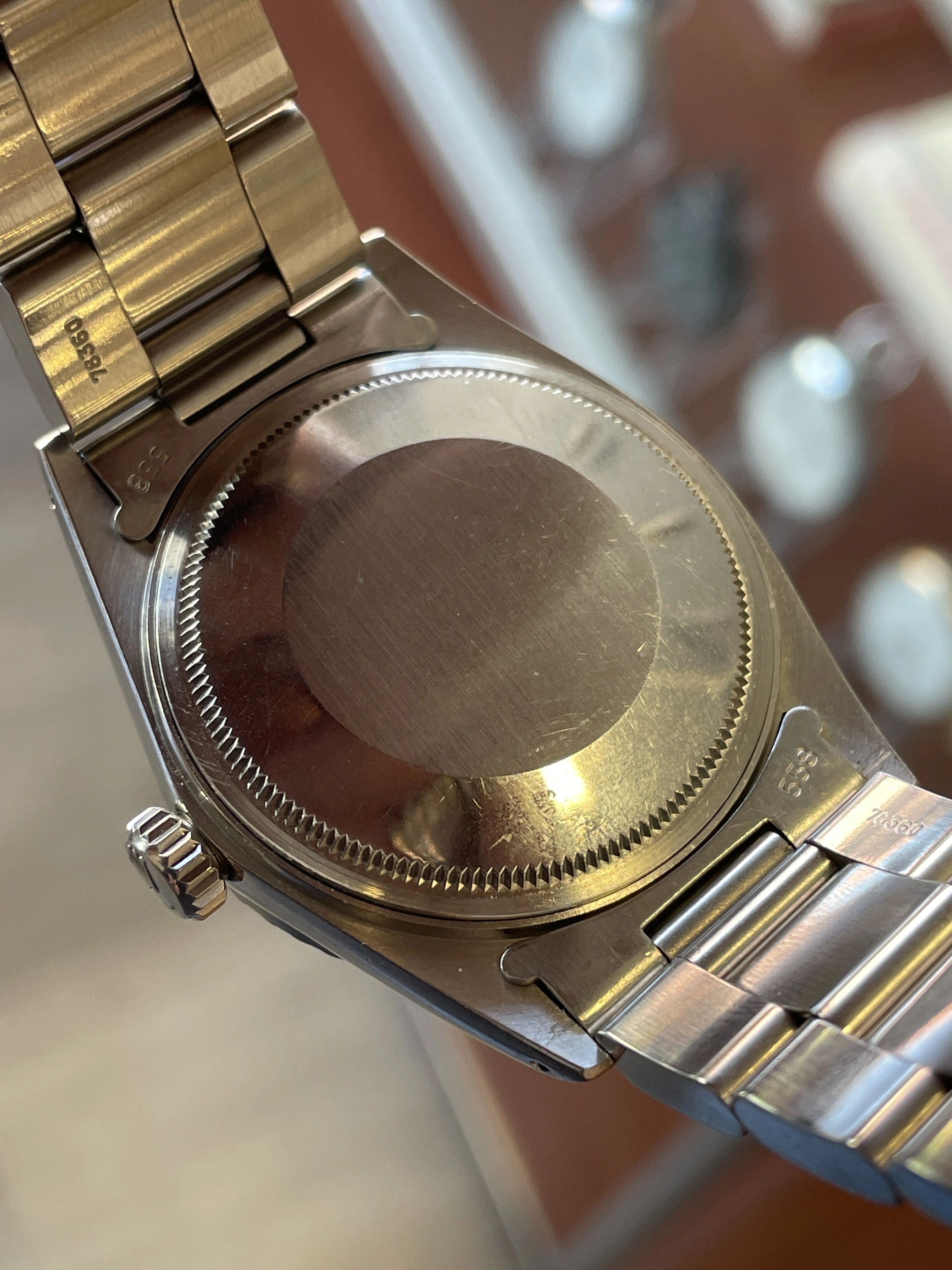- Somewhat uncommon 78360 oyster bracelet for this reference with “H” bracelet code appears original and 1983 production year matching to the 75XXXXX watch serial. Although I think it has seen a polish or rebrush.