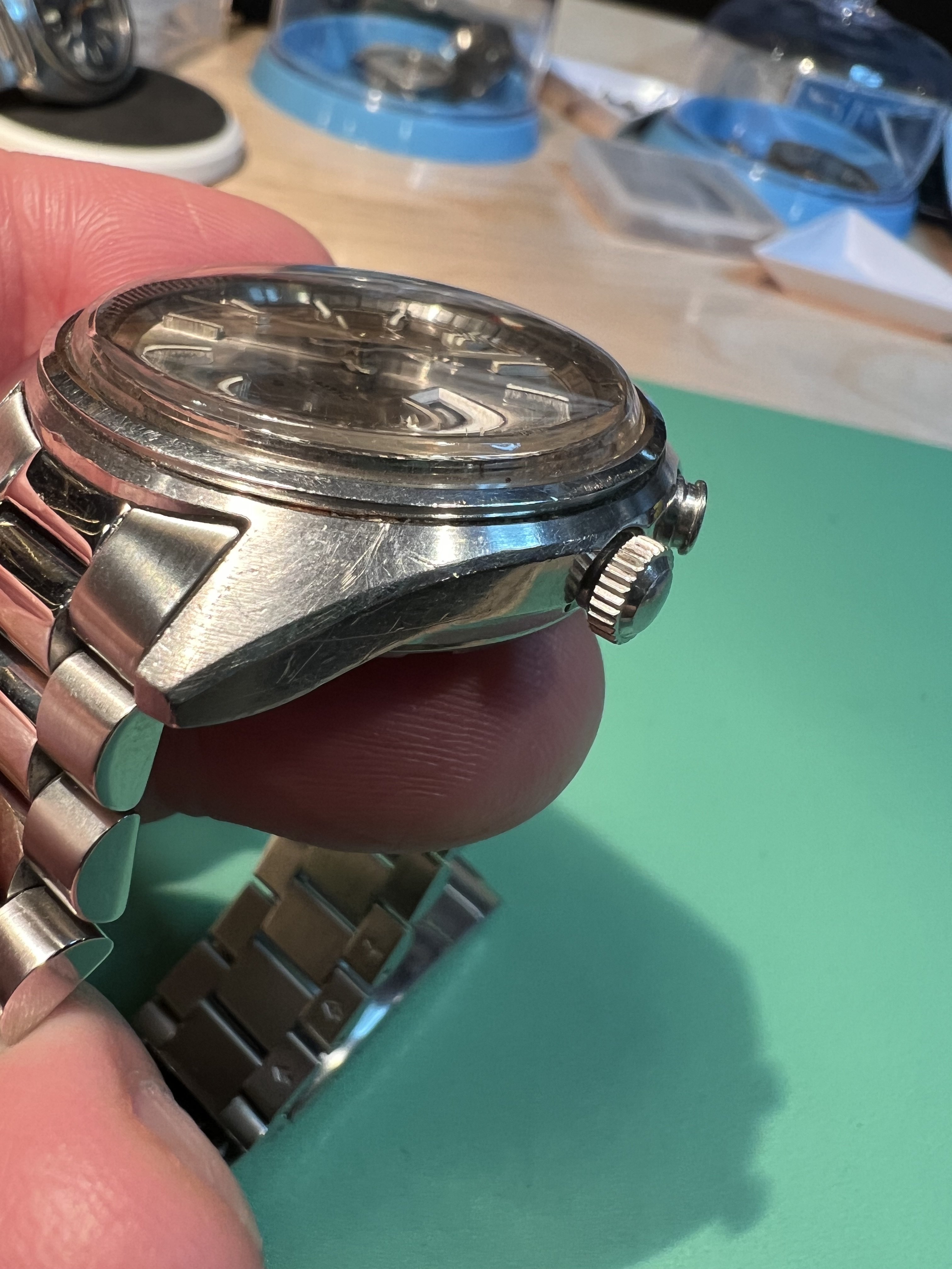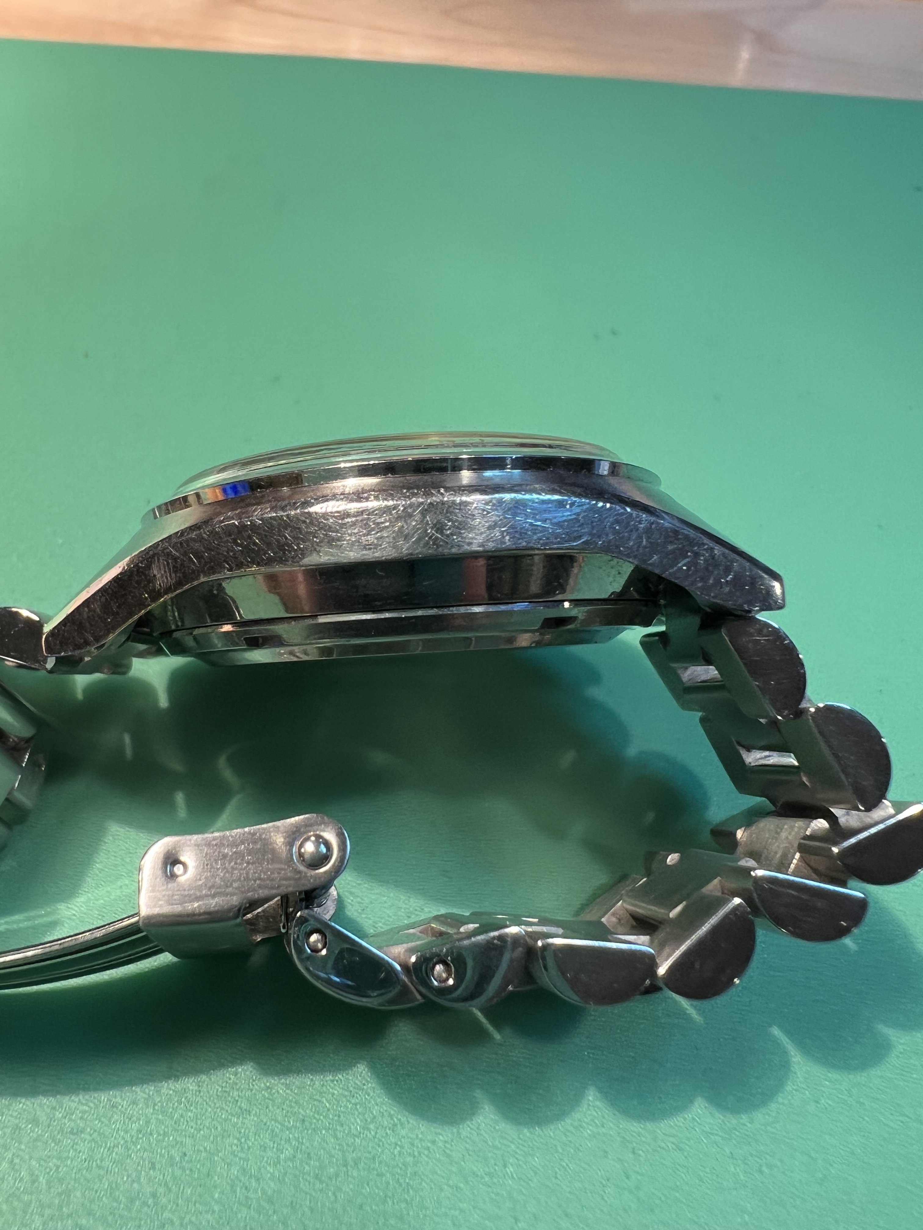 Stainless steel case with original factory case lines with some marks from wear, 39x40 mm, good with screwdown caseback.