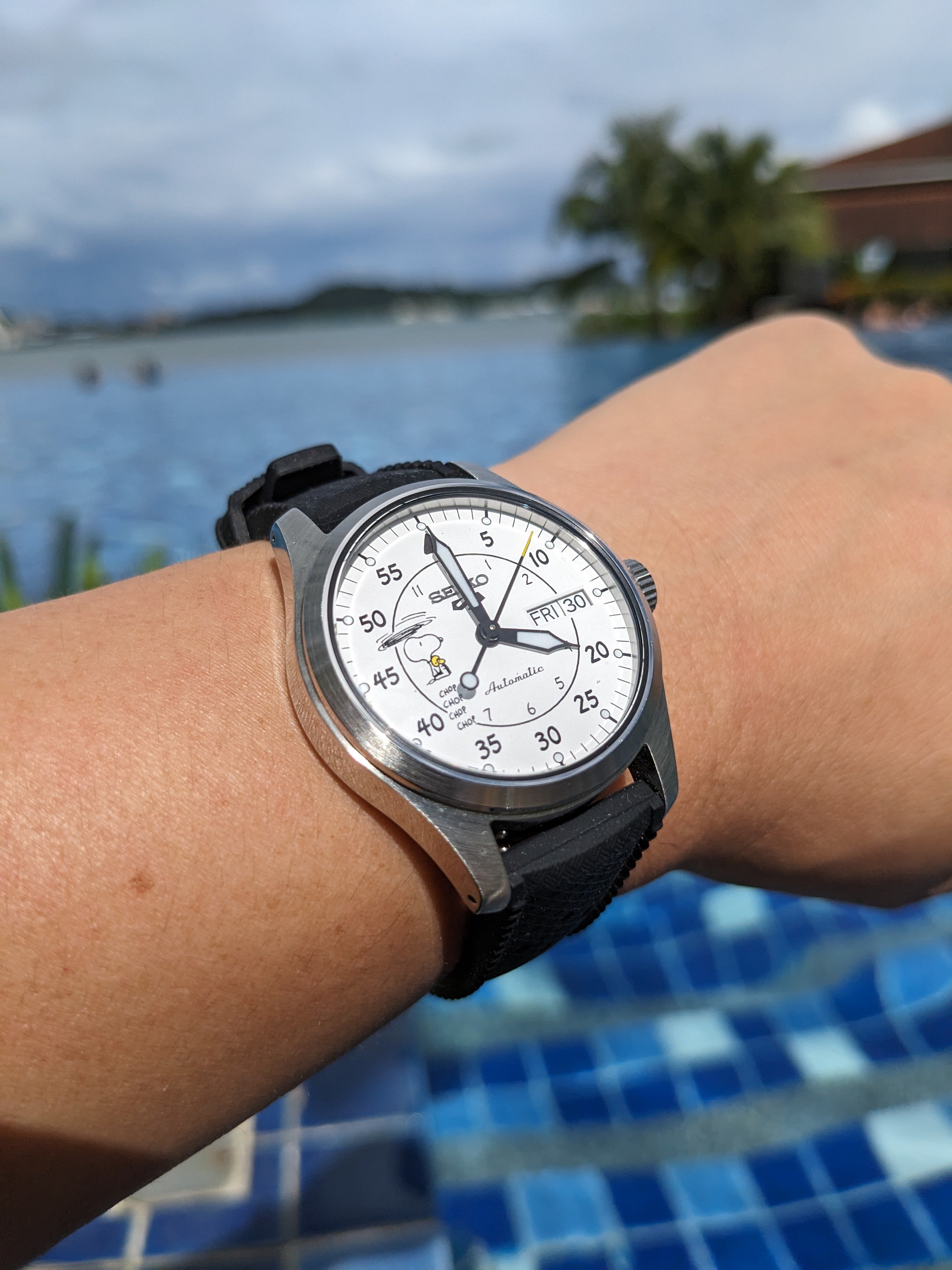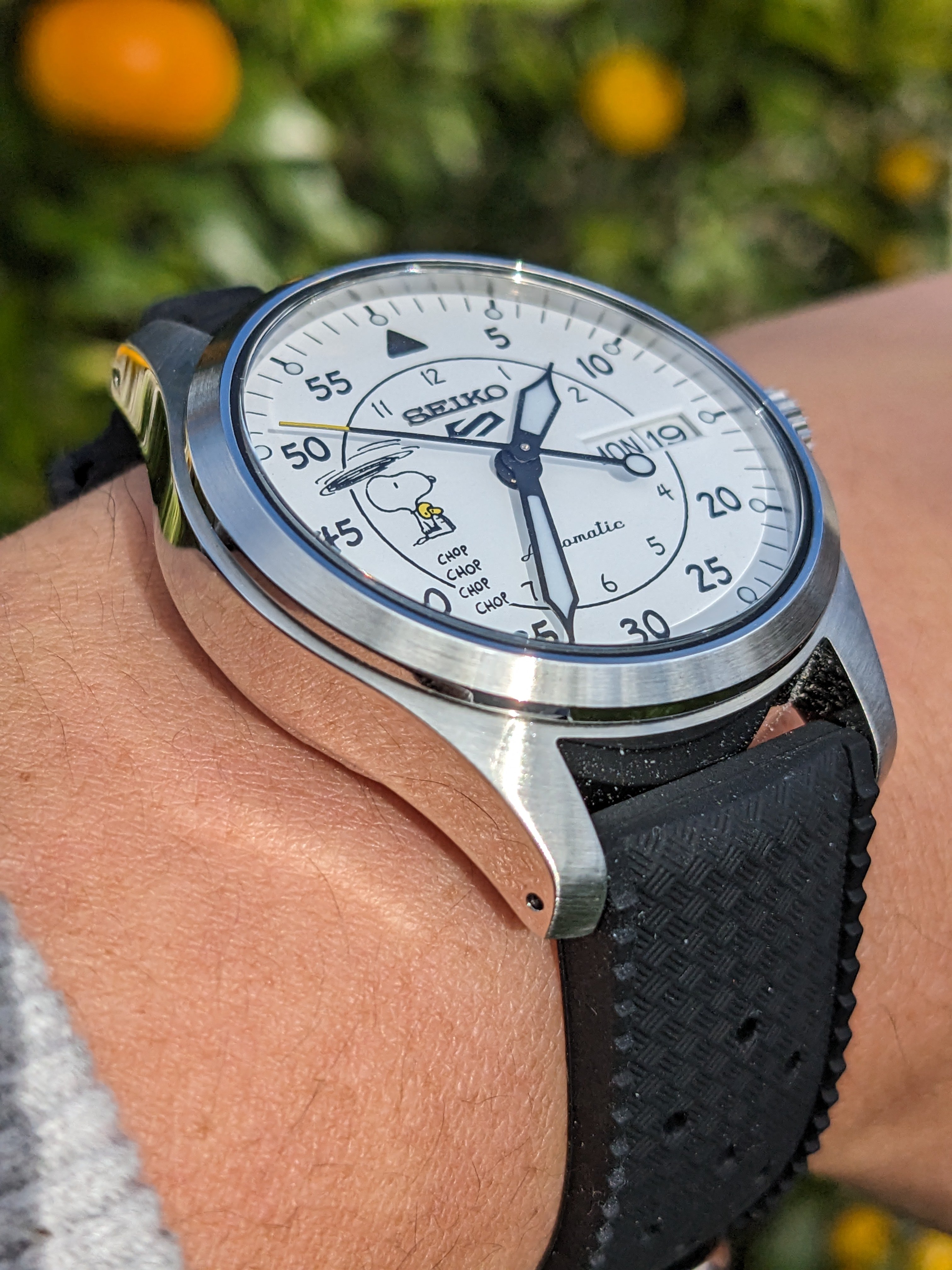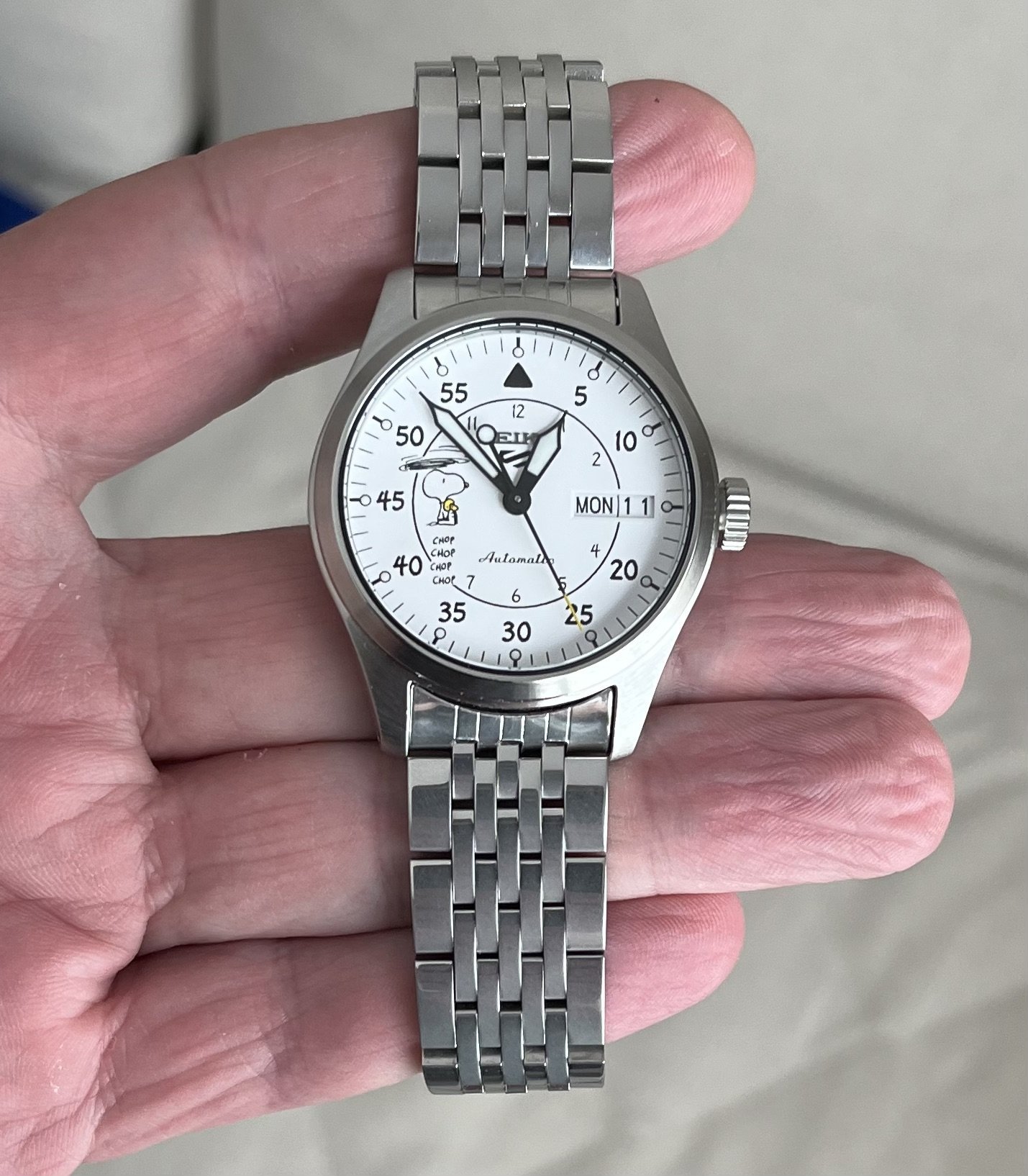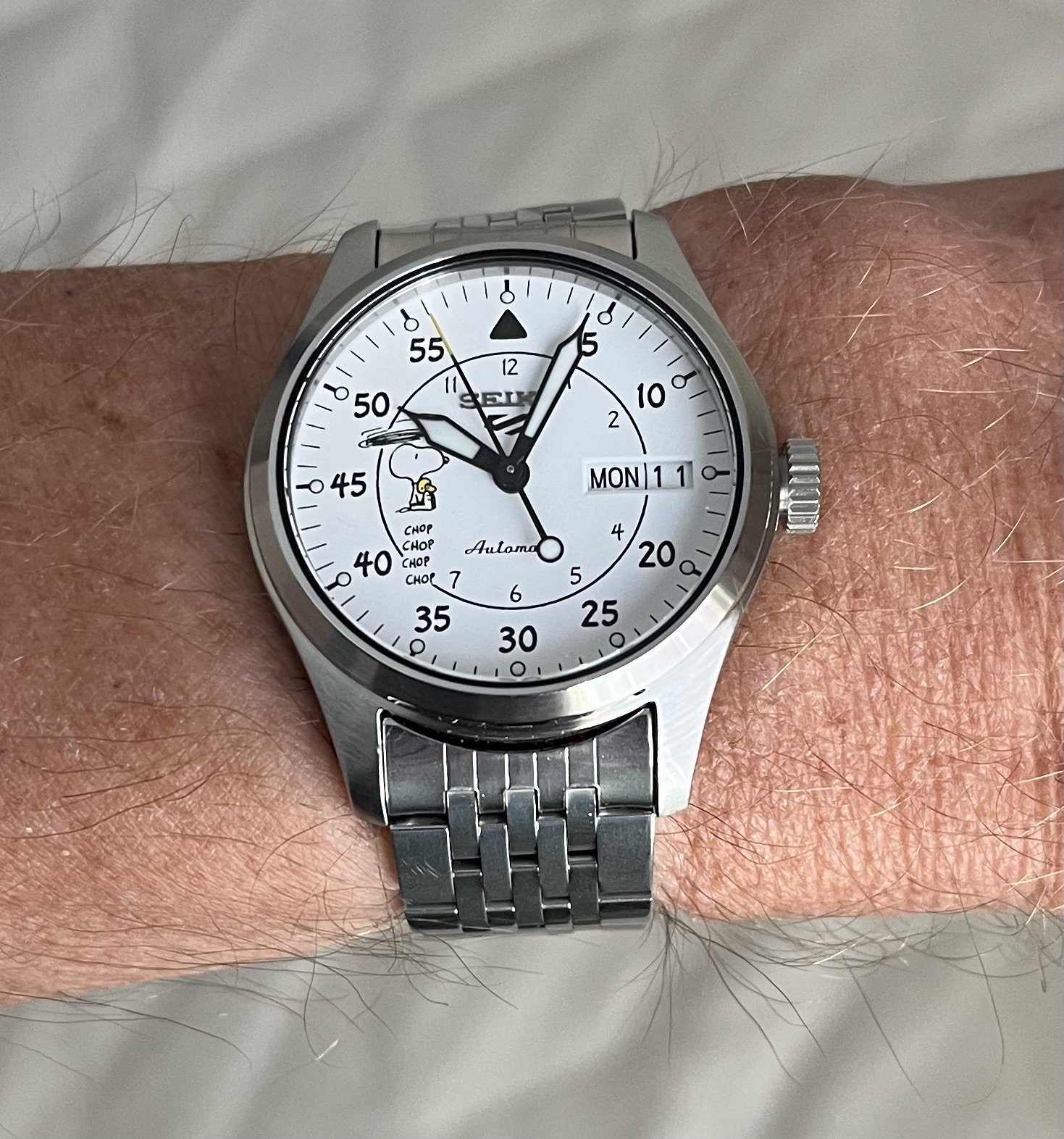 can order that bracelet from Seiko customer service at 1-800-722-4452. I don't know the part number, but they can look it up given the reference. I was quoted a price of more than $100. Seiko bracelets, at least for the Seiko 5 line, don't seem to have a very good reputation (I've never seen one in person), so that seems rather excessive. Also, that OEM bracelet is a three-link oyster style, and I really wanted an Engineer's style bracelet. As you noted, it has a bit more of a vintage aura which I like, but it also seems to pair very well with pilot watches, as