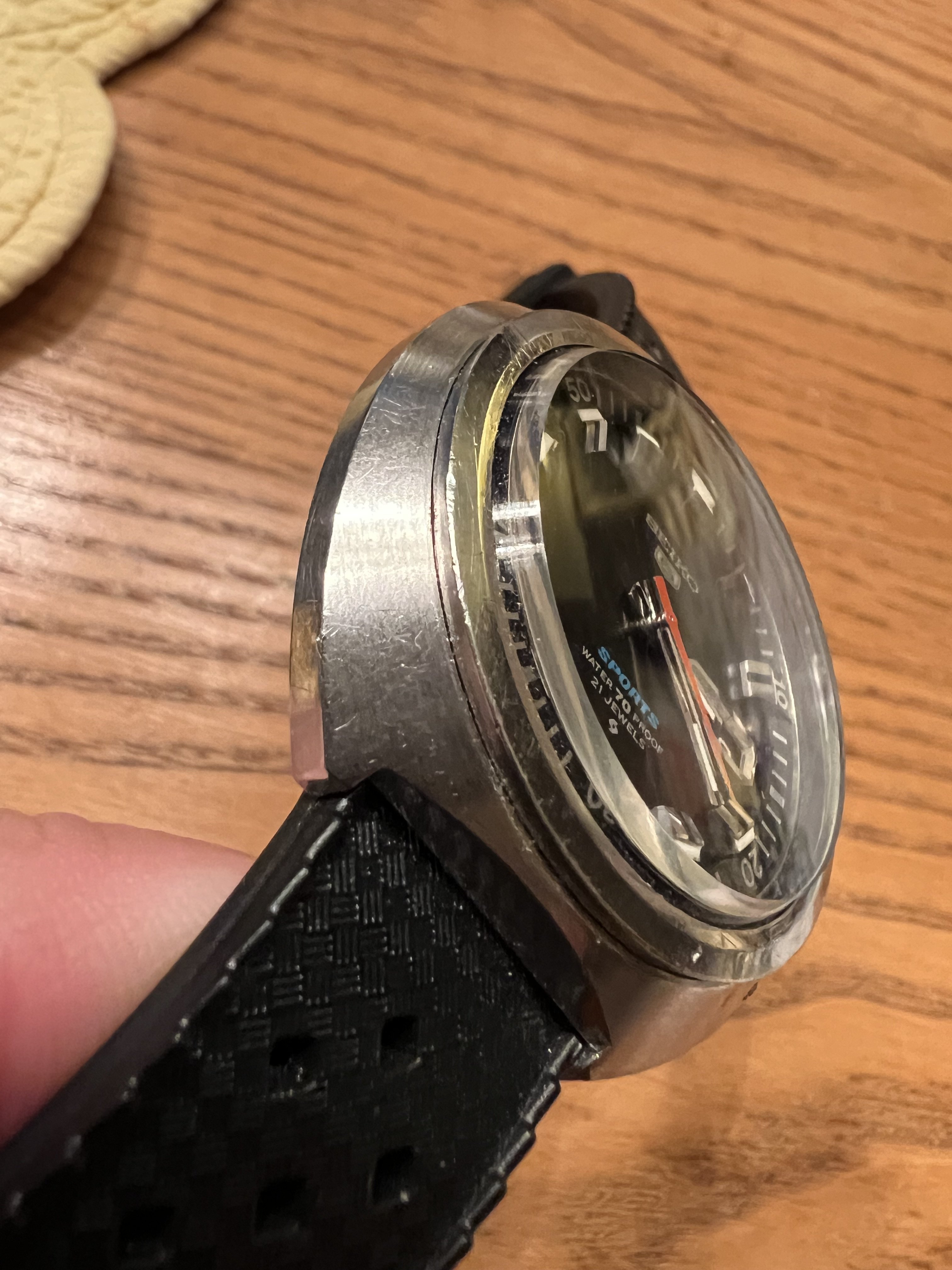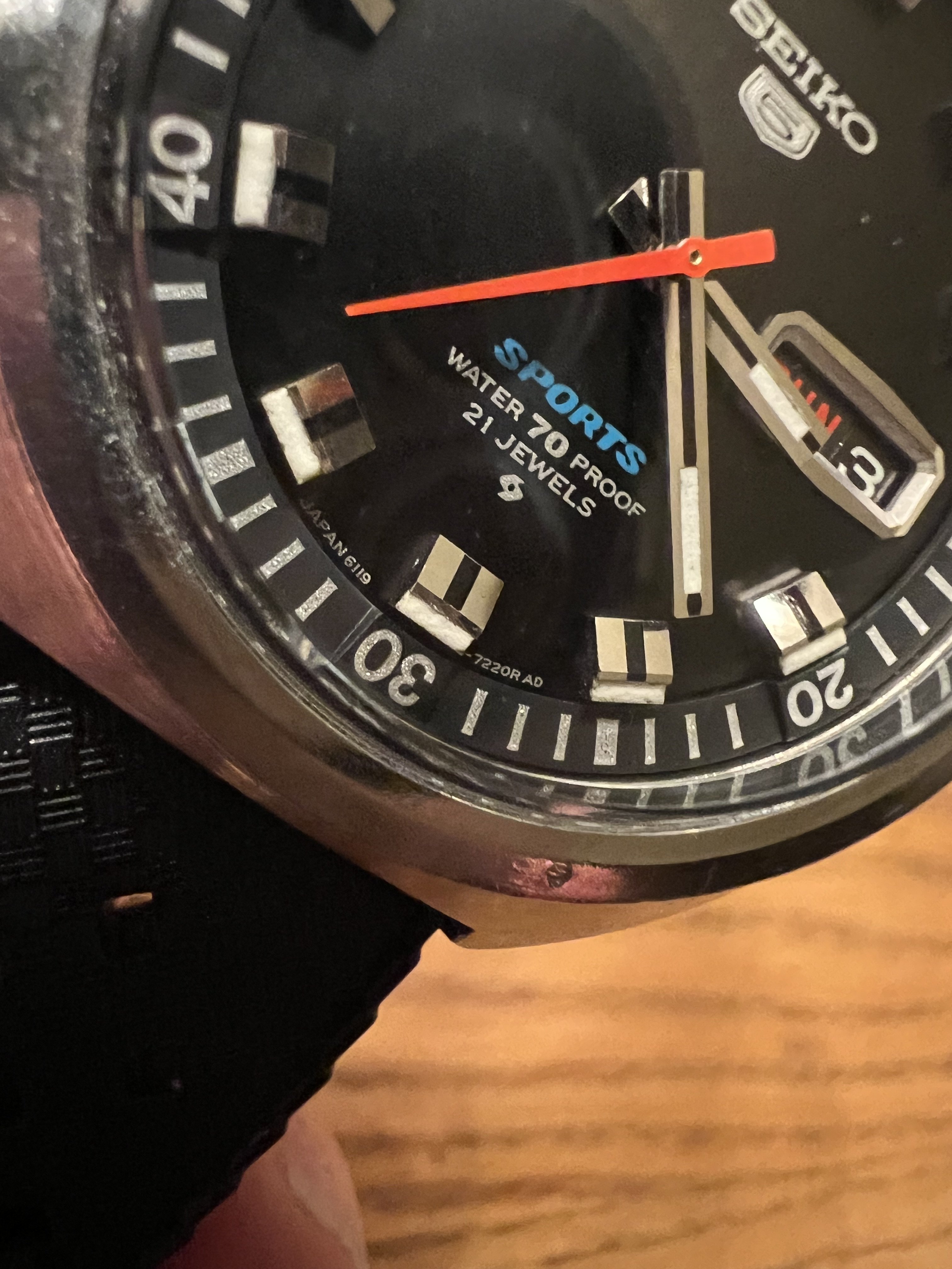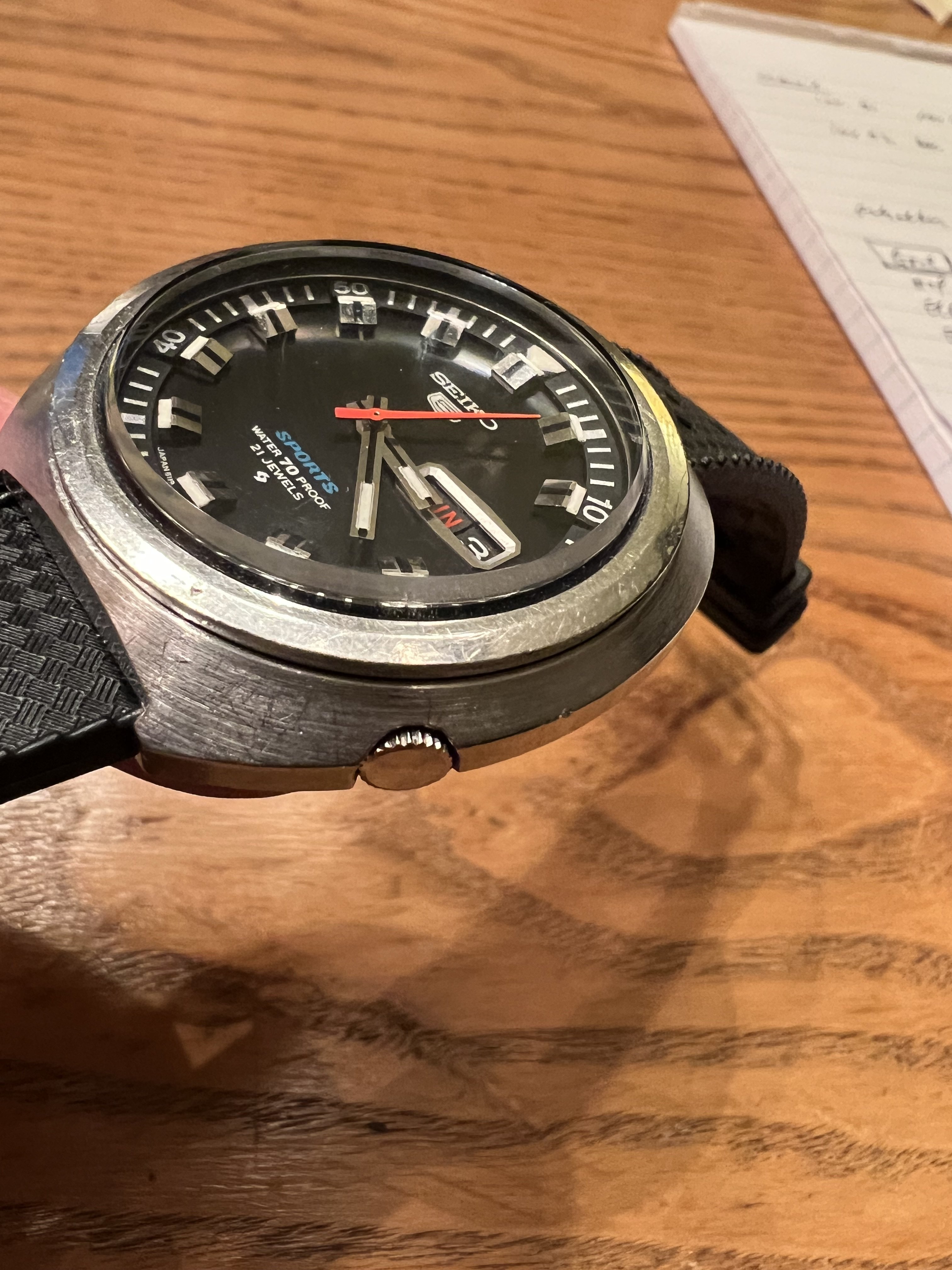 DIAL: Matte black in flawless condition, with large polished steel monument indices. Seiko 5 badge beneath SEIKO at top, SPORTS (in blue), Water70Proof, 21 Jewels and Suwa logo are all crisp and clear. Day/Date window 3:00 with polished steel frame.