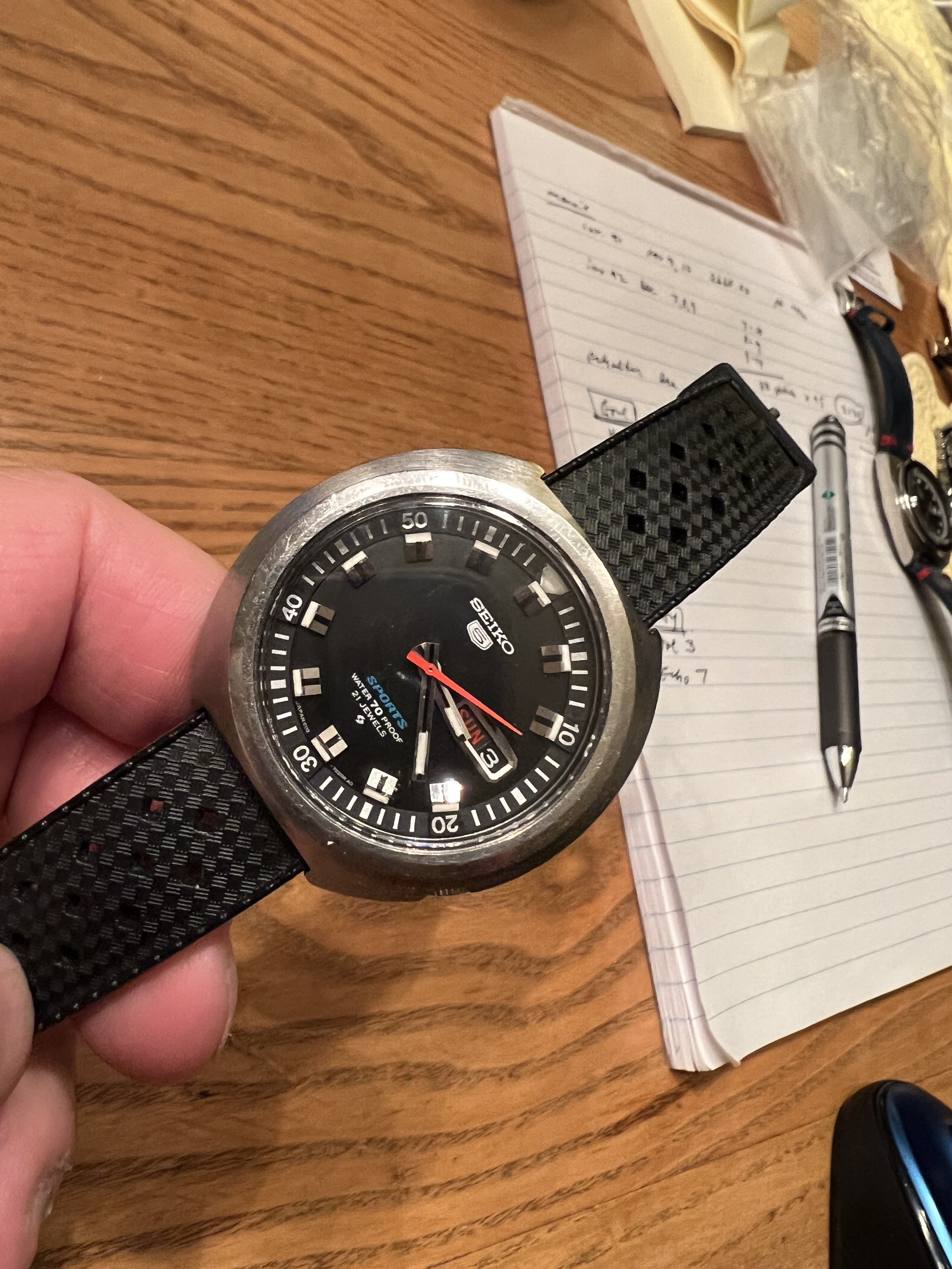 Overall an excellent example of a nice Seiko 5 Sports 70 m Sports Diver from 1969, recently serviced and purchased from by a well known top Seiko watchmaker/dealer.