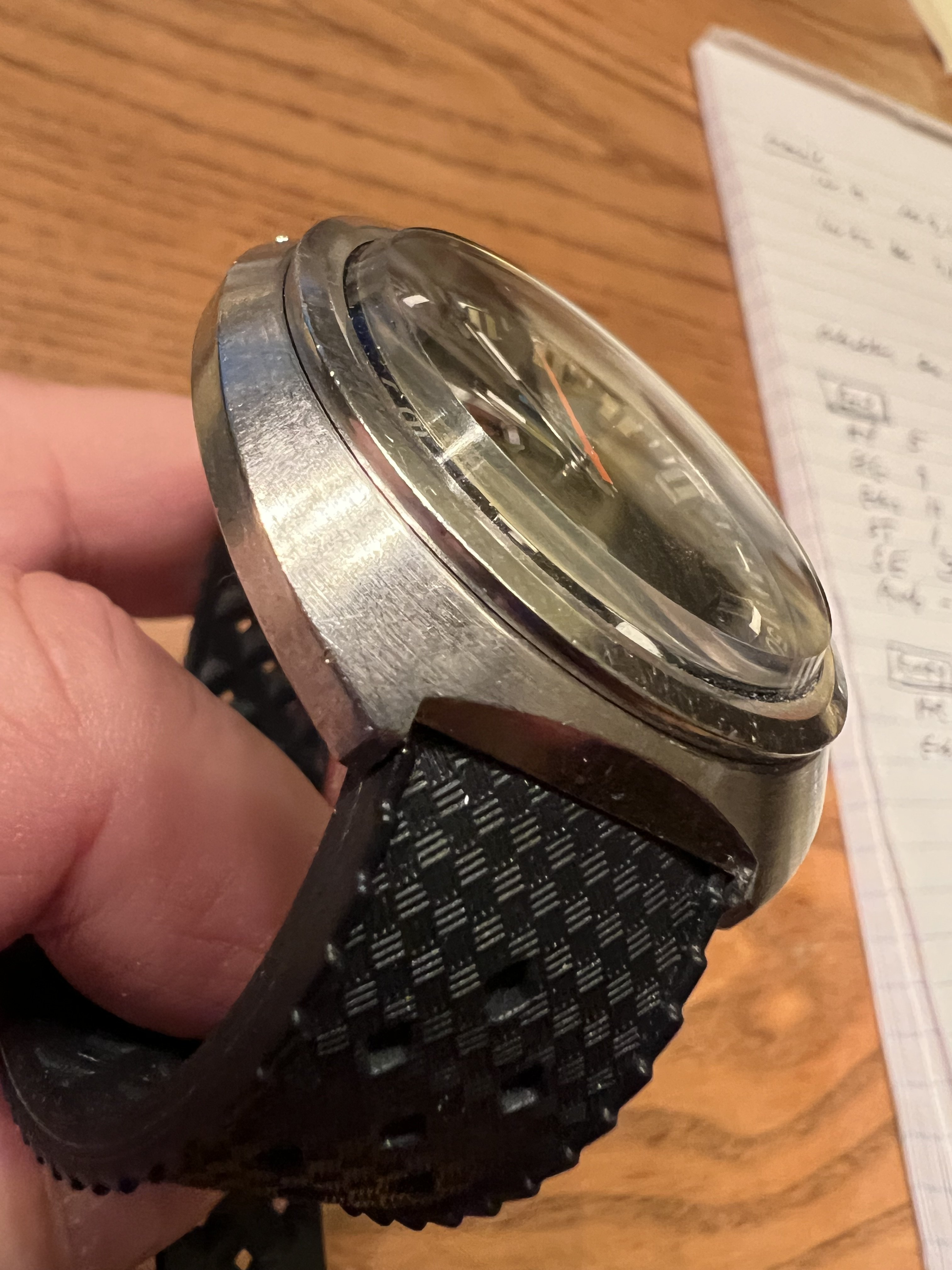 BEZEL: Interior rotating “count up” bezel with 10 min markers, clean writing, rotates freely in both directions as it should. Large lume pip at zero.