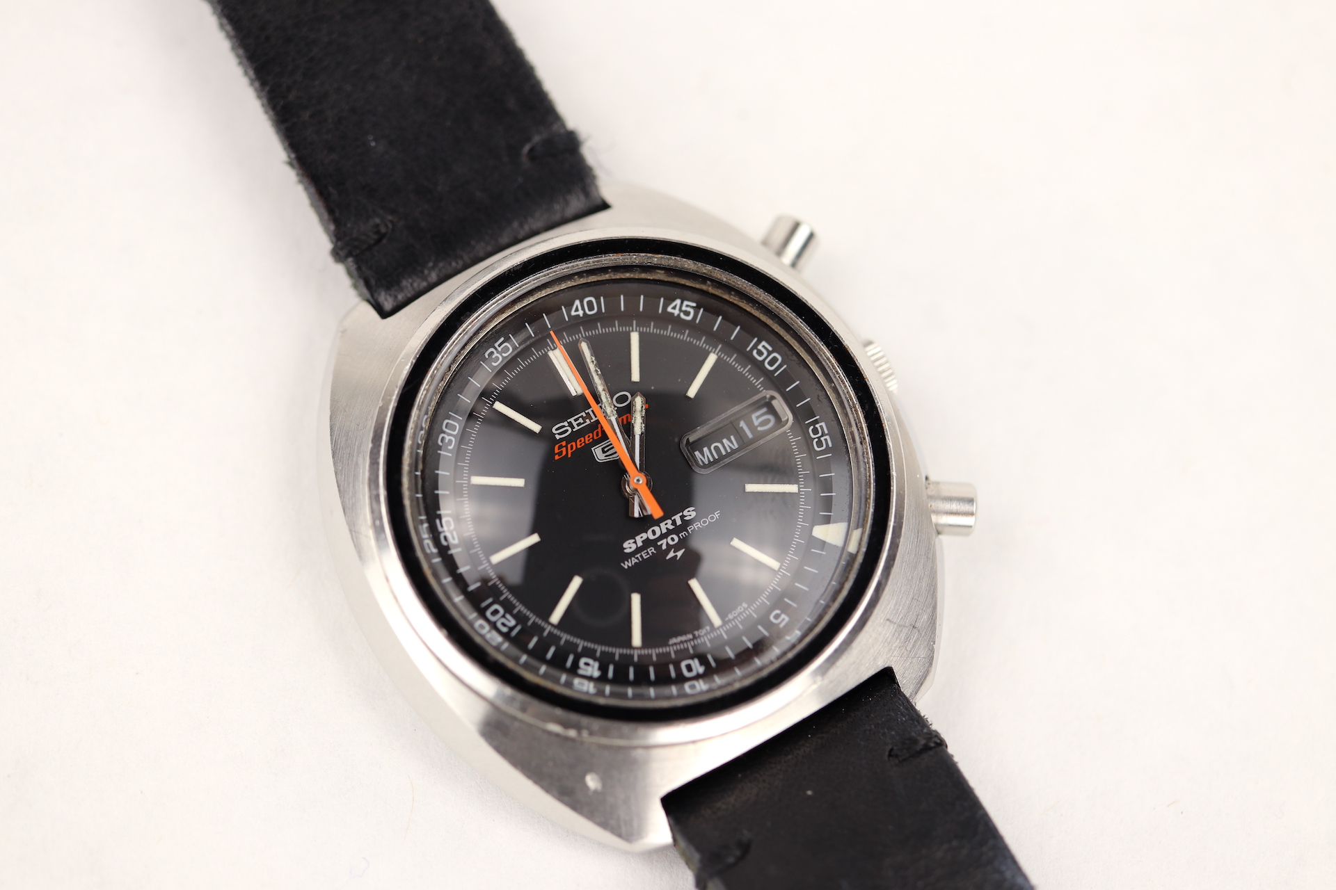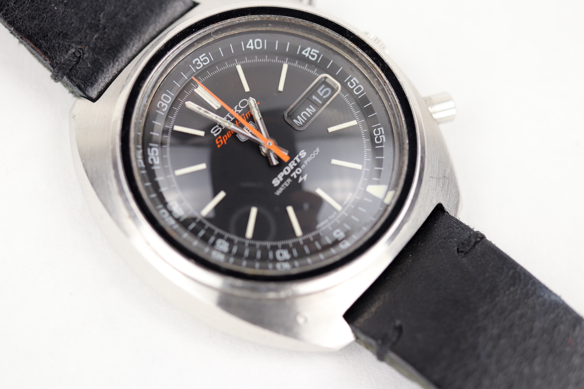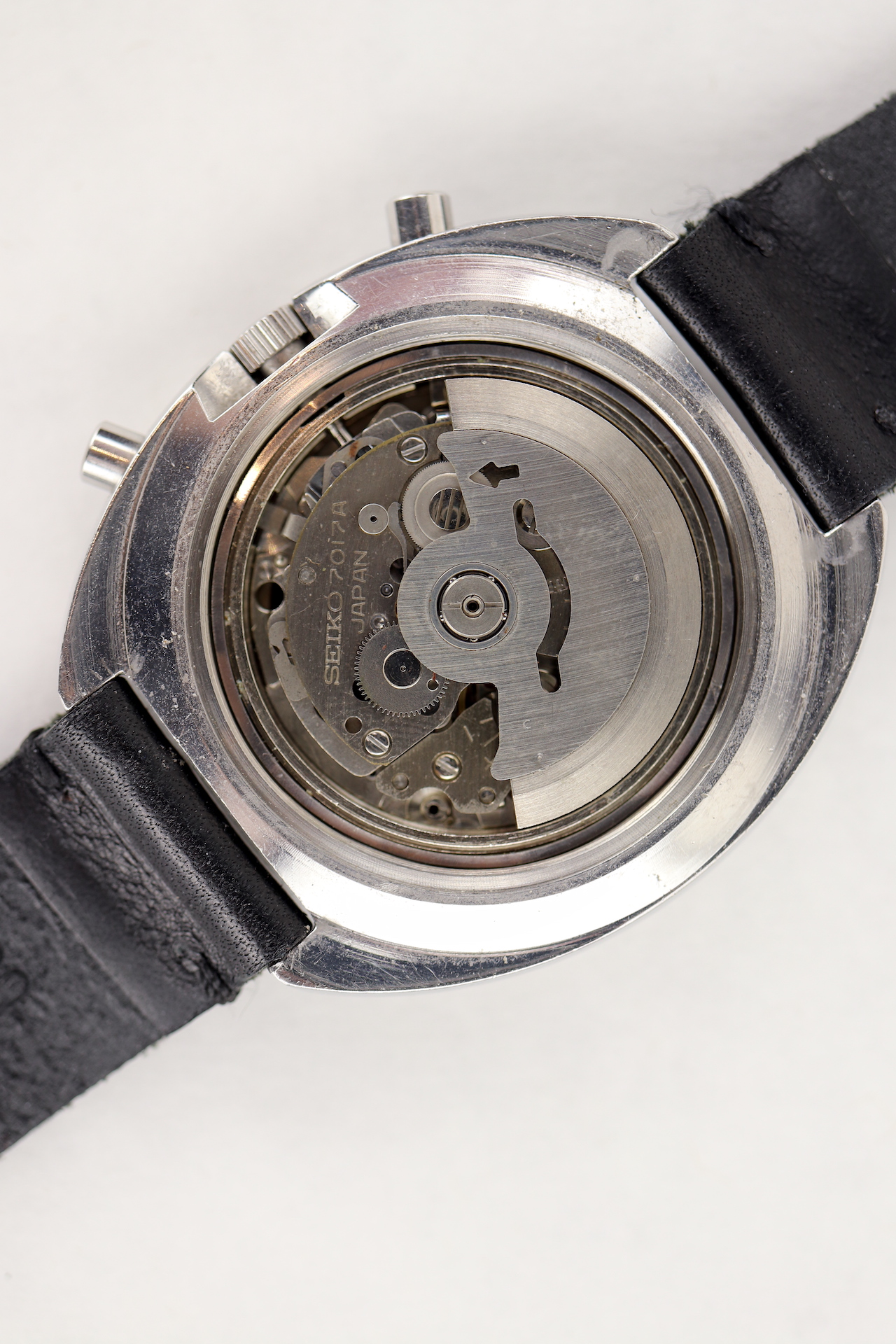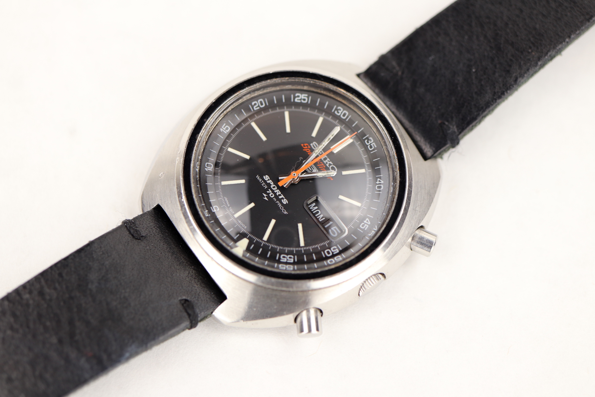 ·For sale, I have a Seiko 5 Sports Speedtimer 7017-6010 Chronograph Automatic. It has the Caliber 7017 which is an automatic movement. Watch has not been serviced while in my possession. It does work and keep time. Case measures 43mm. The watch comes on a leather strap.