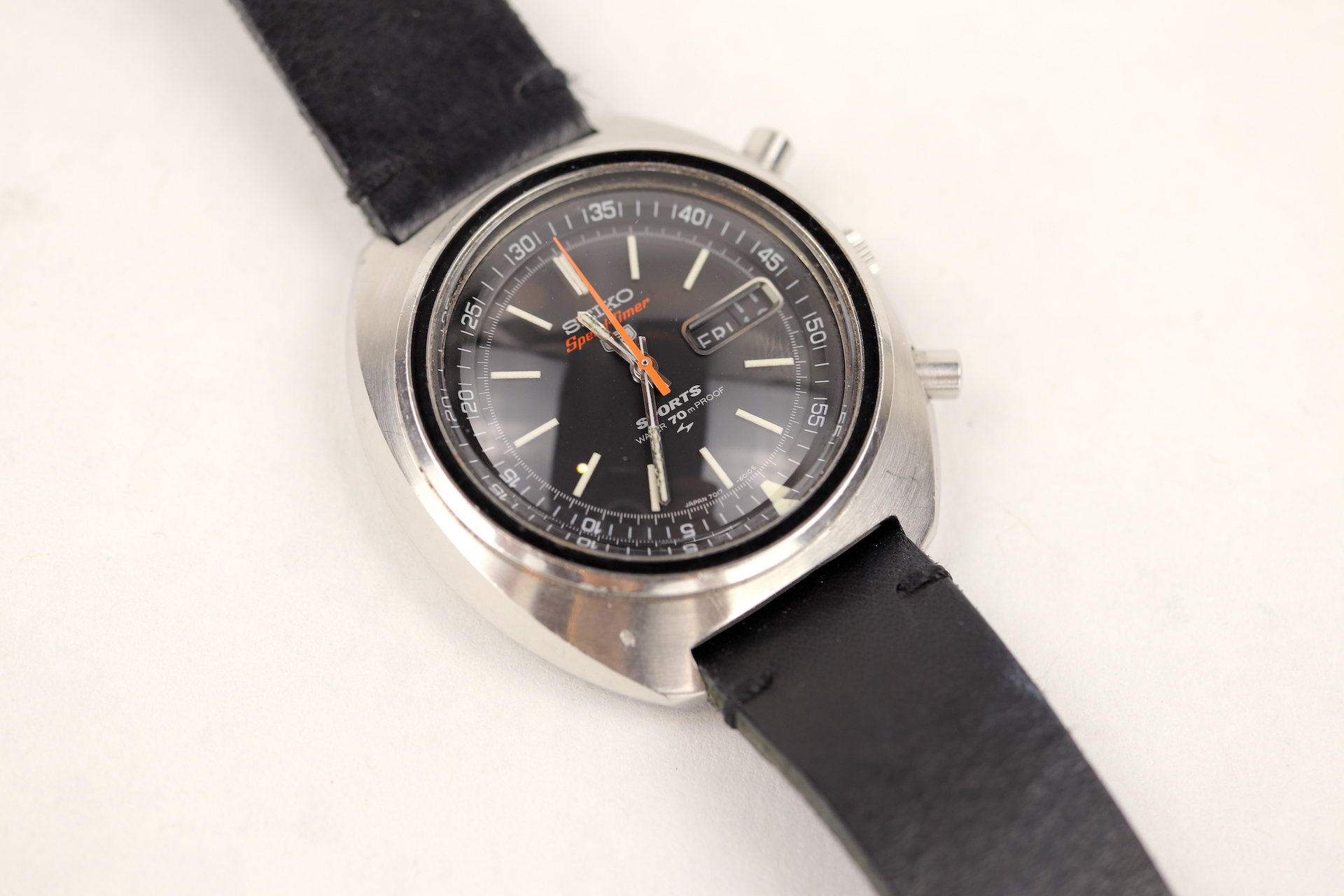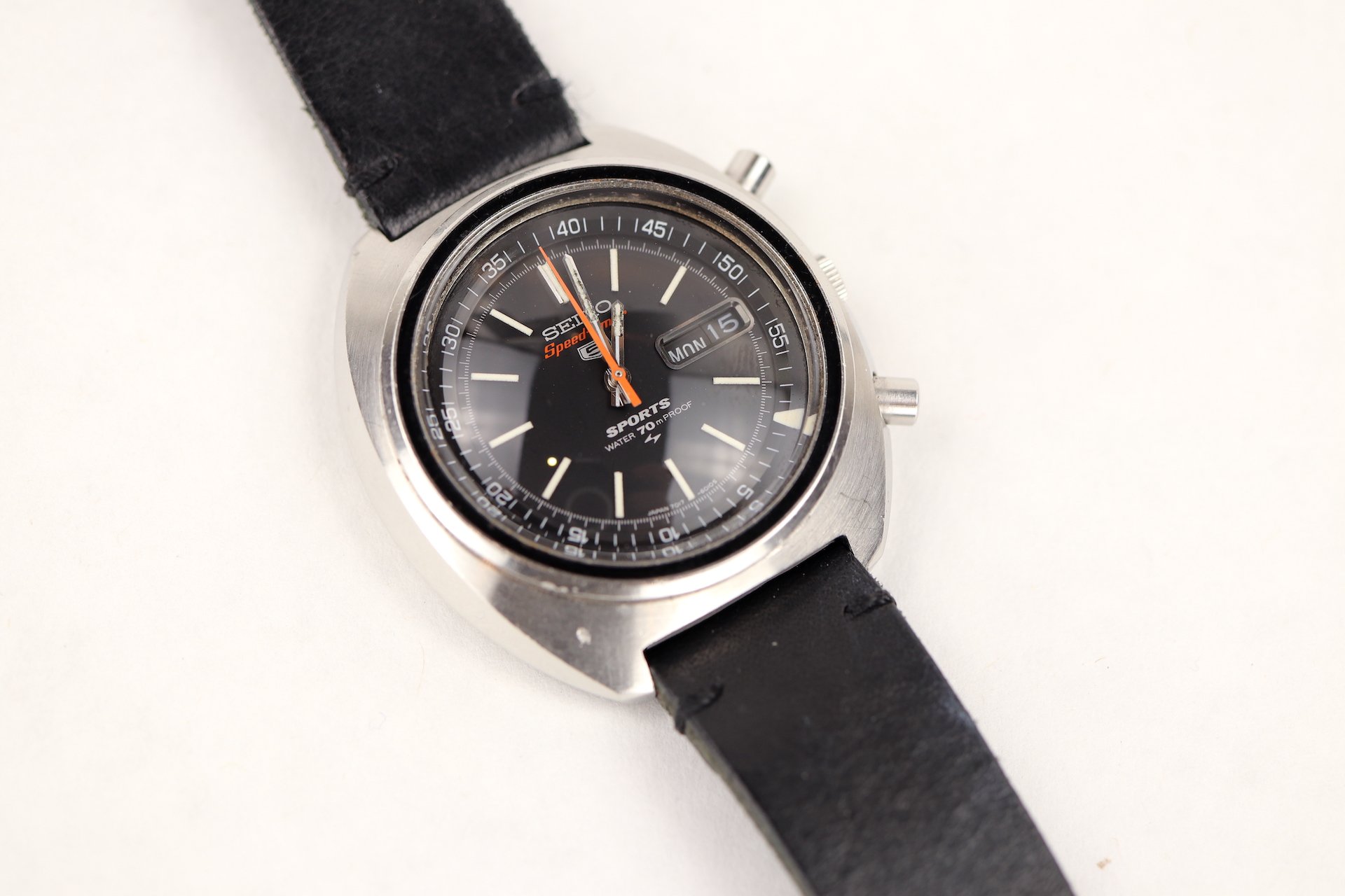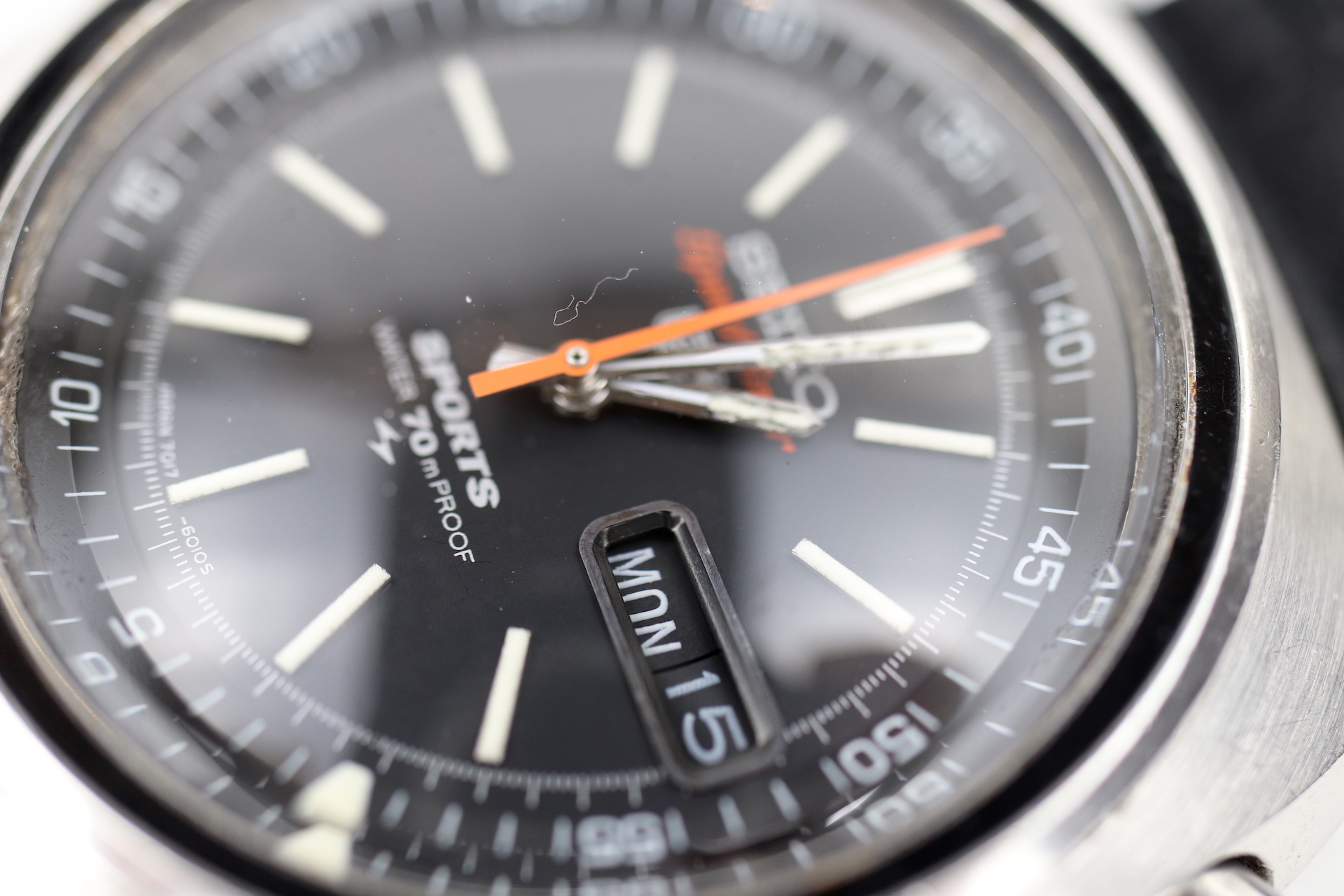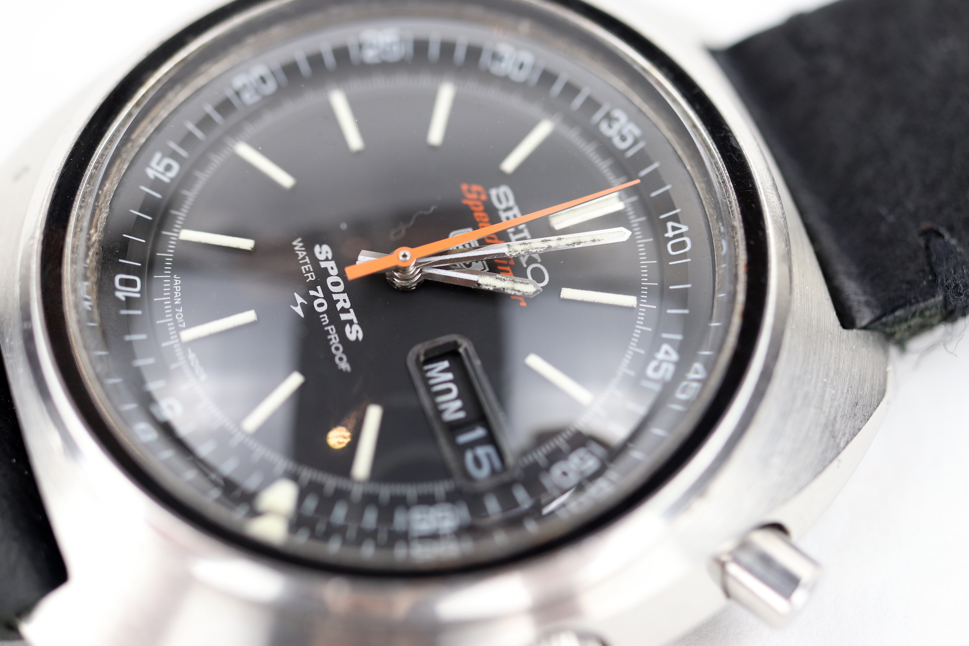 ·For sale, I have a Seiko 5 Sports Speedtimer 7017-6010 Chronograph Automatic. It has the Caliber 7017 which is an automatic movement. Watch has not been serviced while in my possession. It does work and keep time. Case measures 43mm. The watch comes on a leather strap.