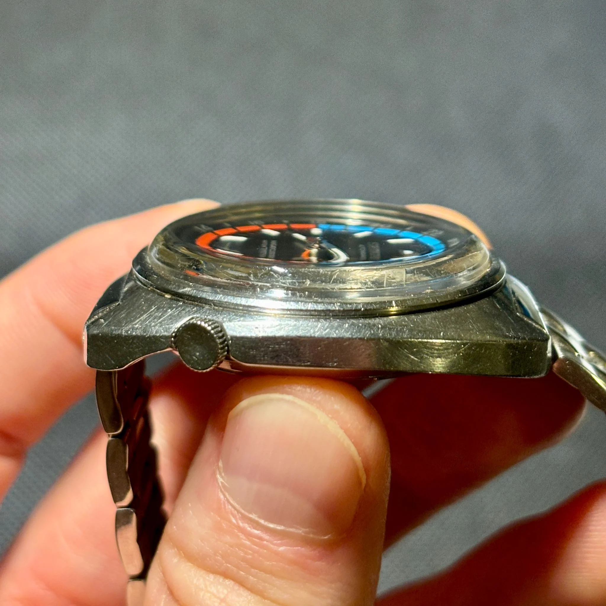 Condition: 50+ year old watch has expected signs of wear throughout with light scratches and minor dings, but nothing severe. Dial is very clean with sharp printing. Inner bezel all intact and great color. Hands and GMT hand in good shape, some minor tarnish. Lume is present on hands and all indices. Crystal shows wear and has small dings around edge (most noticeable around 8) but in general good shape and presents well. No service history, but the movement starts right up with a shake and keeps accurate time (within +/- 1 minute/day)