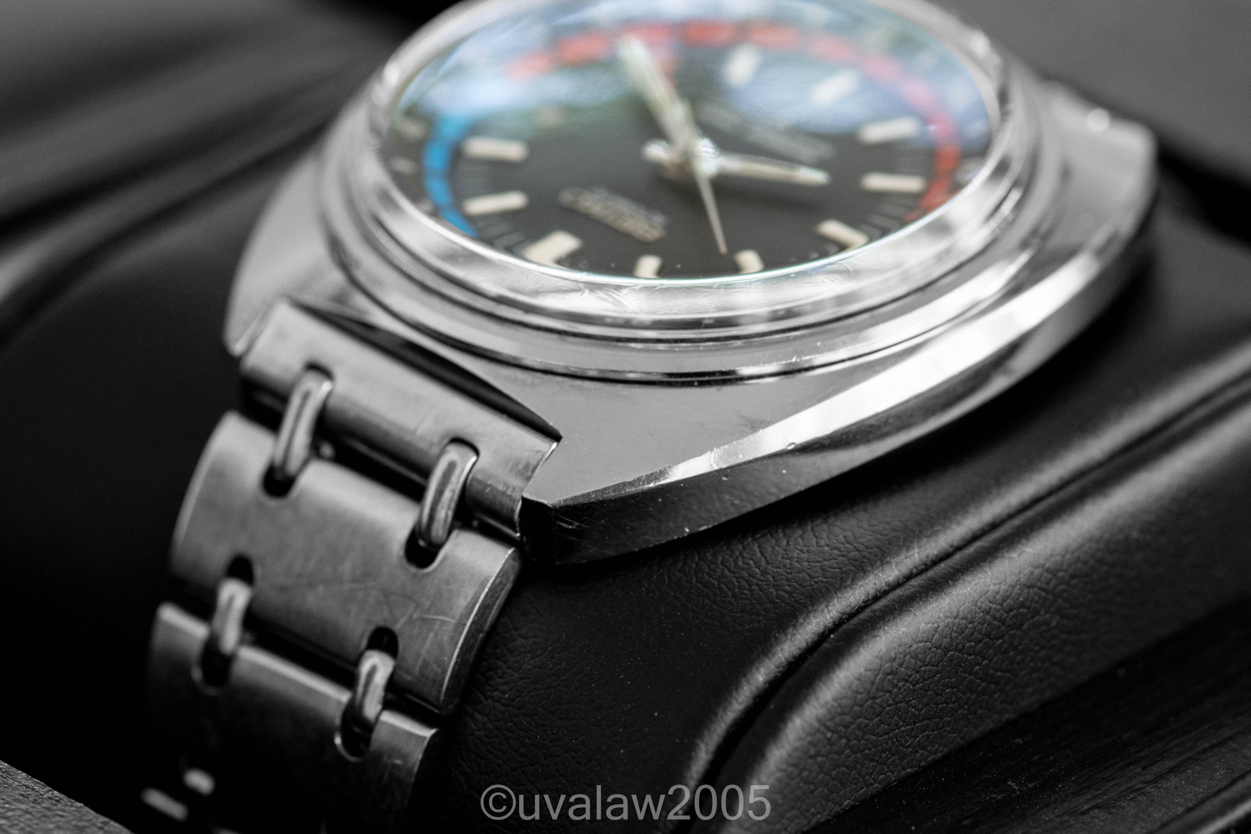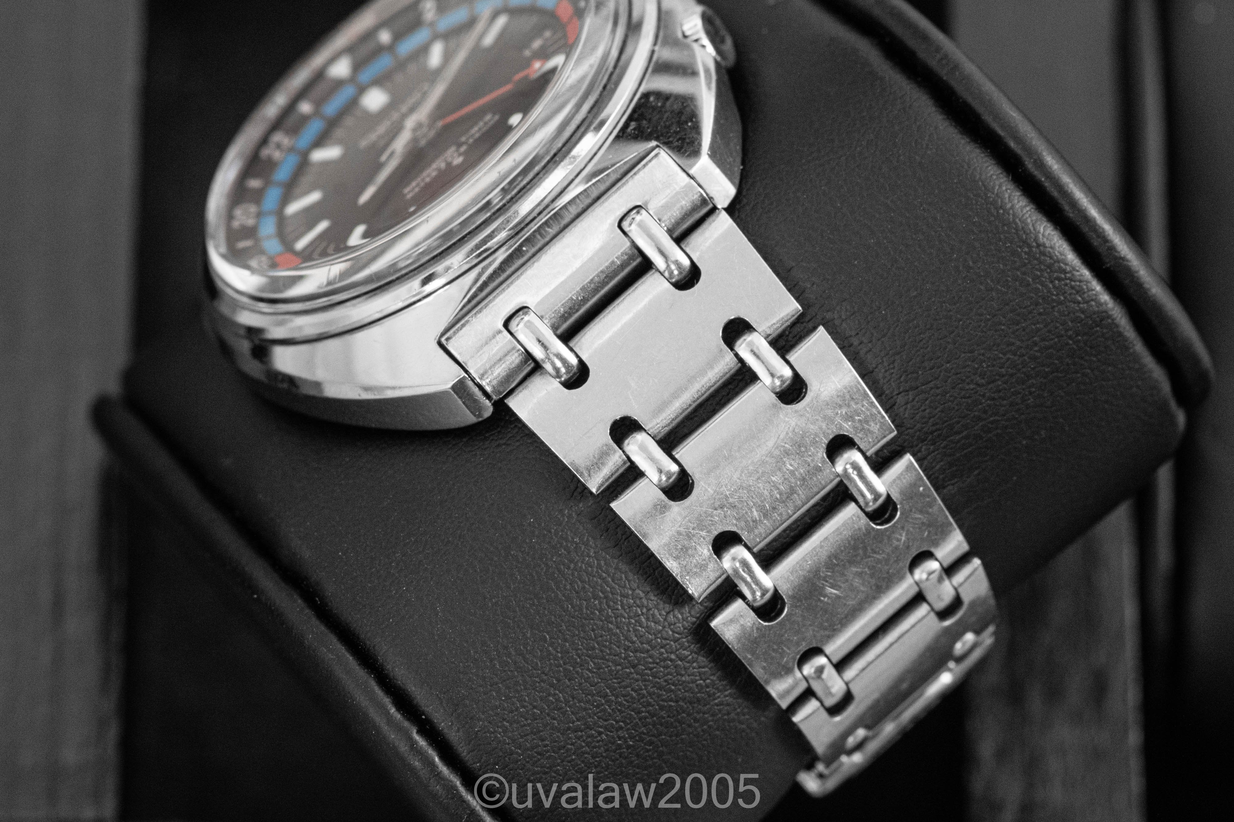 Internal 24hr bezel rotates smoothly. Domed acrylic crystal is in good shape and the chapter ring and GMT hand are free of paint loss. Case and OEM railroad bracelet show surface wear consistent with a 50+ year old sports watch. Service history unknown but running about -6s/day dial up (as with all vintage watches, YMMV).