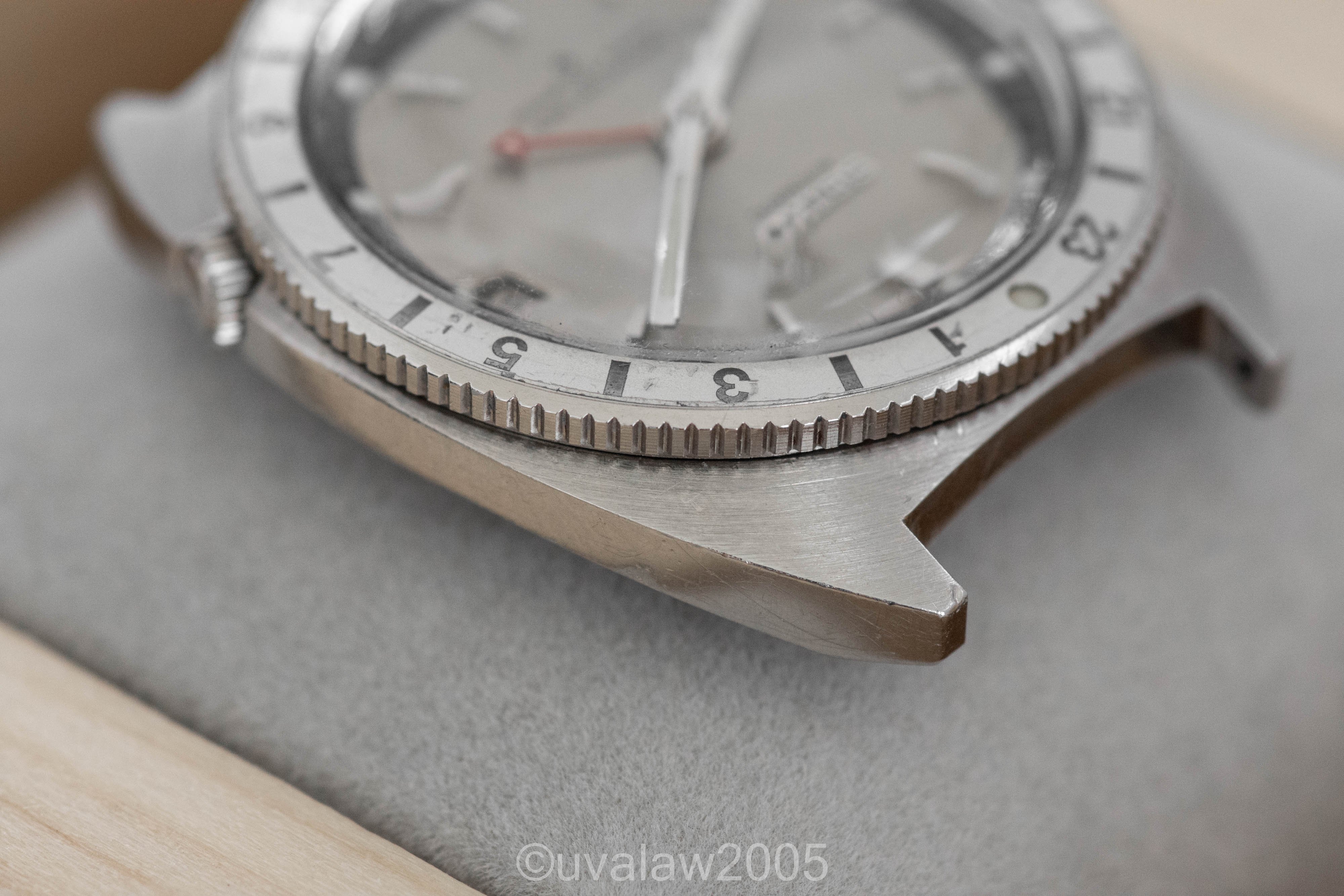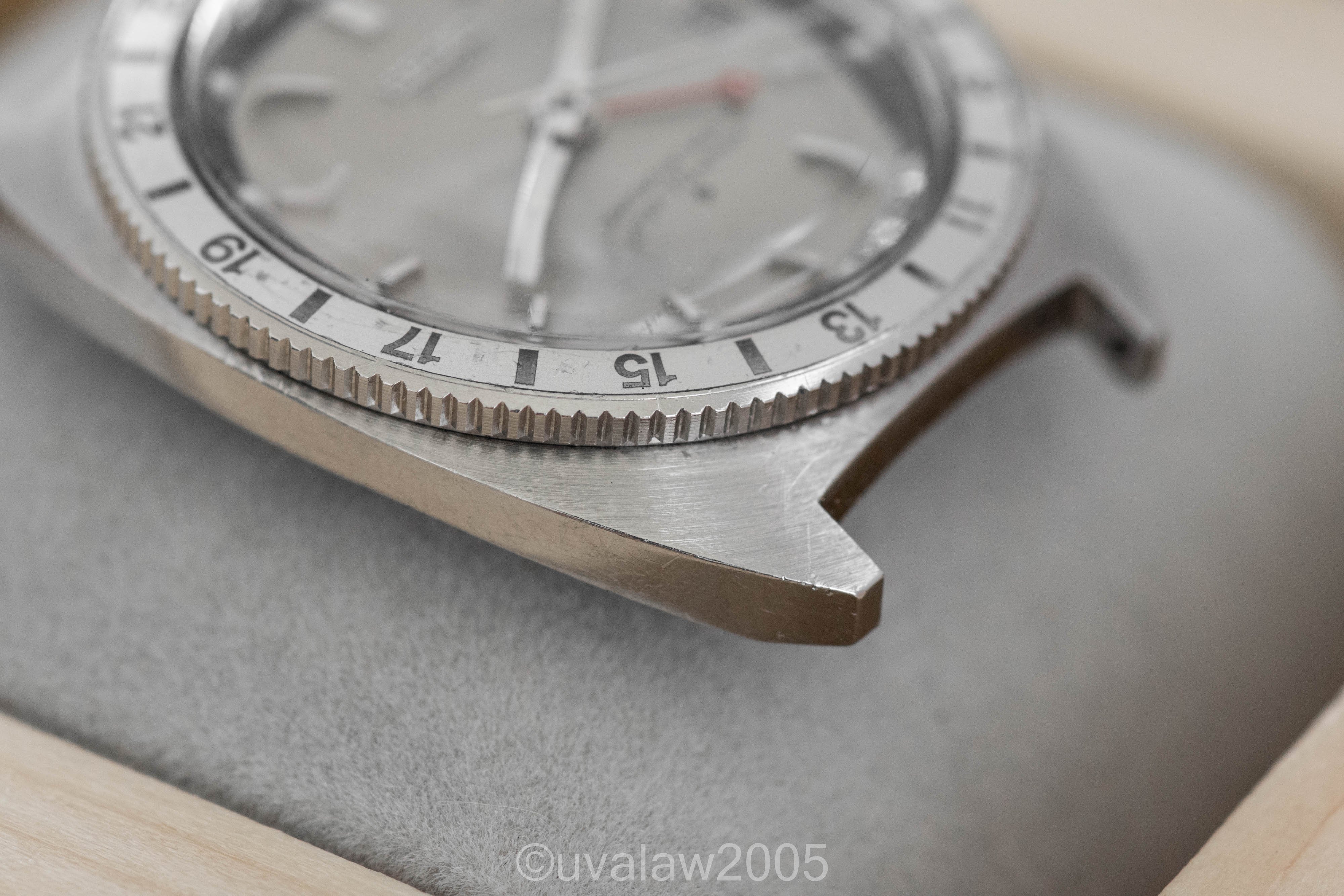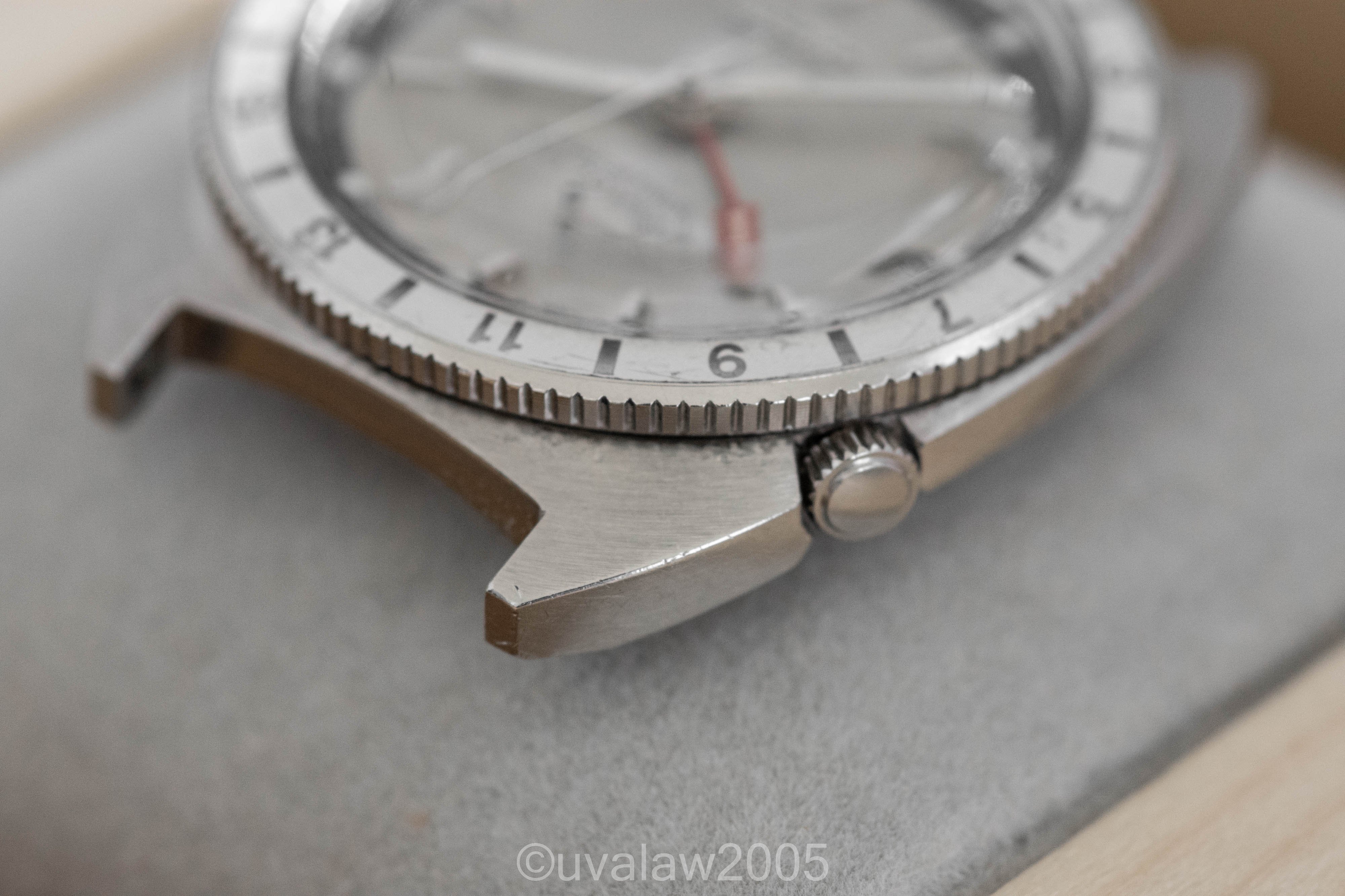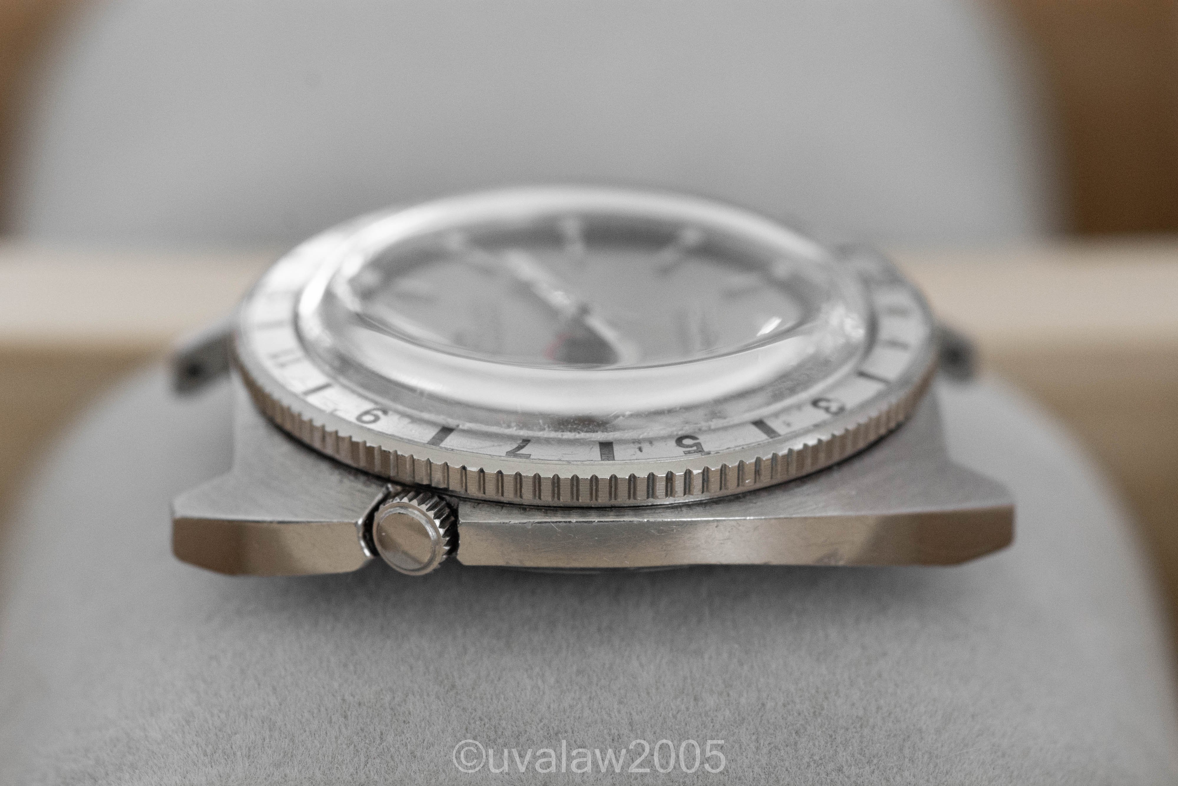 Case measures 38mm x 45mm and shows wear consistent with a 54-year old sports watch, as does the bi-directional ghost friction bezel, which rotates properly and stays in place once set. Acrylic crystal has a few marks.