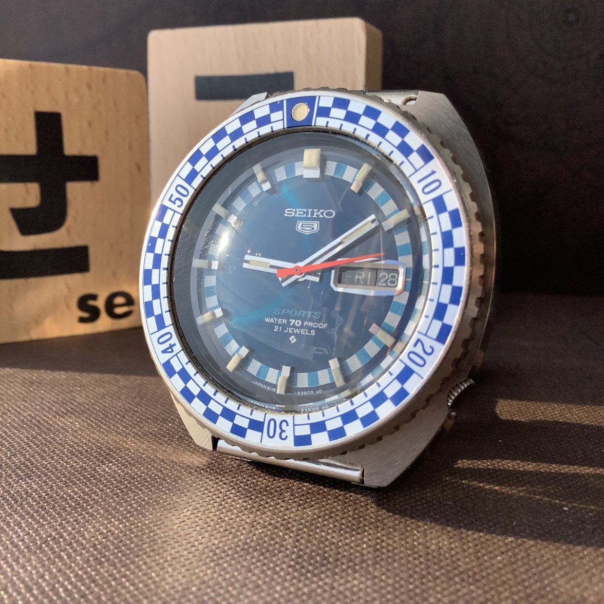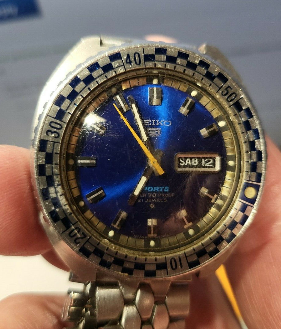 ·I just grabbed one of these with a very scratchy crystal. I have wanted one since I missed a great original on Craigslist a few years ago that was nice and not too costly, but I had to try to get it for less and missed out. Now I see the vast majority for sale have new dials, hands, bezels, inner bezels/chapter rings. I think this one I got has original parts. The repro dials all seem to be marked "resist" and the orig. "proof." Does anyone have any wisdom on these to share? The repro market in Seikos is scary, as many you know.
