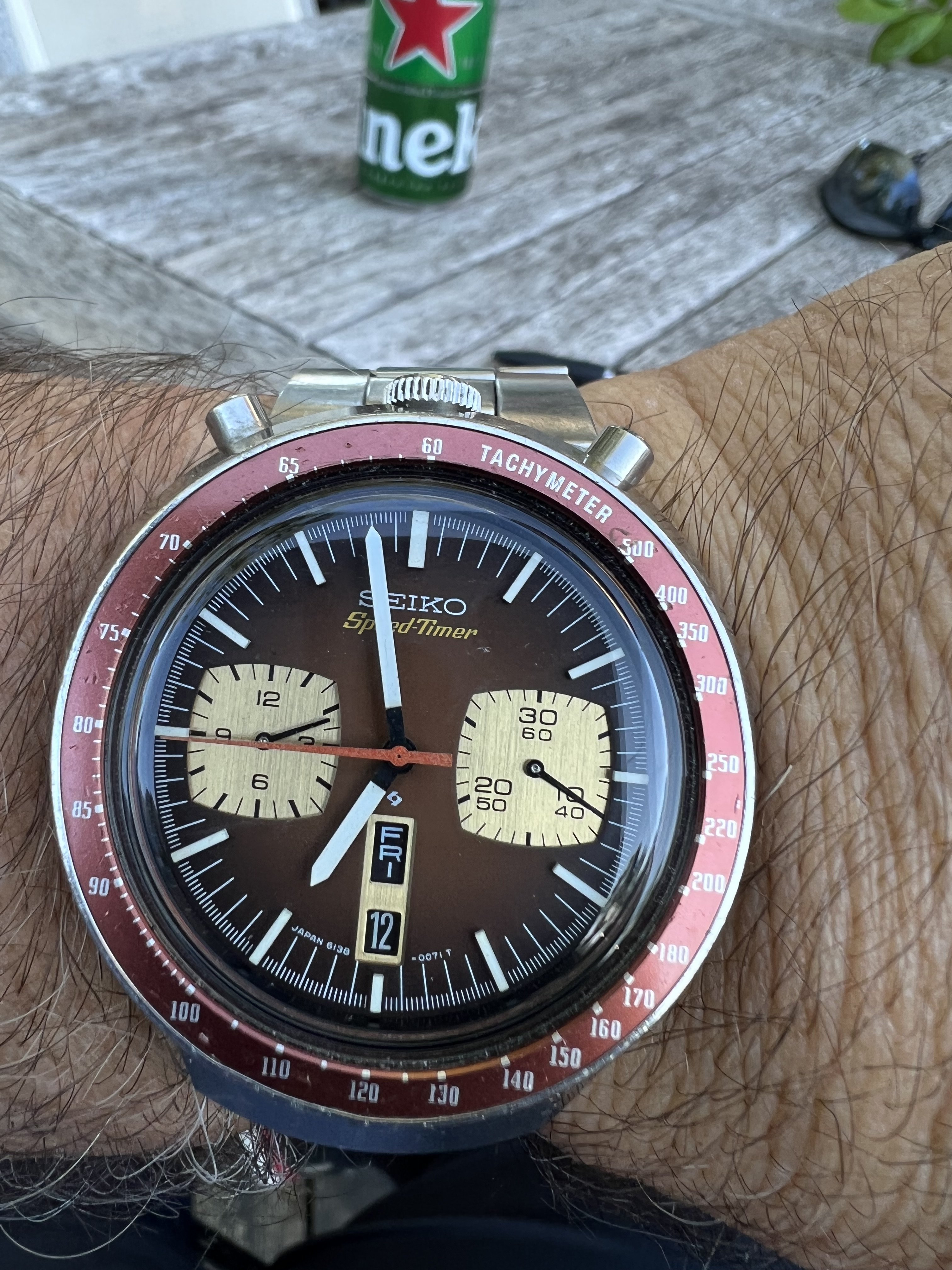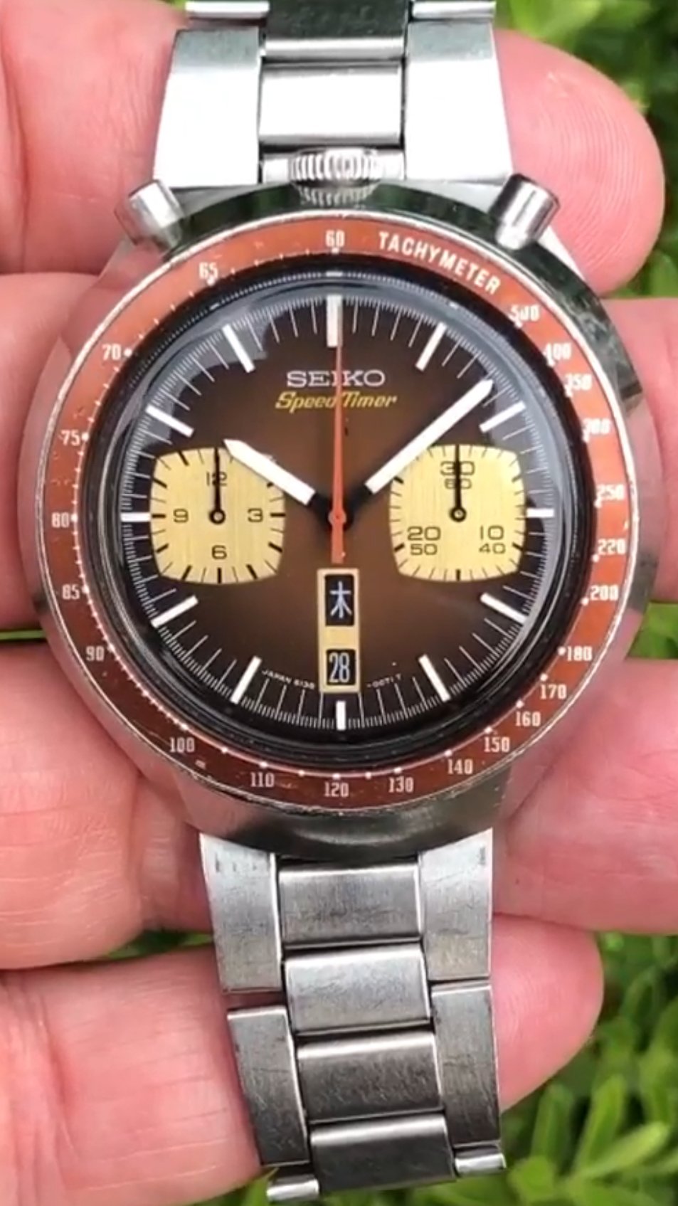 ·For sale is a Seiko 6138-0040 brown Rootbeer Bullhead vintage chronograph from 1977. Original JDM model in excellent condition, with Kanji and English day wheel. The 6138 watches were the followup to the famed 6139, and added hacking and manual winding features, and were made up to 1979. On its original bracelet. Purchased from well known Seiko collector and seller in UK, serviced before I bought it in UK.
