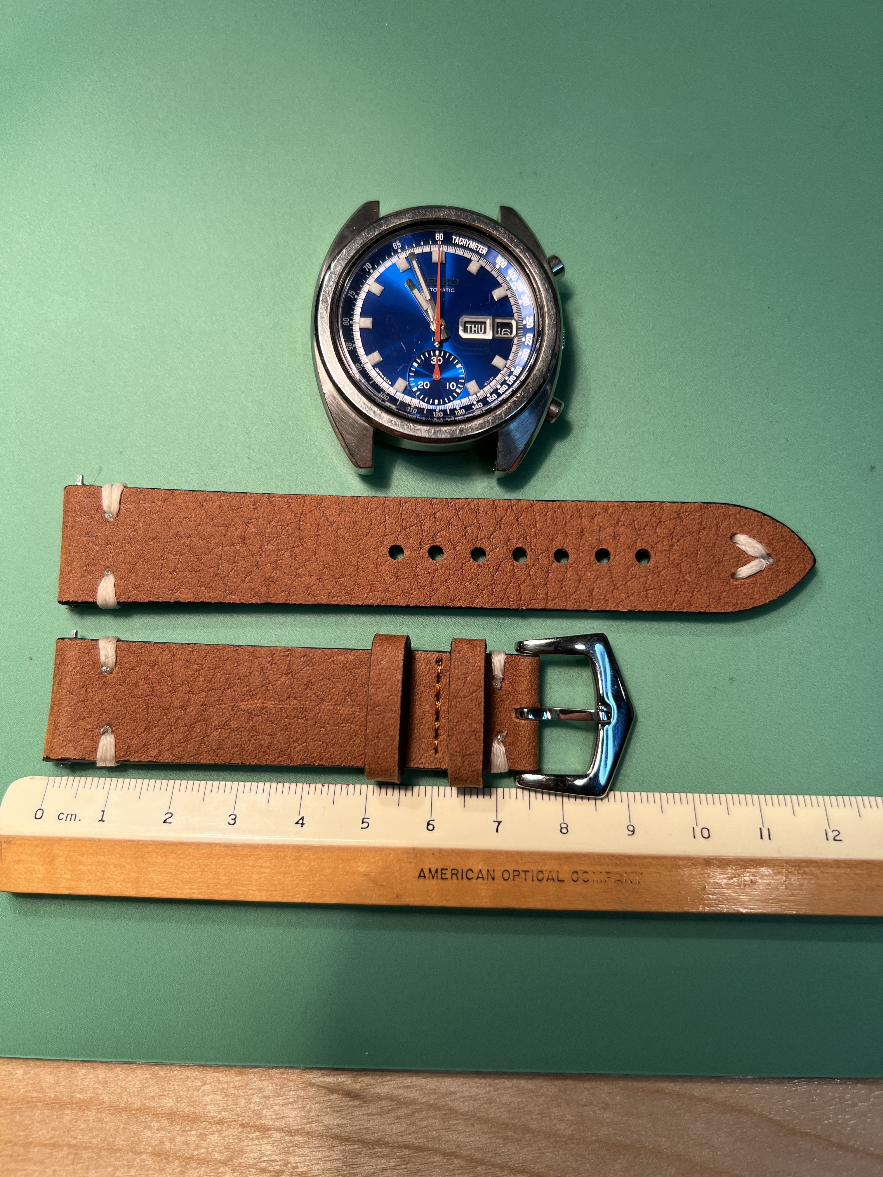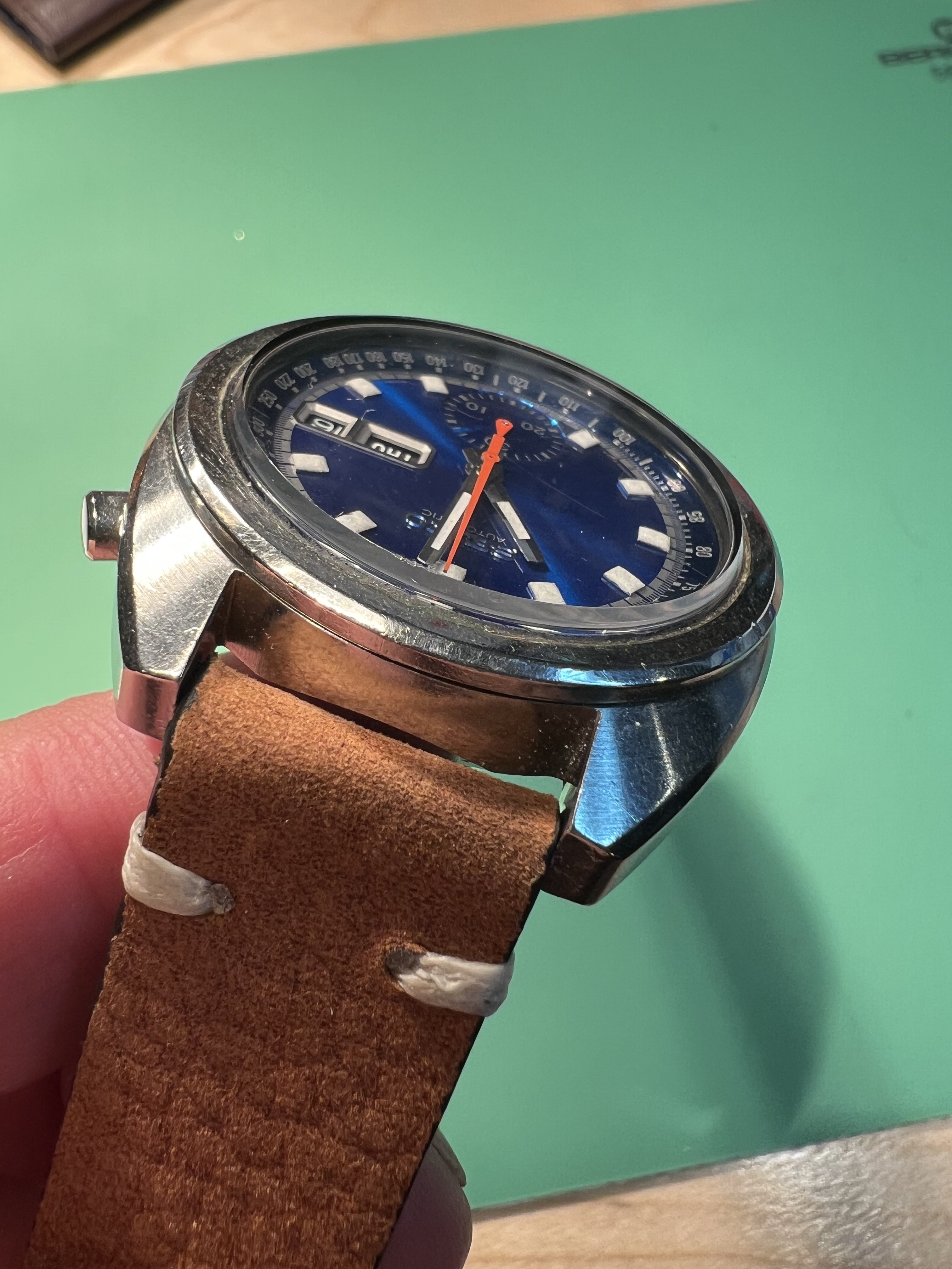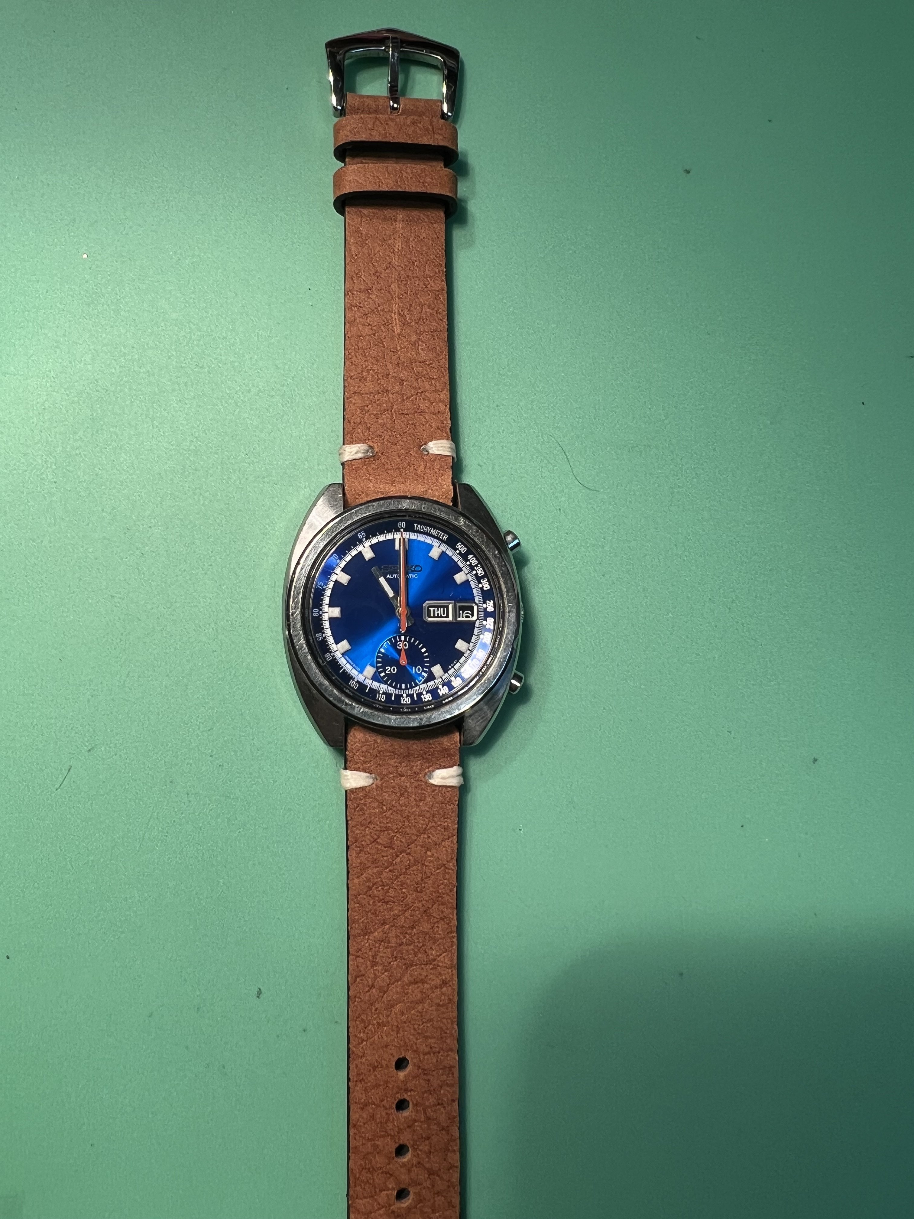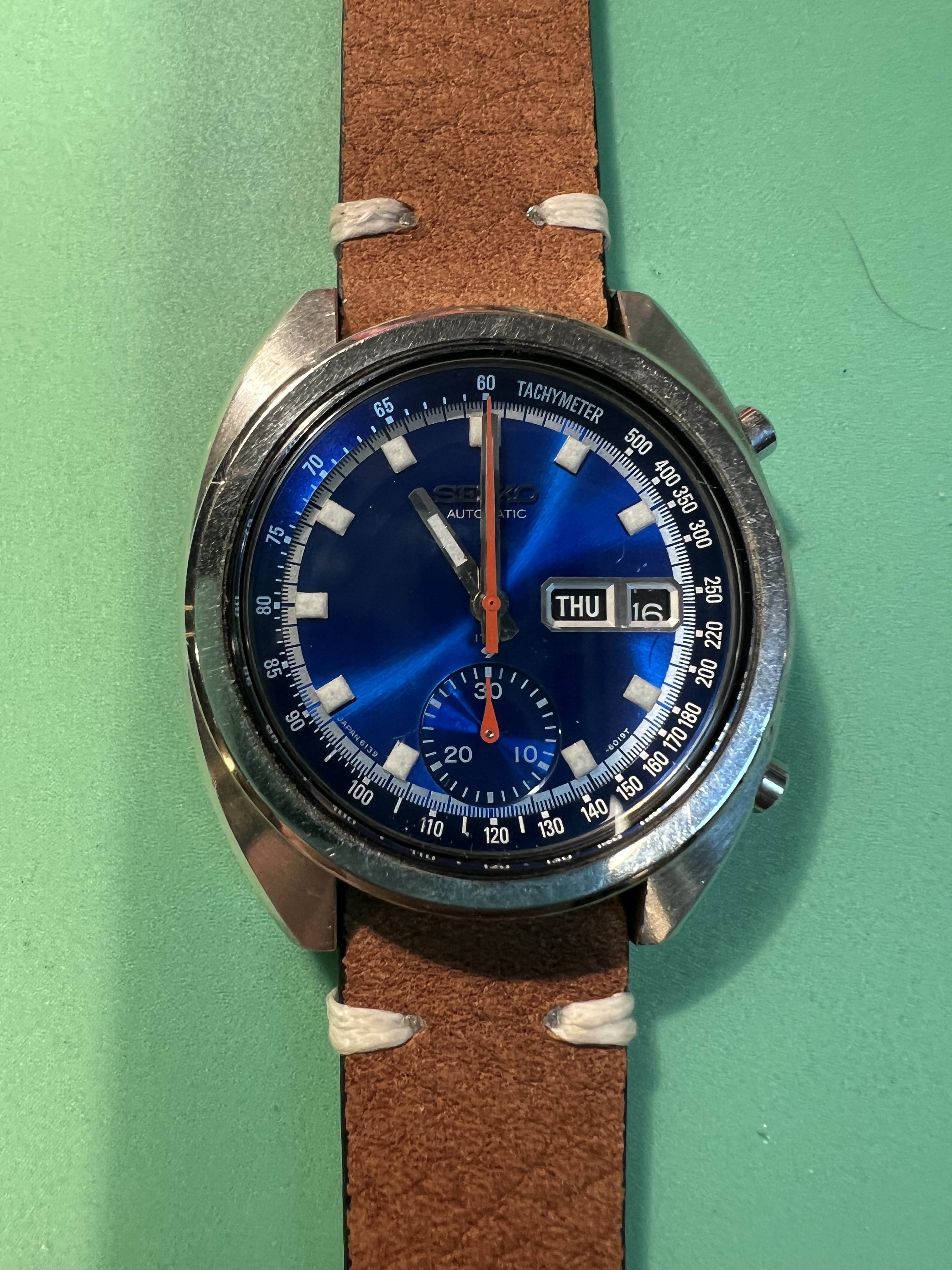 The watch: I am offering for sale a SEIKO 6139-6015 Automatic chronograph from 1973, also know as “Blue Bruce Lee”, as the actor famously wore the 6139 watch (his was a black dial). This watch is considered by many to be the first automatic chronograph, coming to market early in 1969. The 6139 movement is a well known and highly regarded workhorse, with many different dial combinations offered. This has the SEIKO deep blue starburst dial, which is a beautiful color particularly in the hand.