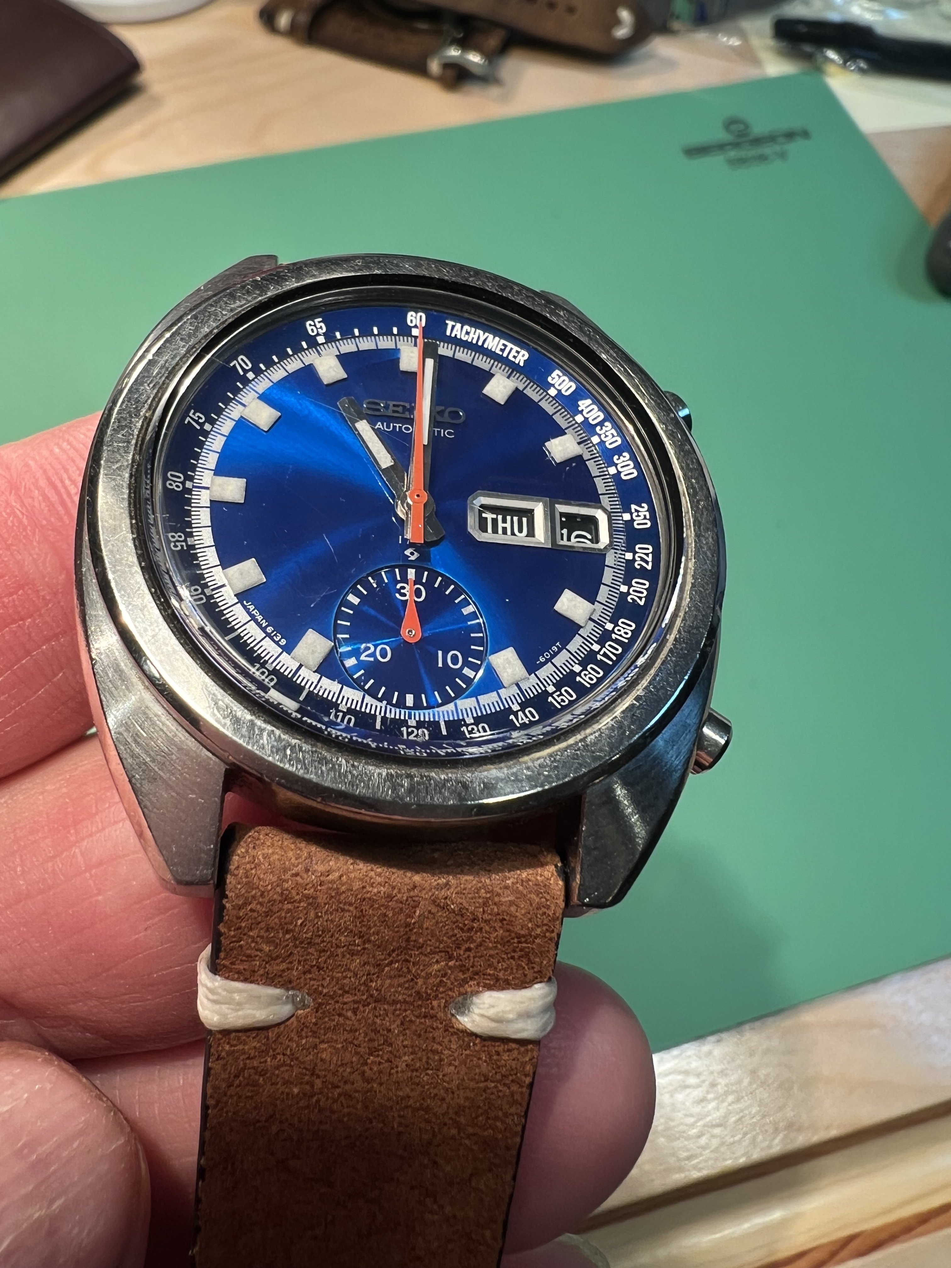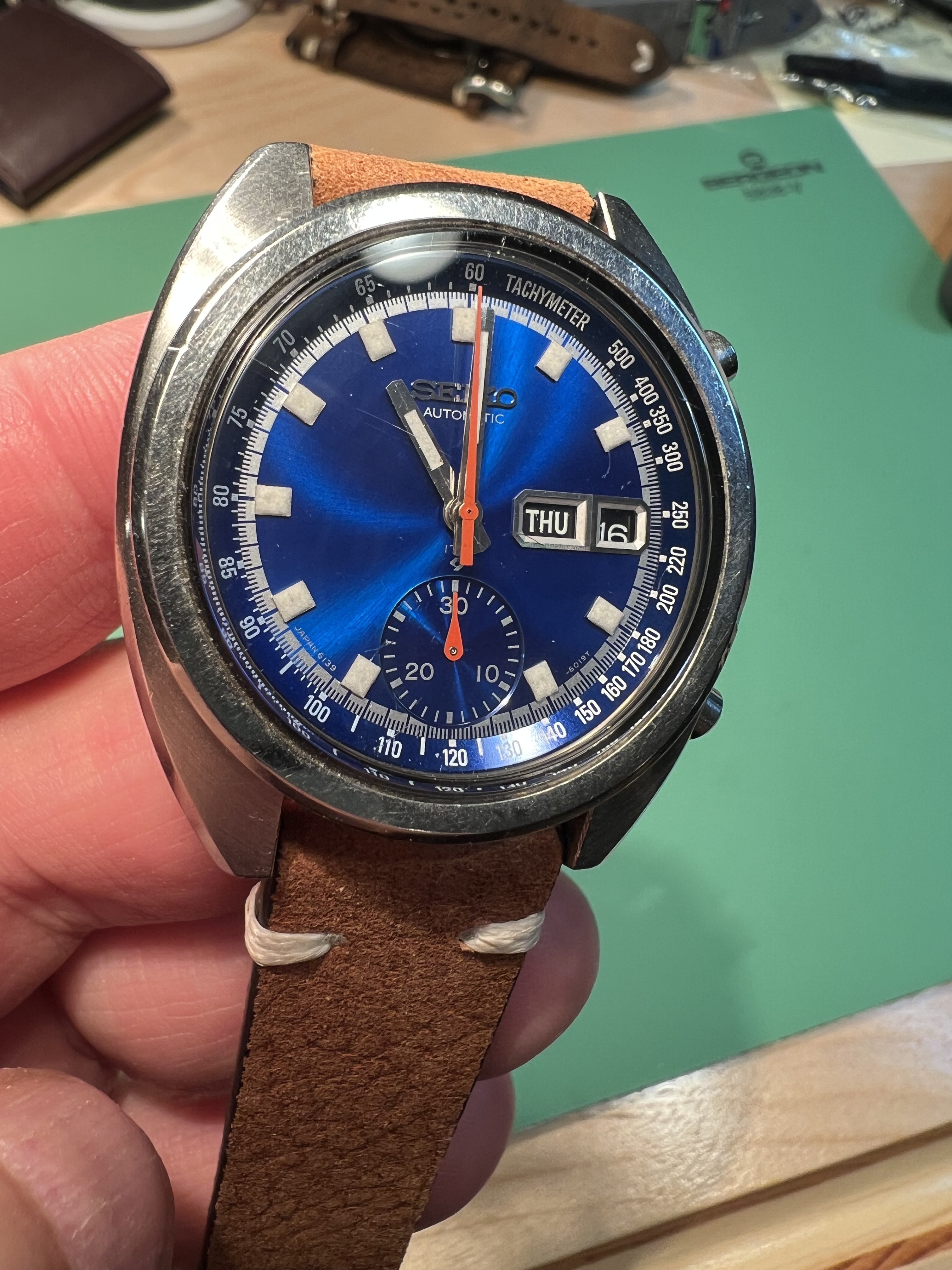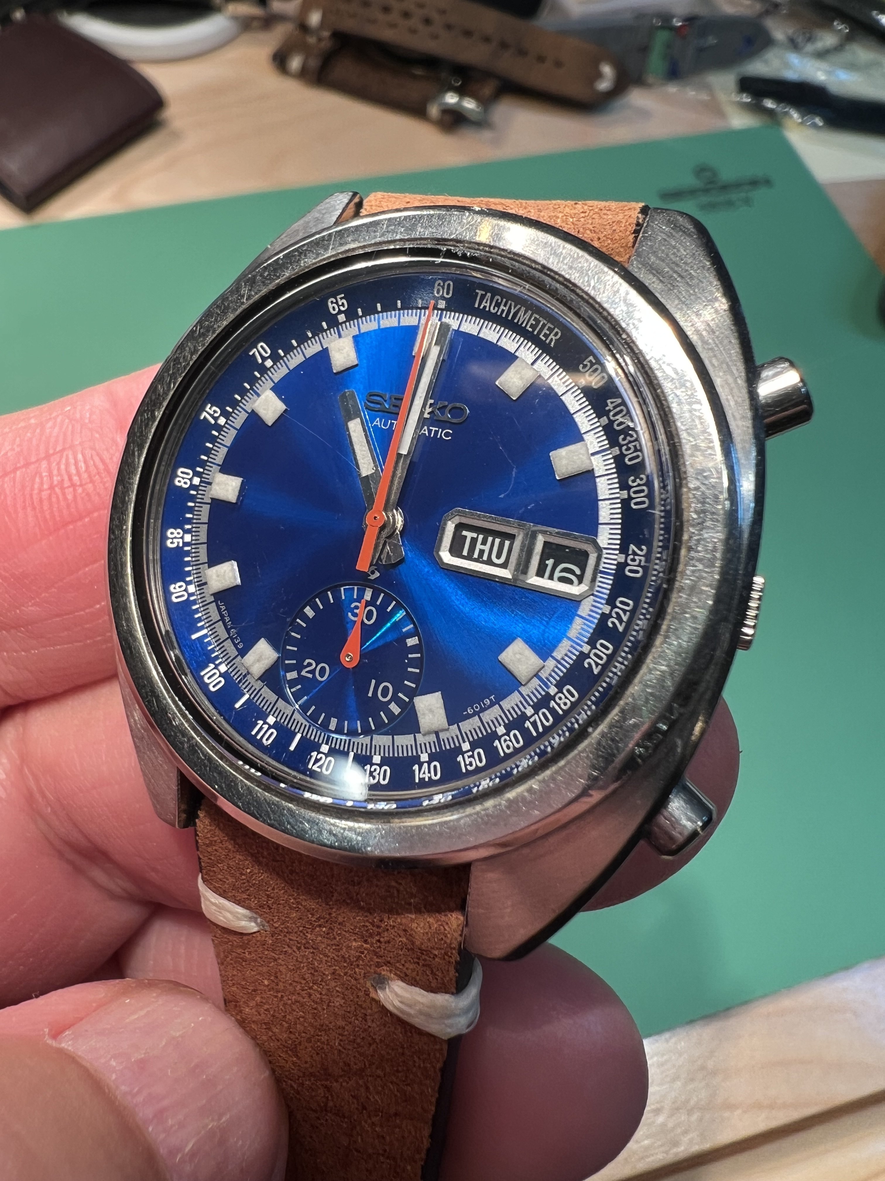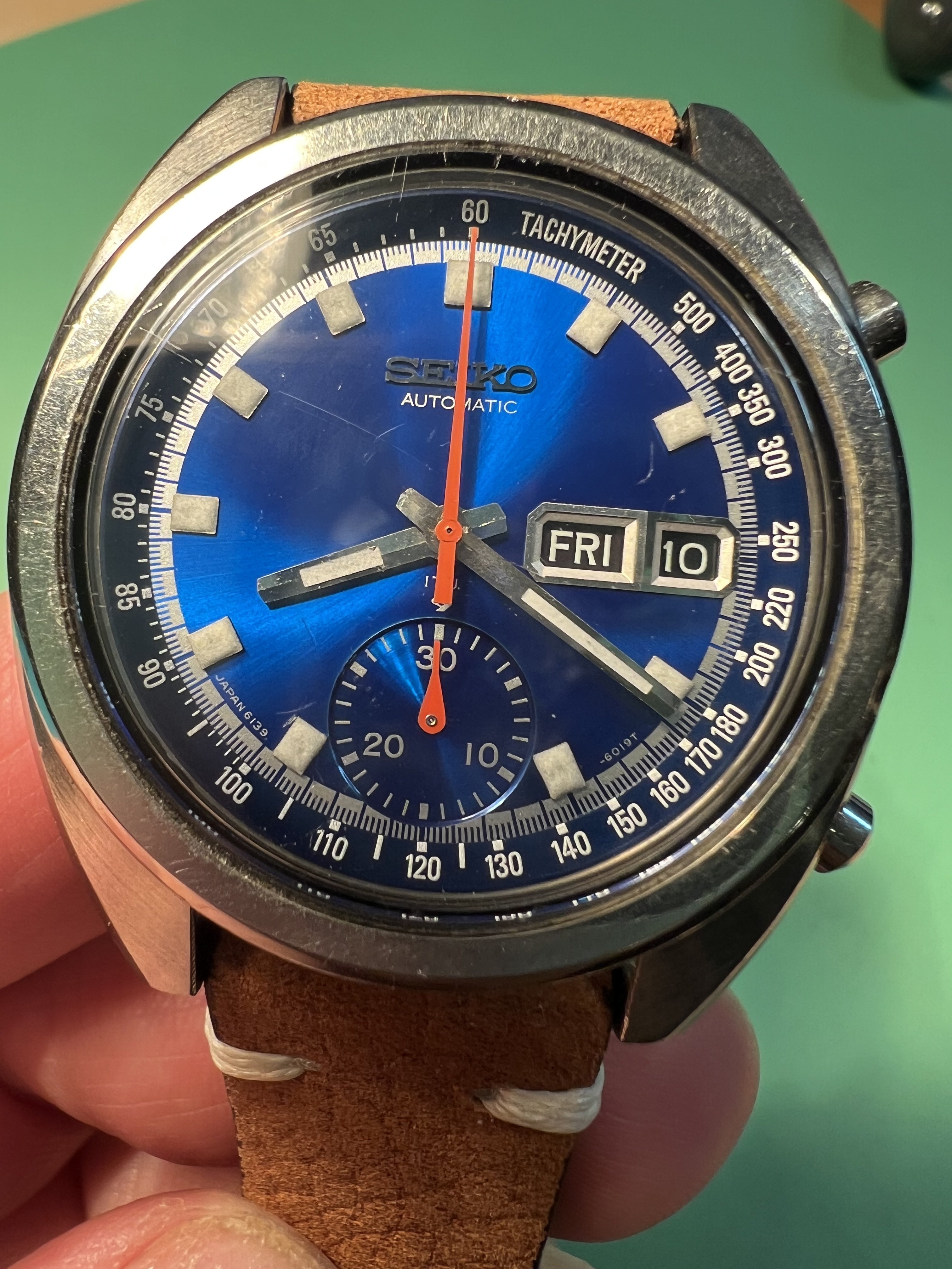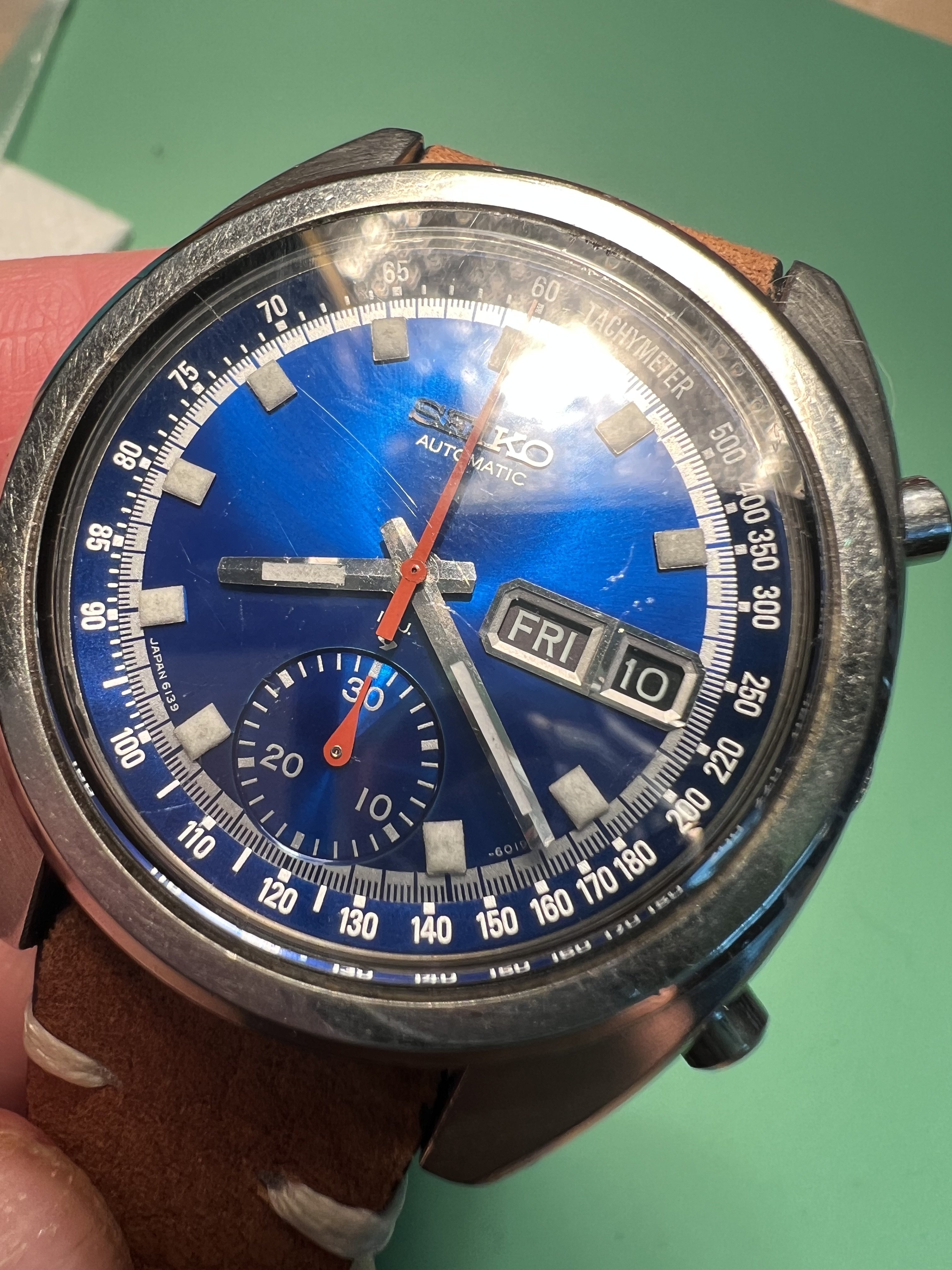 DIAL: .Deep Seiko blue starburst, with clear tachymeter text and hour and minute and minute fraction markings. Dial is clean with no damage or markings. Some reflected marks from crystal imperfections not on dial itself. Intact clean lume plots which glow after strong light exposure but fade quickly, consistent with vintage lume. No lume degradation or wabi noted. Subdial at 6:00 typical for this reference with 30 min markings intact. Dial markings Japan 6139 between 7-8 hour markers, -6019T between 4-5 hour markers, with proper text and fonts. Day/Date window at 3:00, working well with English and Spanish day wheel.