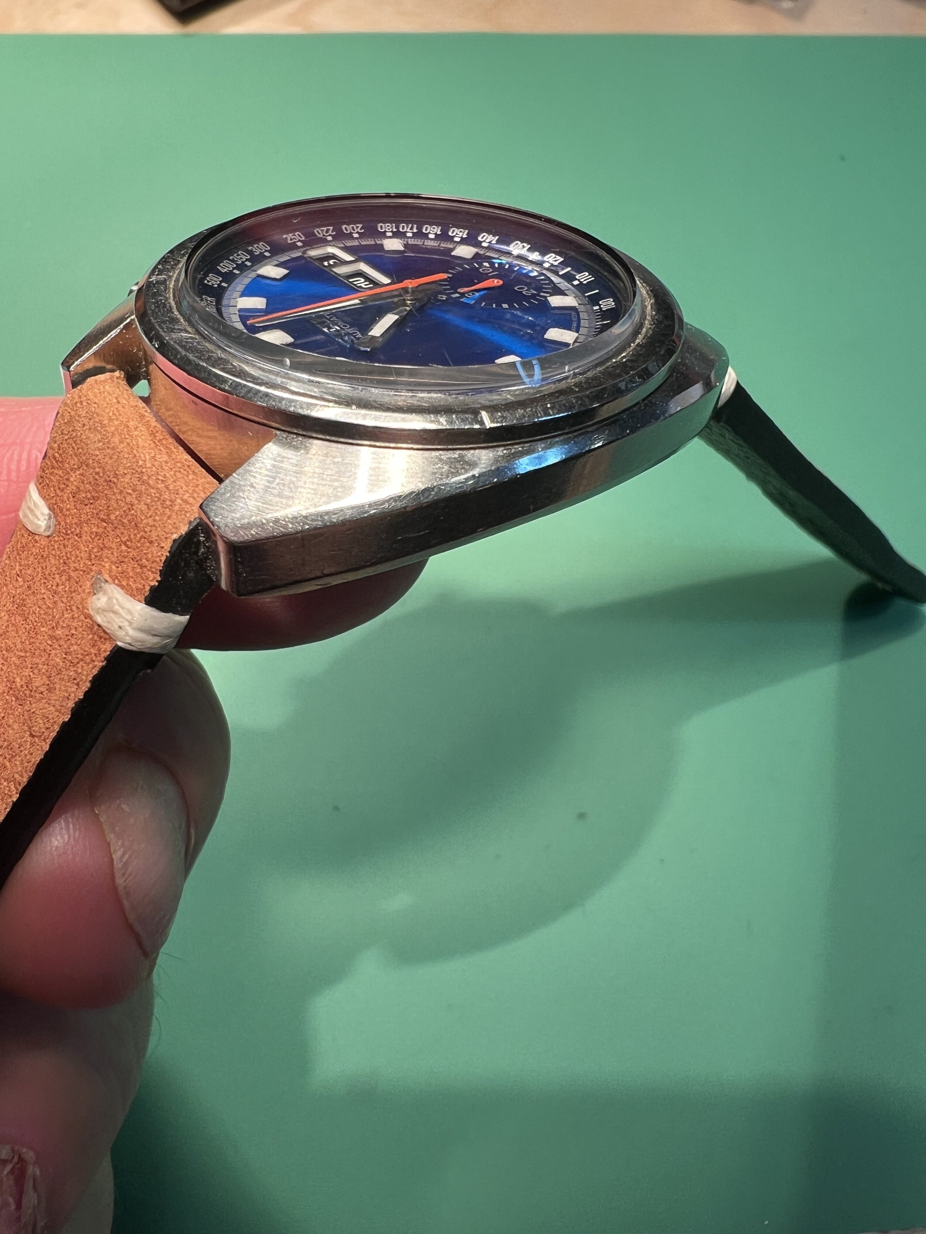 HANDS: Original steel hour/minute hands with intact lume, briefly glowing then quickly fading like hour lume plots consistent with vintage lume. Red/orange sweep hand and subdial hand good condition same color consistent with both being original.