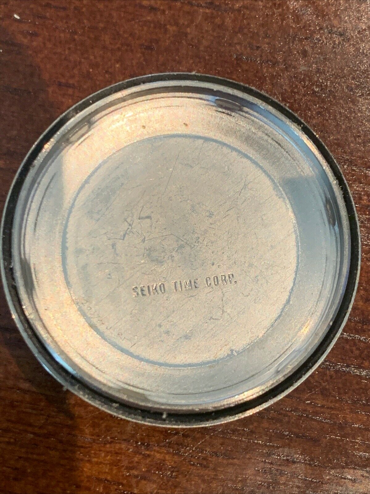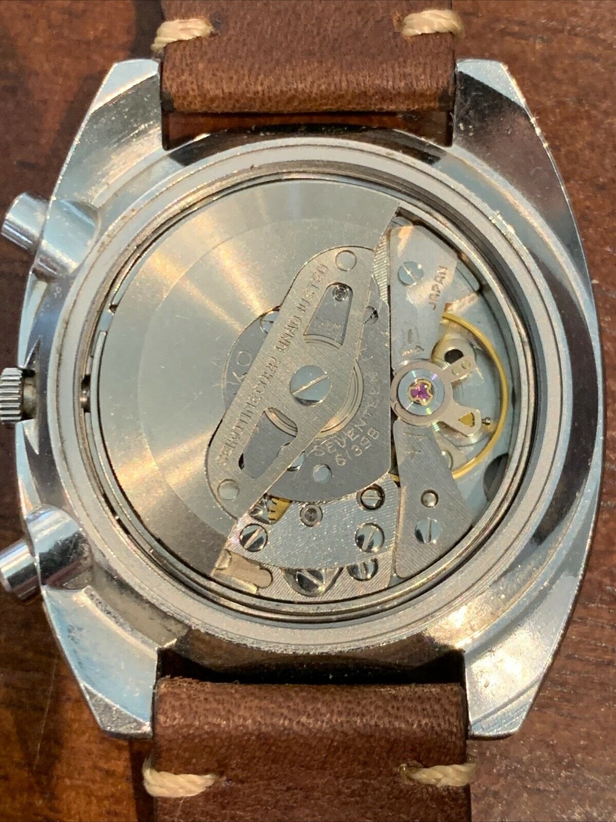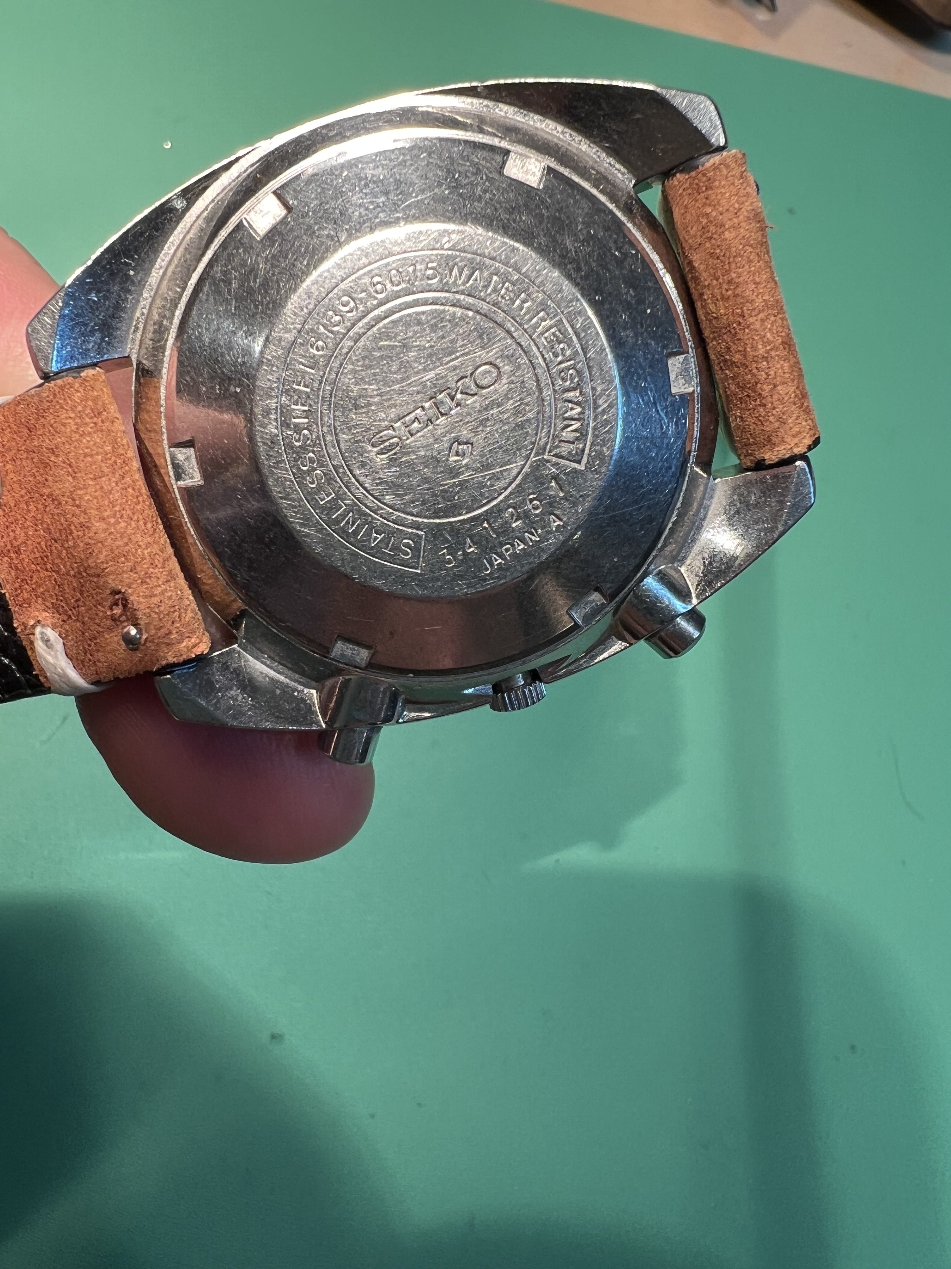 CASE BACK: Cade screwdown caseback, marked Stainless Steel 6139-6015 Water Resistant, Serial number 341261 dating watch to April 1973. SEIKO and Suwa logo in center, Japan A at bottom. Some wear and scratches consistent with age, no case opening scratches noted.