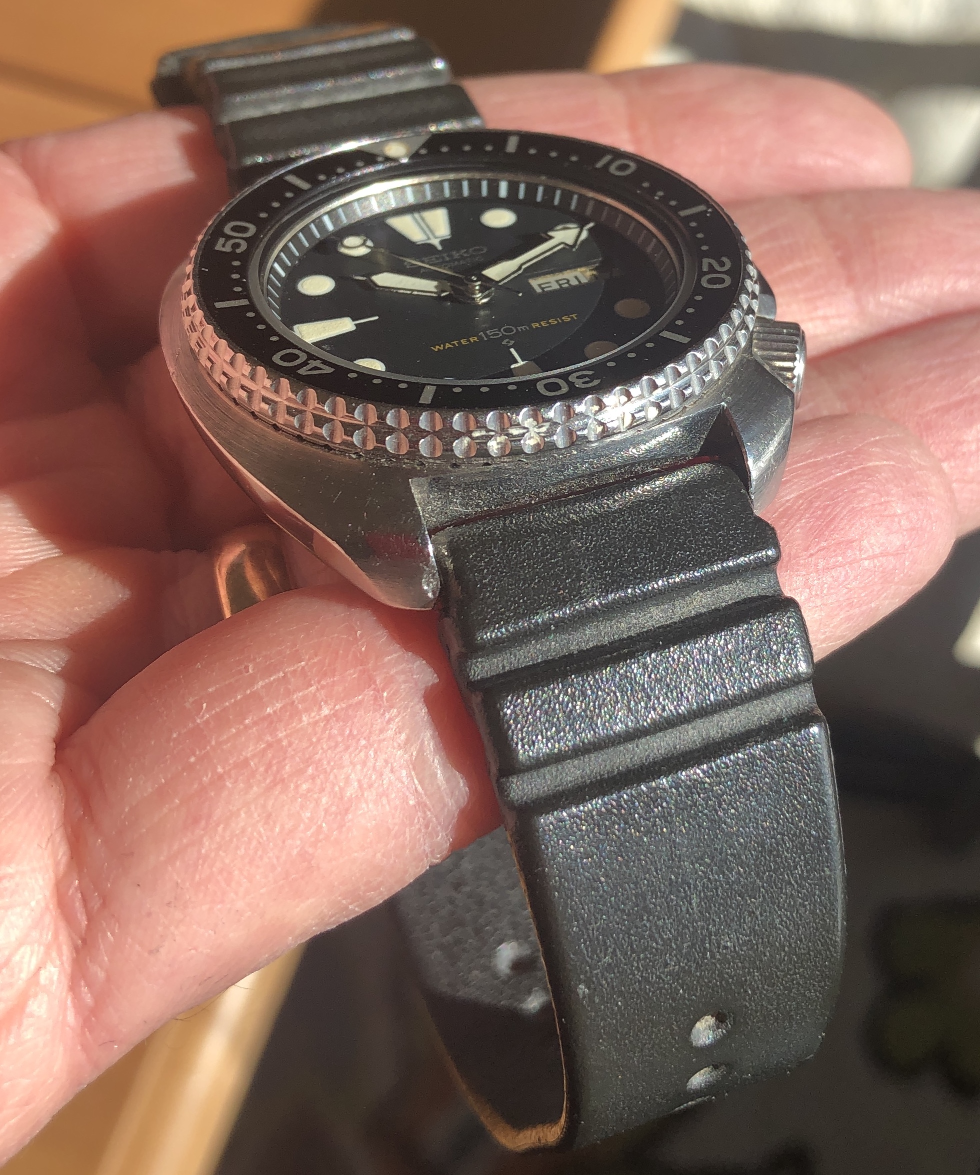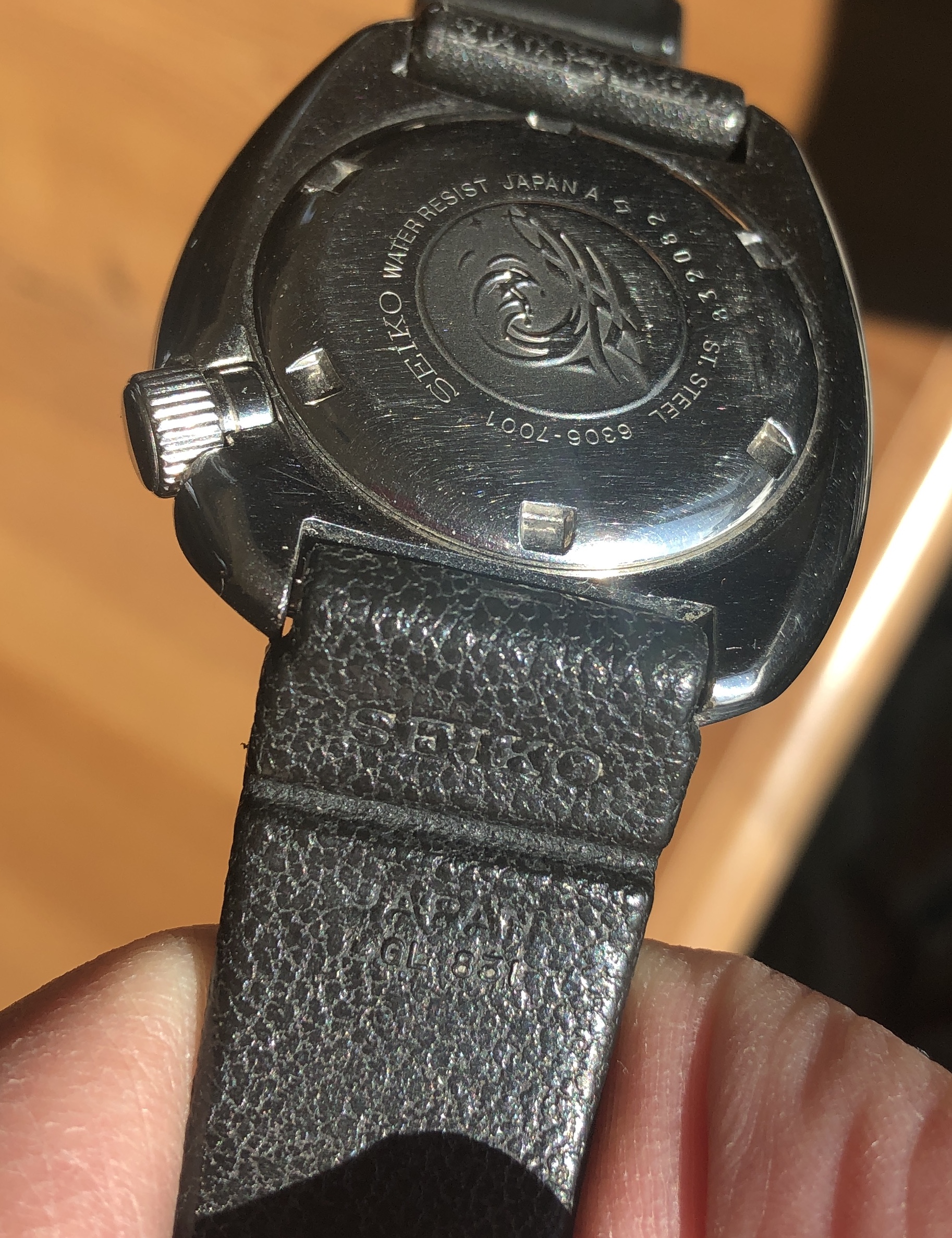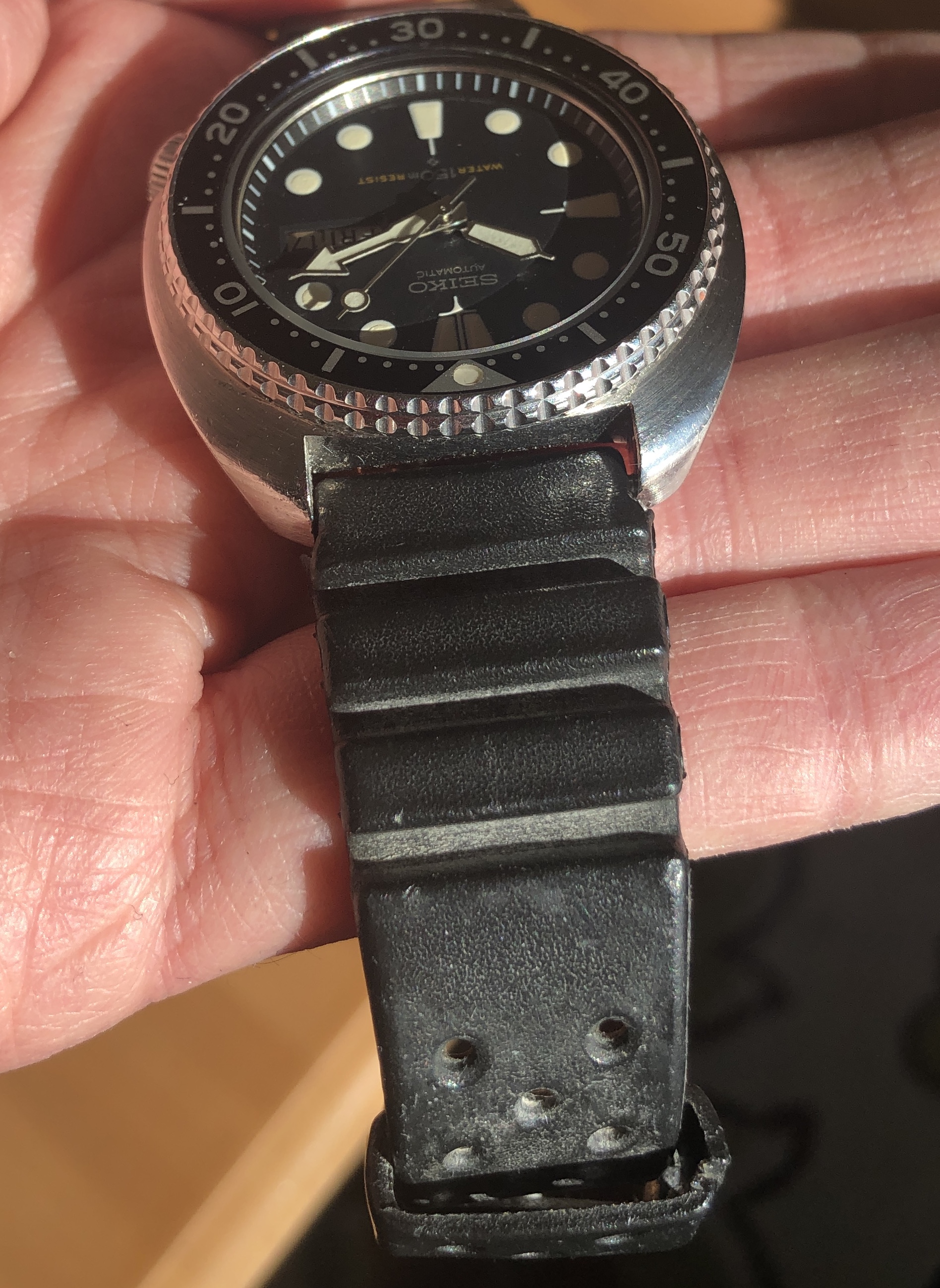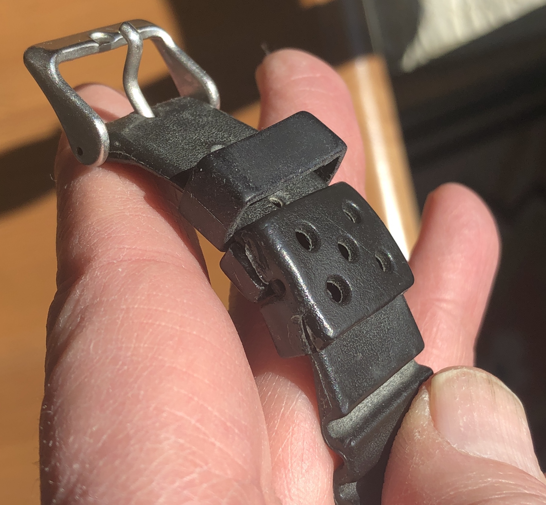 The strap is an original GL 831 in fair shape. The strap itself is rather rigid, but has no cracks or visible damage. However the keeper near the buckle is splitting, and will not last long. I have added a second Seiko keeper, positioned closer to the buckle to take some of the stress off the original keeper as seen in the photo below.