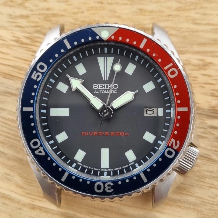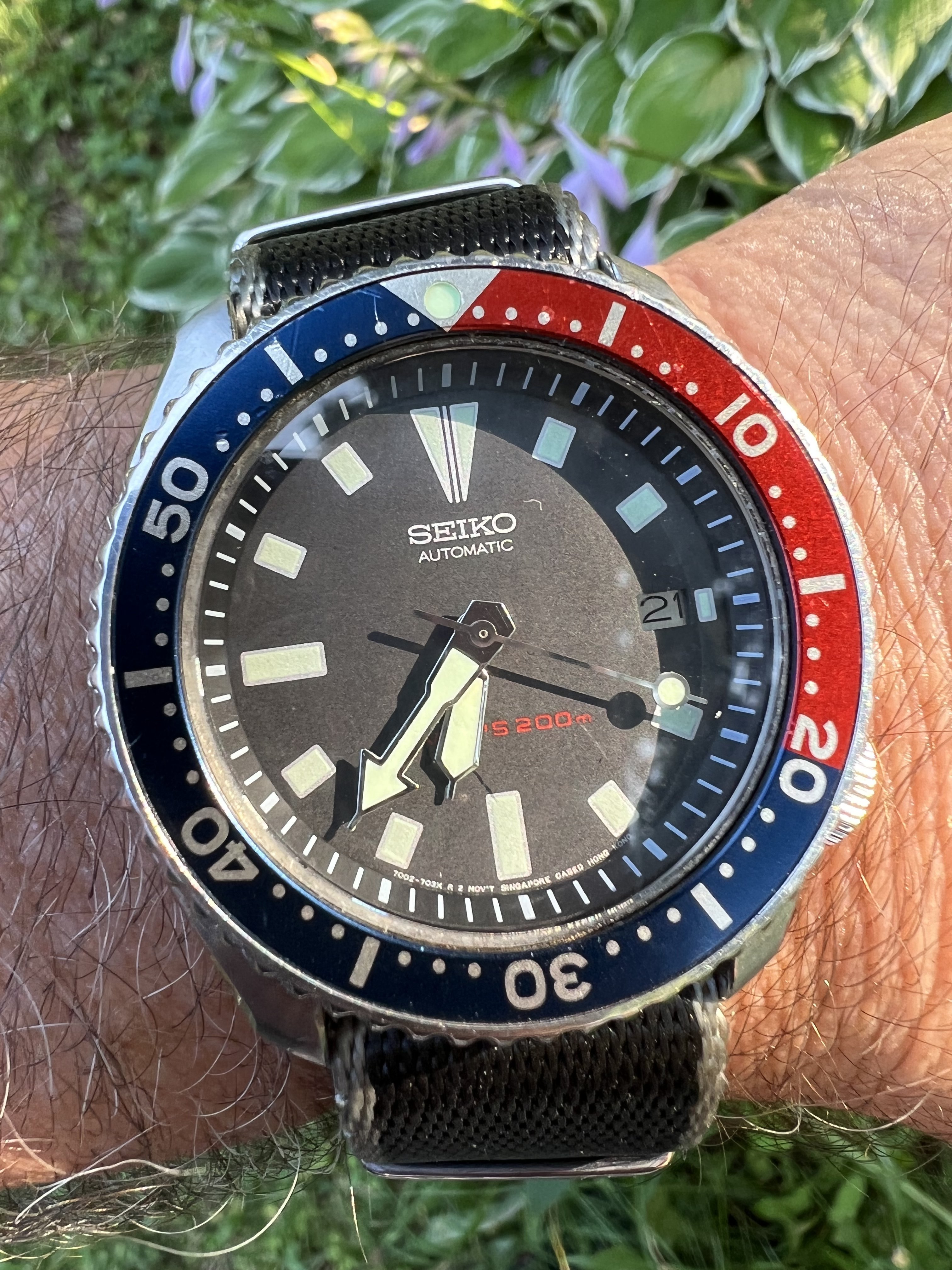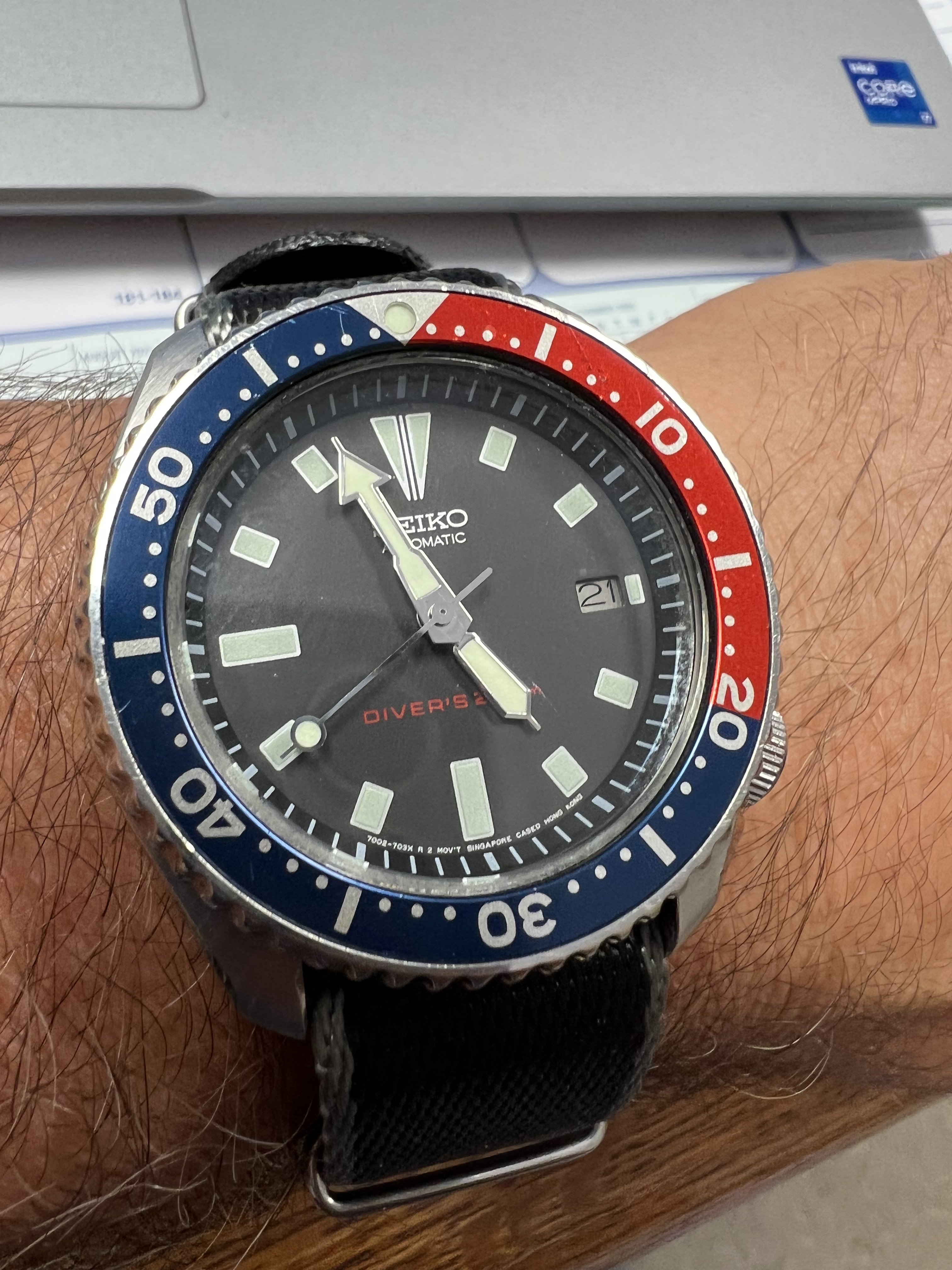 All original example of 7002-7039 “Pepsi” Diver, the transitional watch between the 6309 Turtle which ended in 1988, and the SKX line in 1997. The 7002 was another workhorse toolwatch movement with improvements from the 6309. It is in used but very good overall condition, and was purchased from Rexworthy Watches in UK after a full service in July 2022. It is all original and running great.