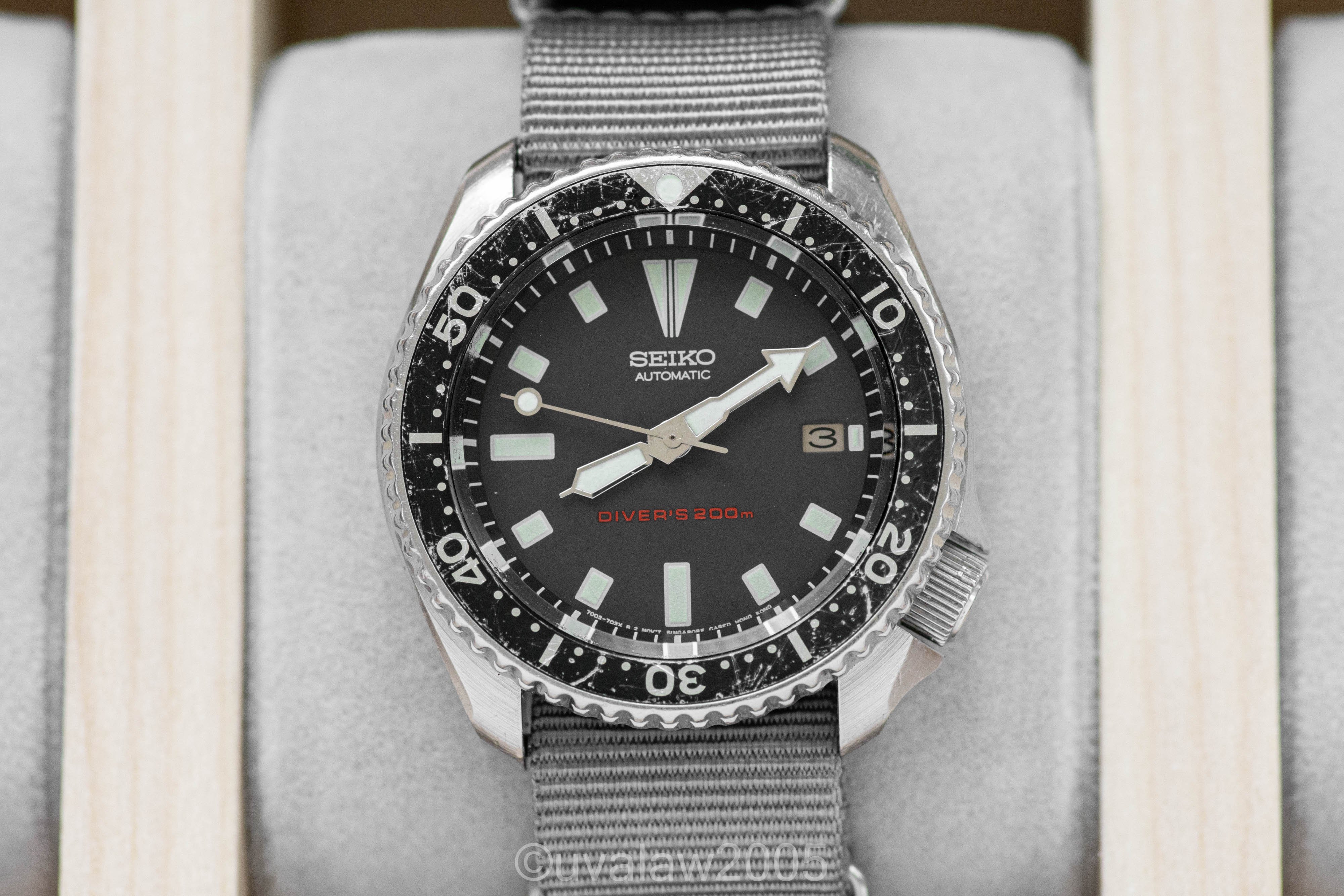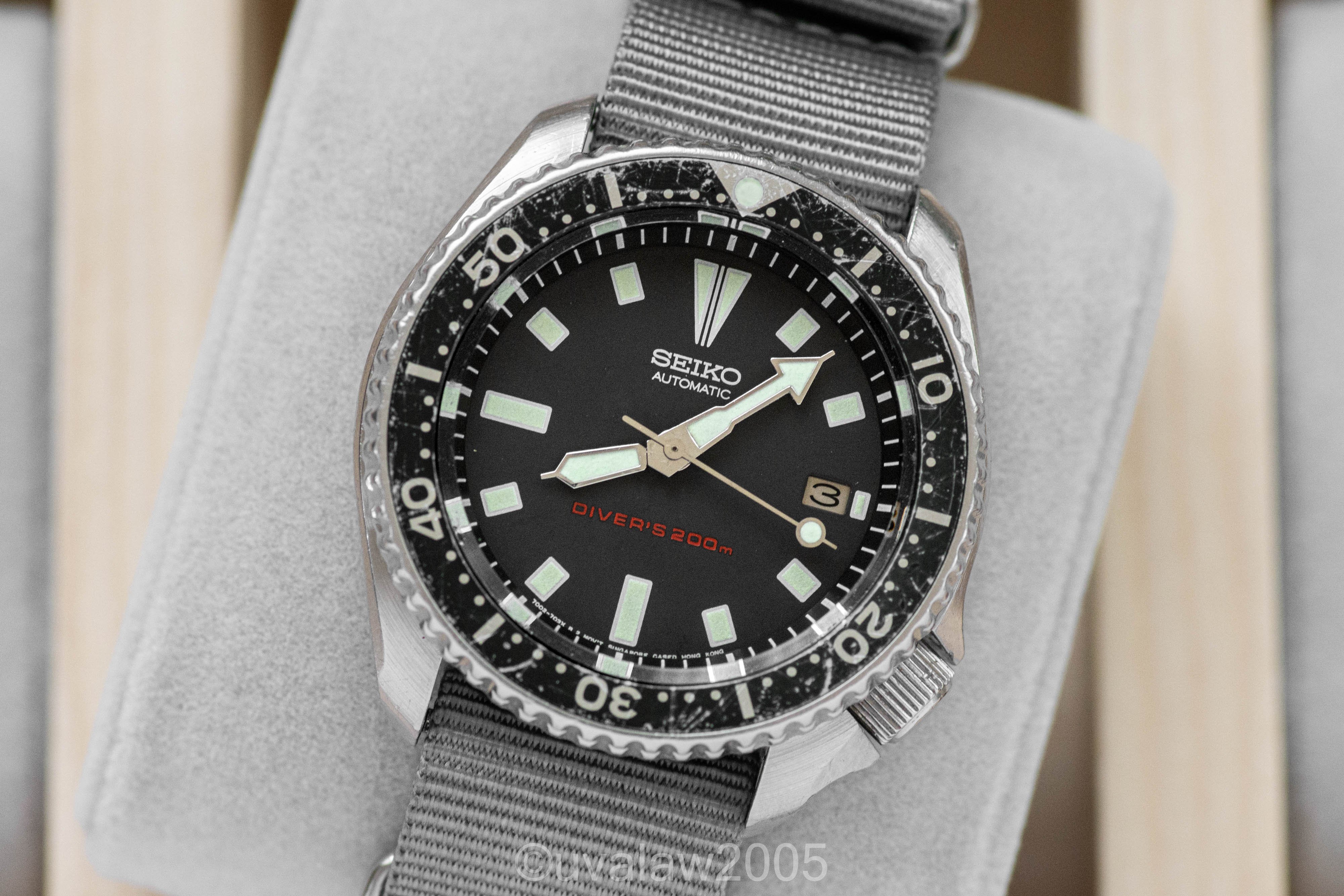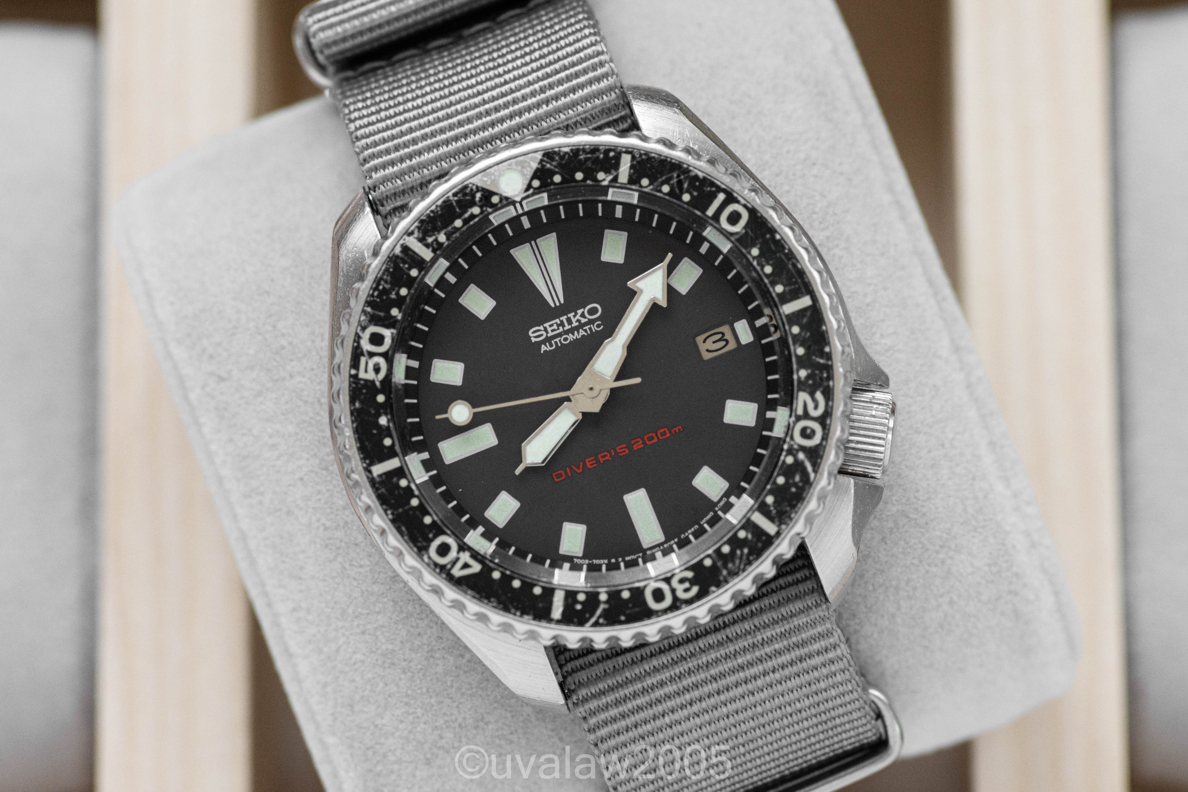 This 7002 has been upgraded with a flat sapphire crystal with clear AR, a new bezel click spring, and fresh gaskets. Movement was serviced by The Hobby Horologist. Running +/- 10s/day (as with any vintage watch, YMMV).