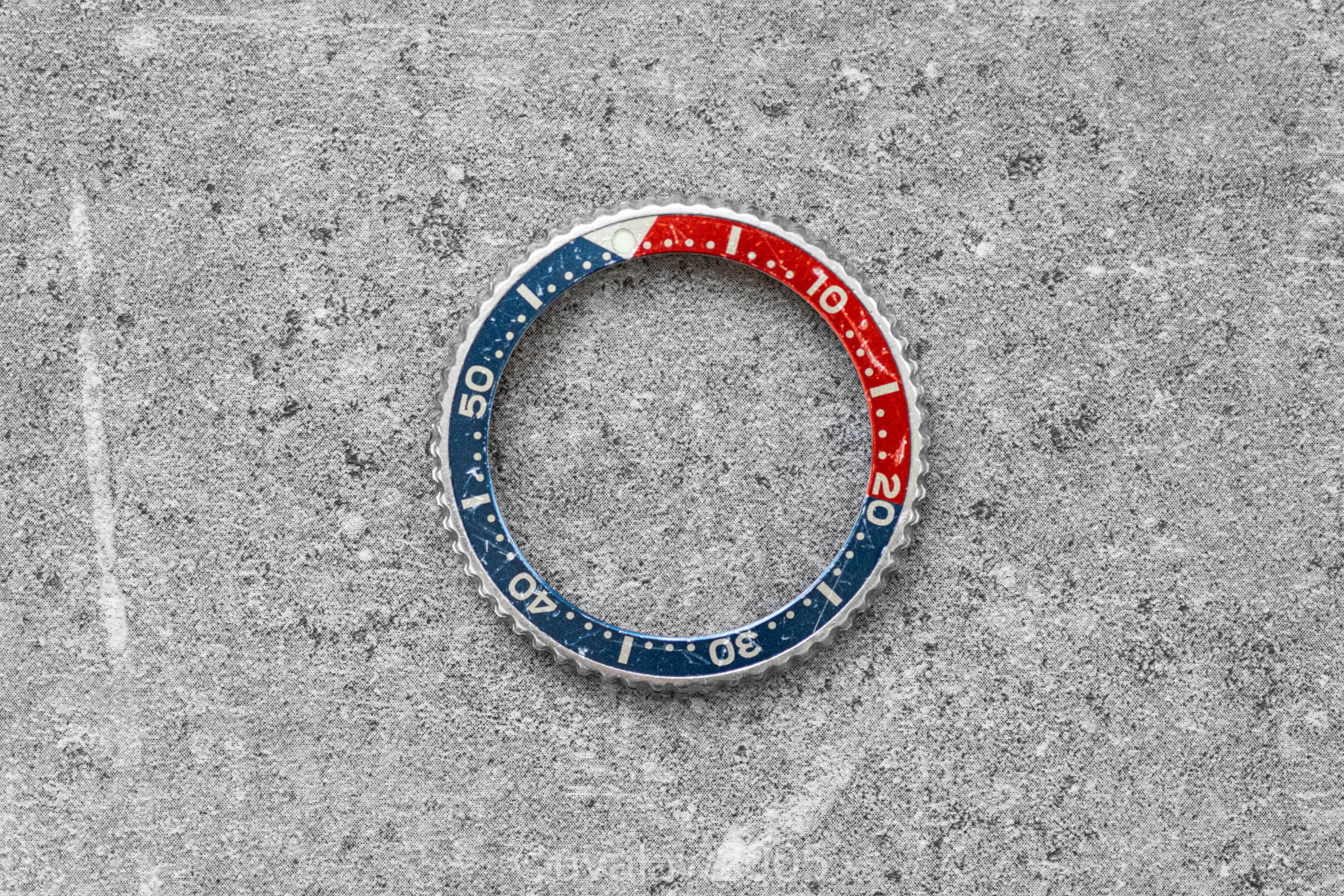 Includes two OEM bezels that can be interchanged, one black and one pepsi (the 7002-7039 had both options). Case shows wear consistent with three decades of use, but the dial and hands are in excellent condition with minimal degradation (note the silver pin dot on the dial near the 42 minute marker).
