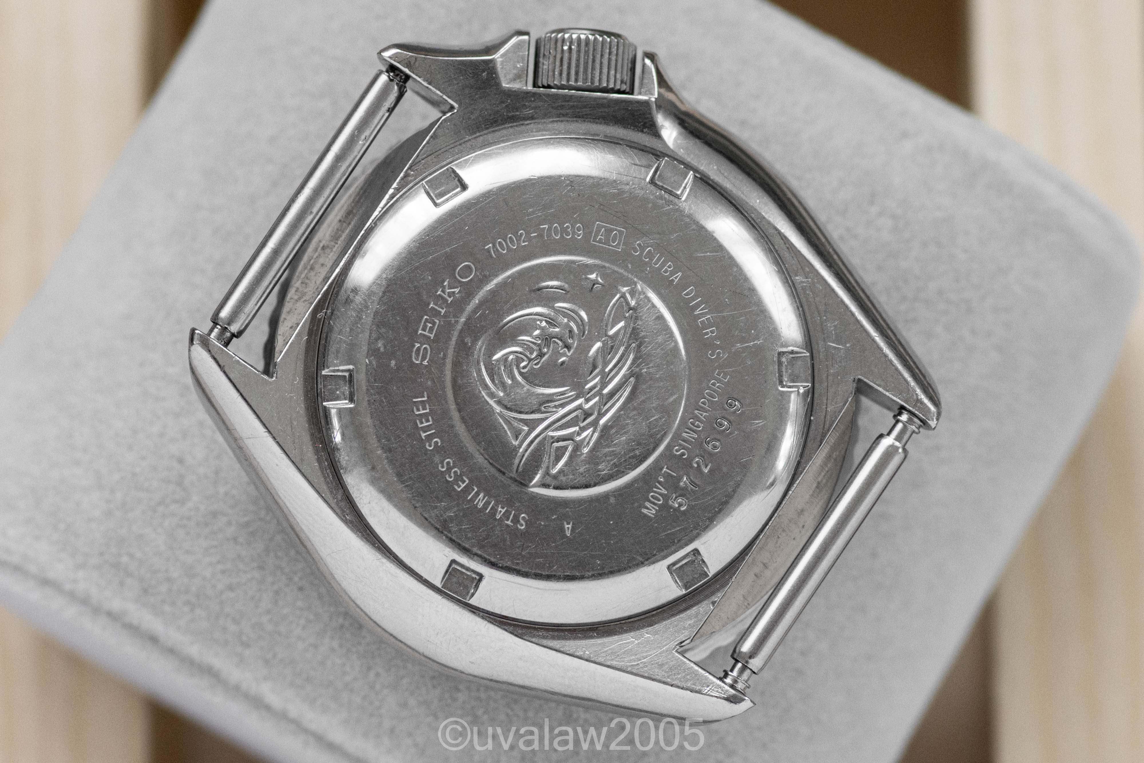 ·For sale is my 1995 Seiko 7002-7039. This is the direct precessor to the SKX, often referred to as the "transitional" model between the older 7002s and the SKX. Has a few of the older design features that I prefer to the SKX, including a true 4 o'clock crown and lollipop seconds hand, but also has the modern 120-click unidirectional bezel.