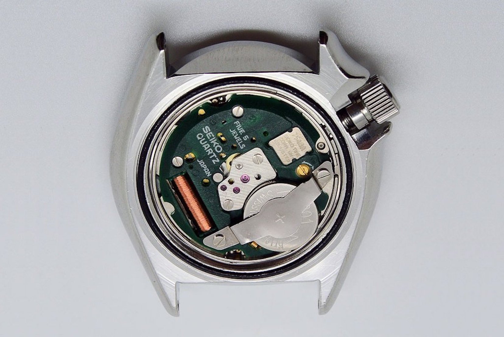 Released in 1978, a time where quartz movements were state-of-the-art, the 7548 shares many parts with the mechanical 6309 movement which were used in the Turtle. You can exchange parts between these movements. In fact, the 7548 is a 6309 with a quartz module. It’s a highly reliable movement, containing almost no plastic parts, 5 jewels and a trimming screw to adjust the speed. A high end movement in it’s time and until today one of the best quartz movements ever.