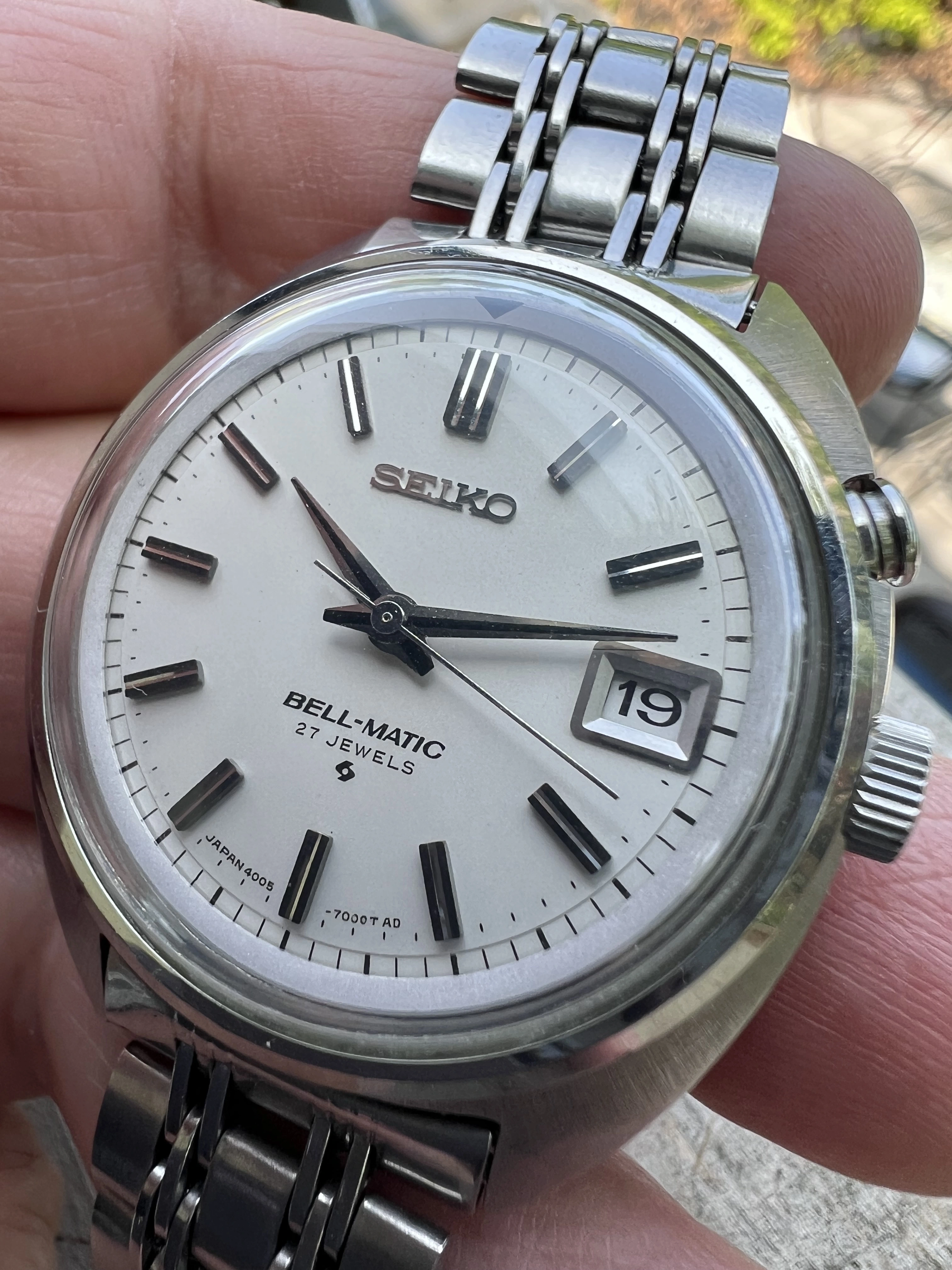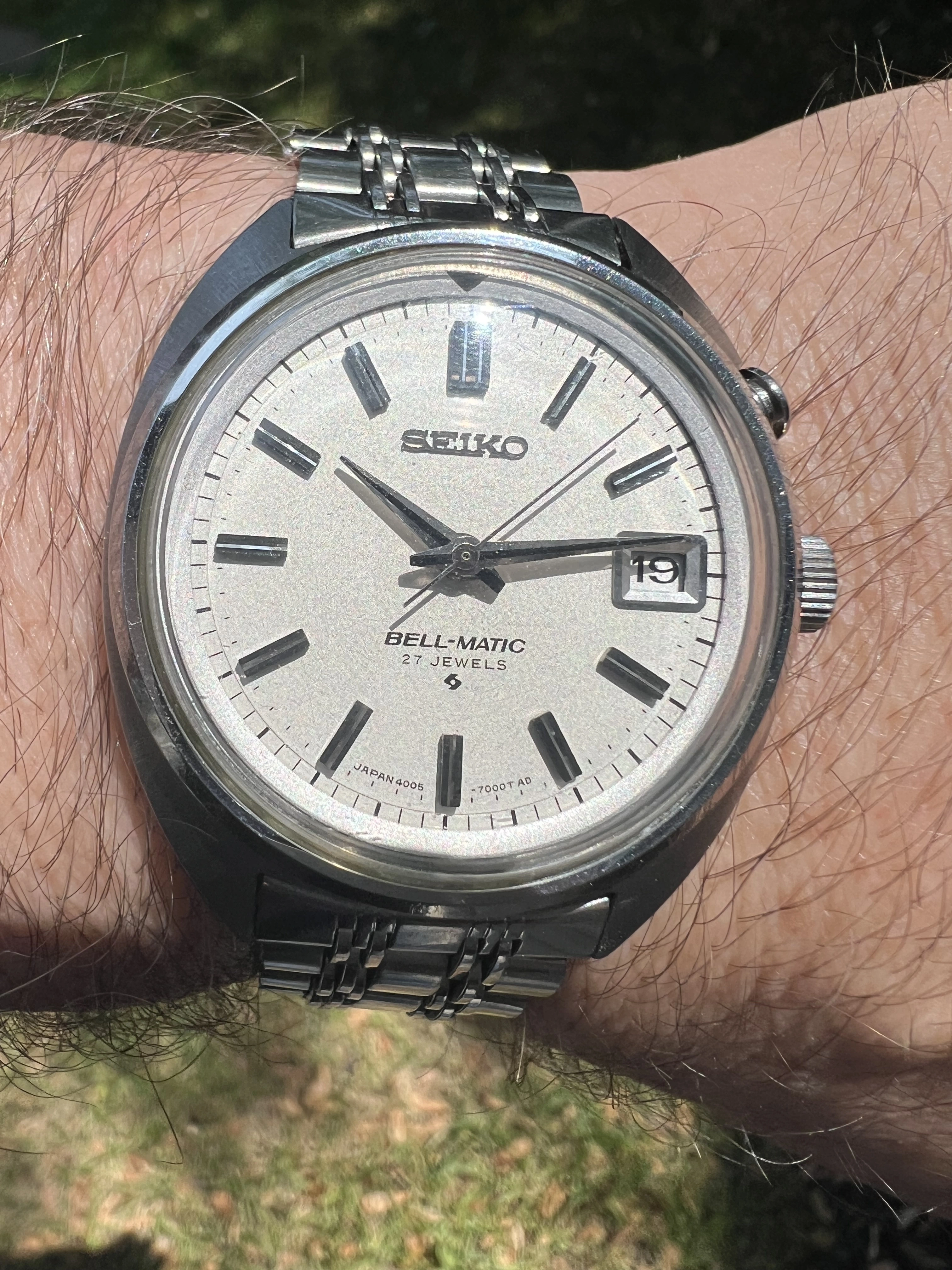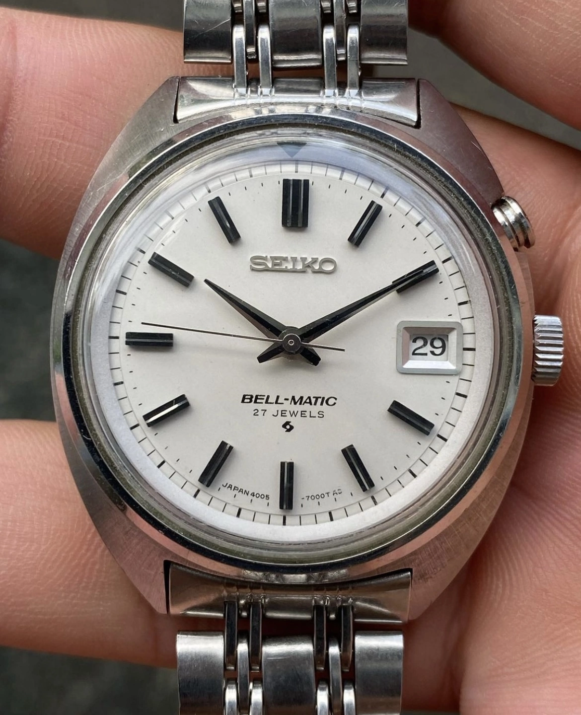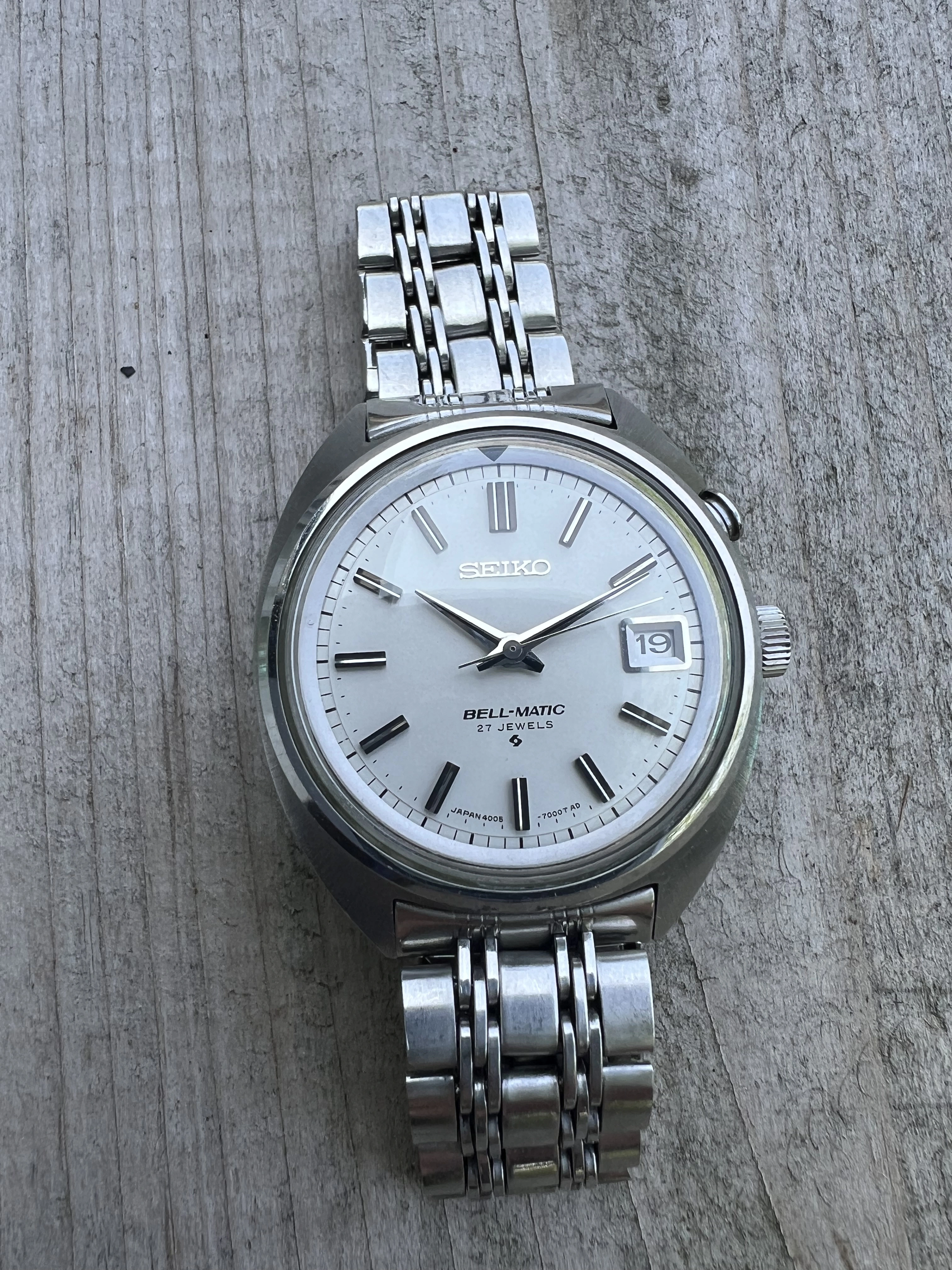 ·Seiko Bell-Matic early JDM 27J 4005-7000 date only reference from Jan 1969. Working well in excellent condition with original radial case brushing, unpolished. With original rail steel bracelet signed 4005 700 in very good condition.