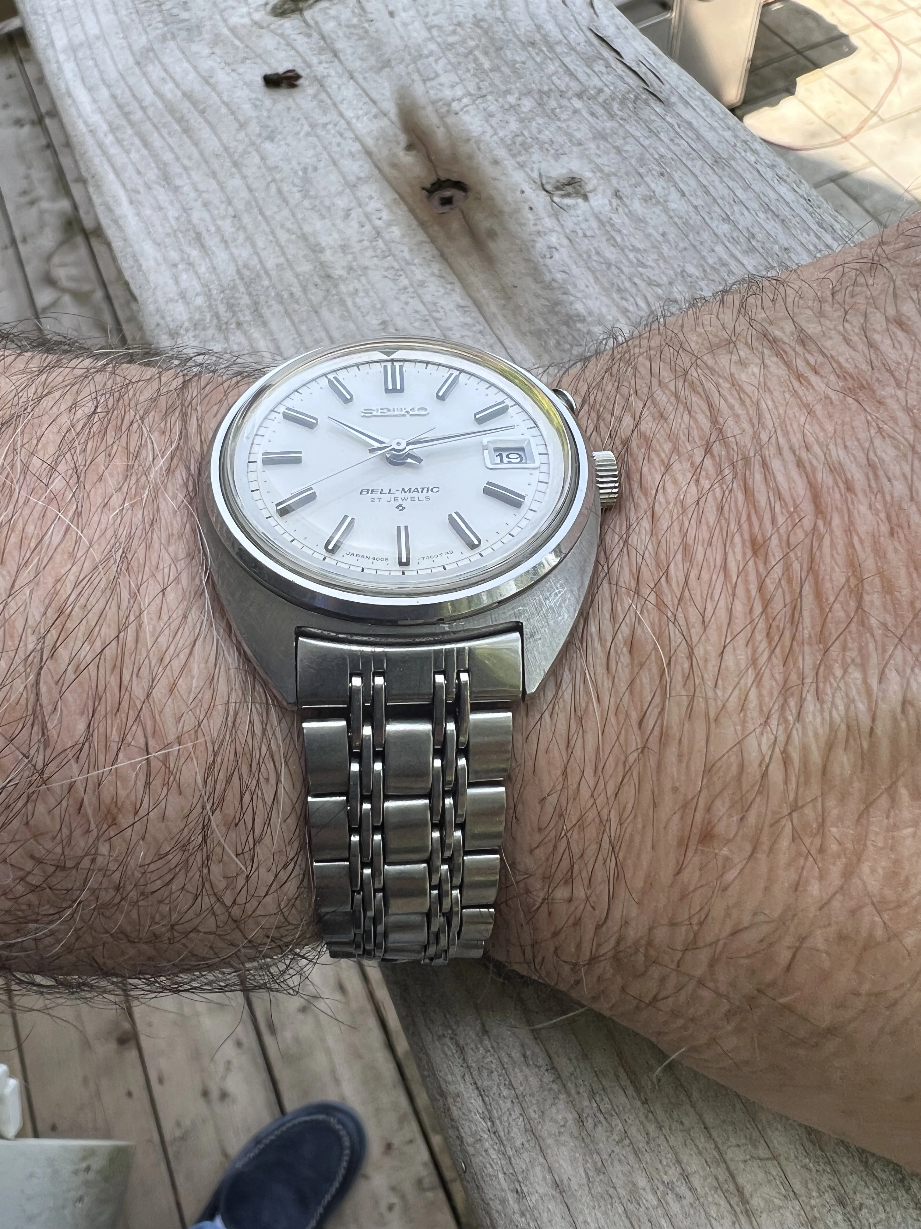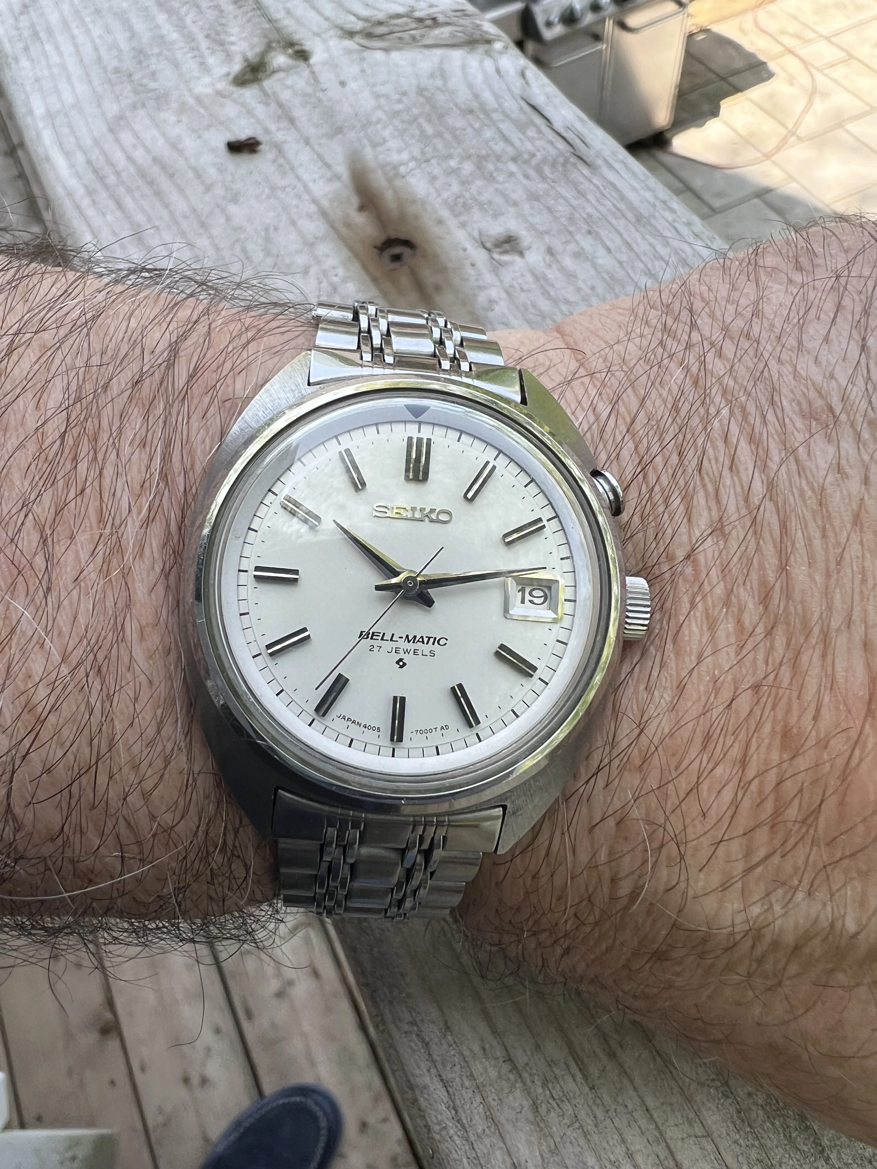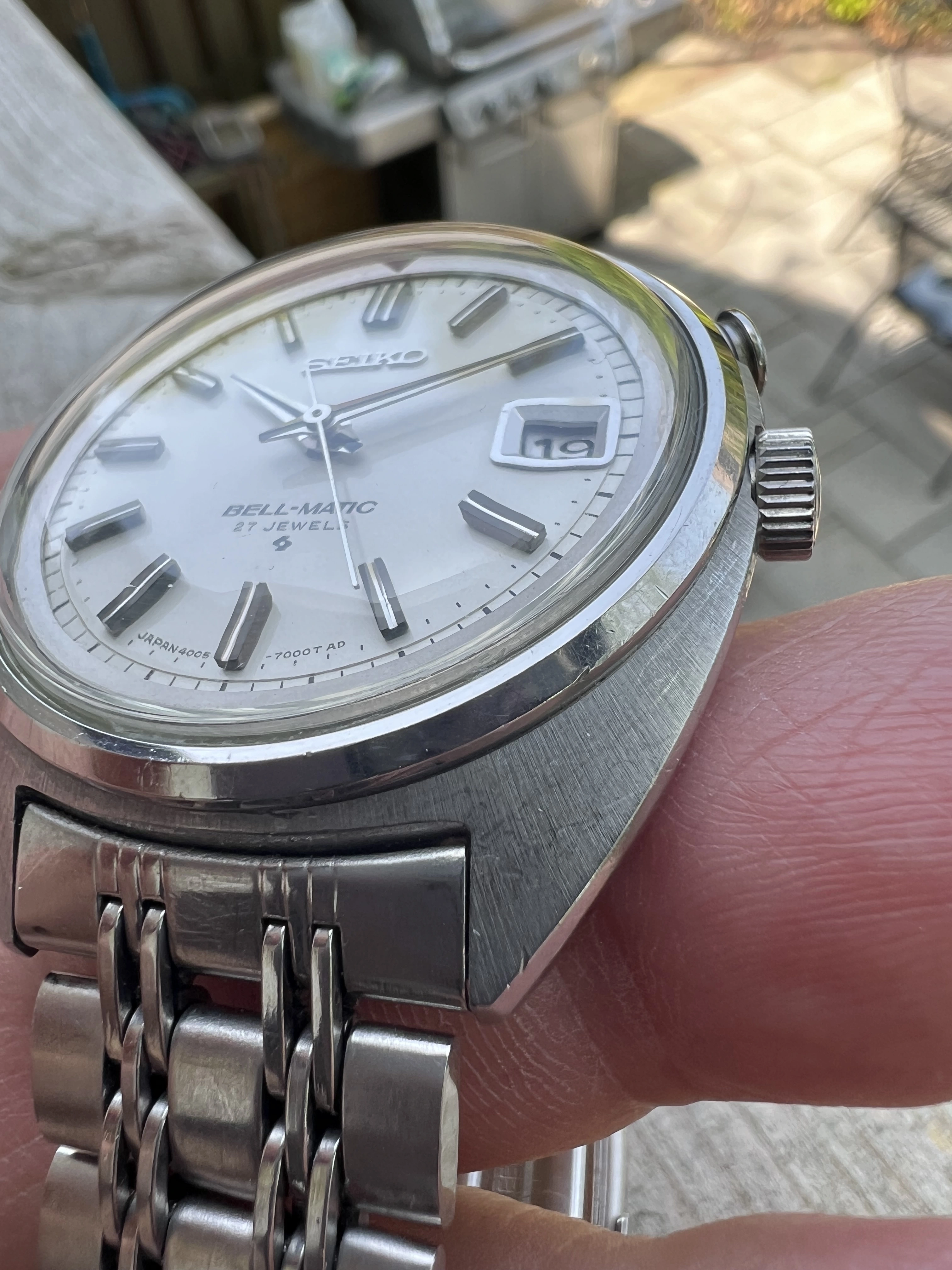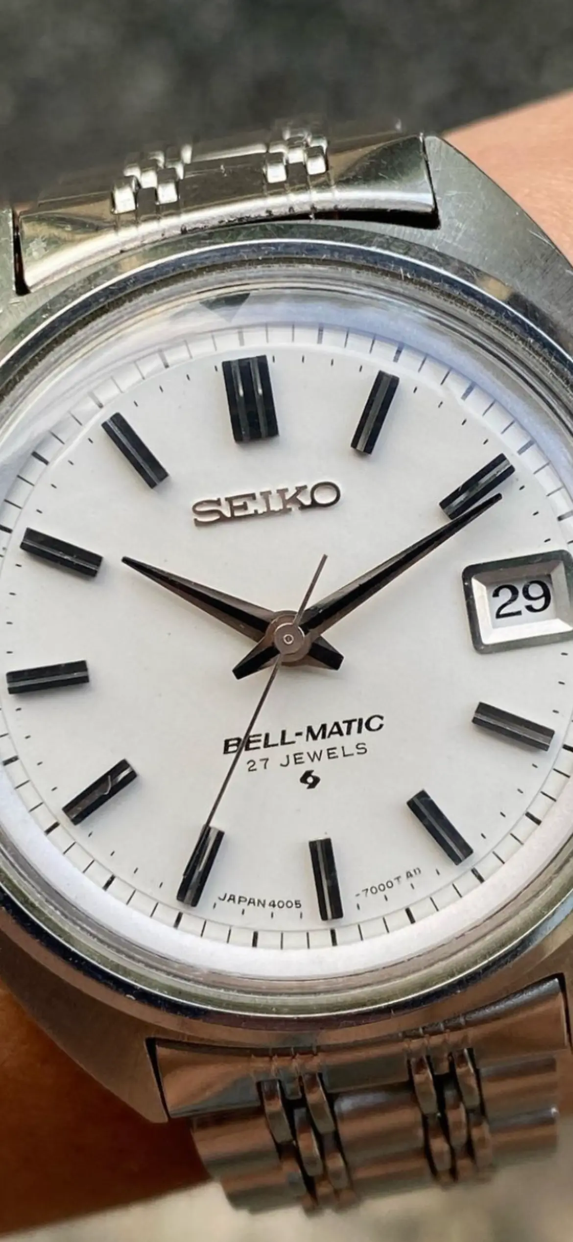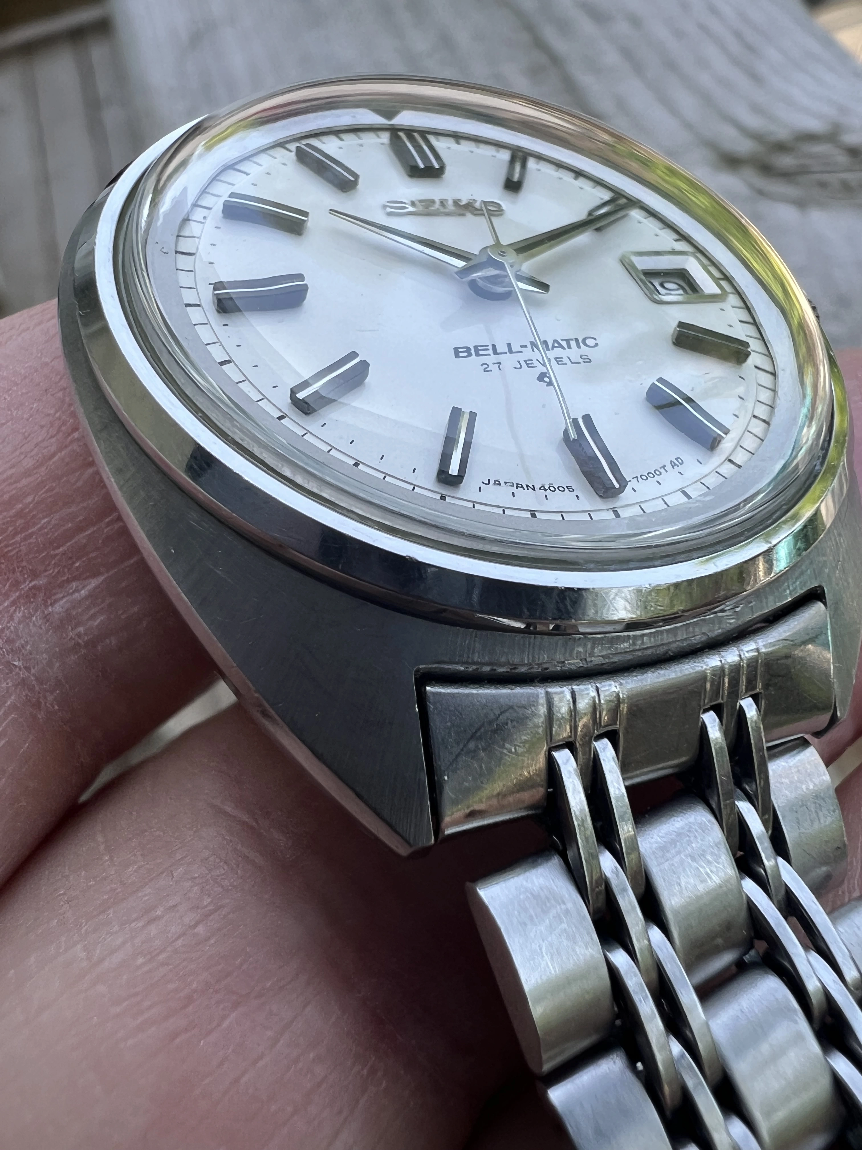 ·Seiko Bell-Matic early JDM 27J 4005-7000 date only reference from Jan 1969. Working well in excellent condition with original radial case brushing, unpolished. With original rail steel bracelet signed 4005 700 in very good condition.