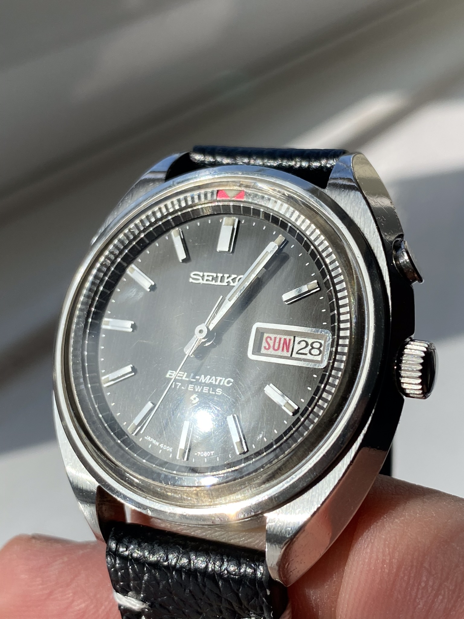 ·From 1969 and I believe one of the earliest 17 jewel timepieces this lovely mechanical alarm watch is in great condition for its age. There is a very small mark at 6pm on the case. All functions are working including the lovely mechanical alarm. In a contemporary 38mm case this has a modern feel. The dial is an incredible sunburst graphite and changes from silver to black depending on the light. The inner bezel alarm marker is in unusually sharp condition.