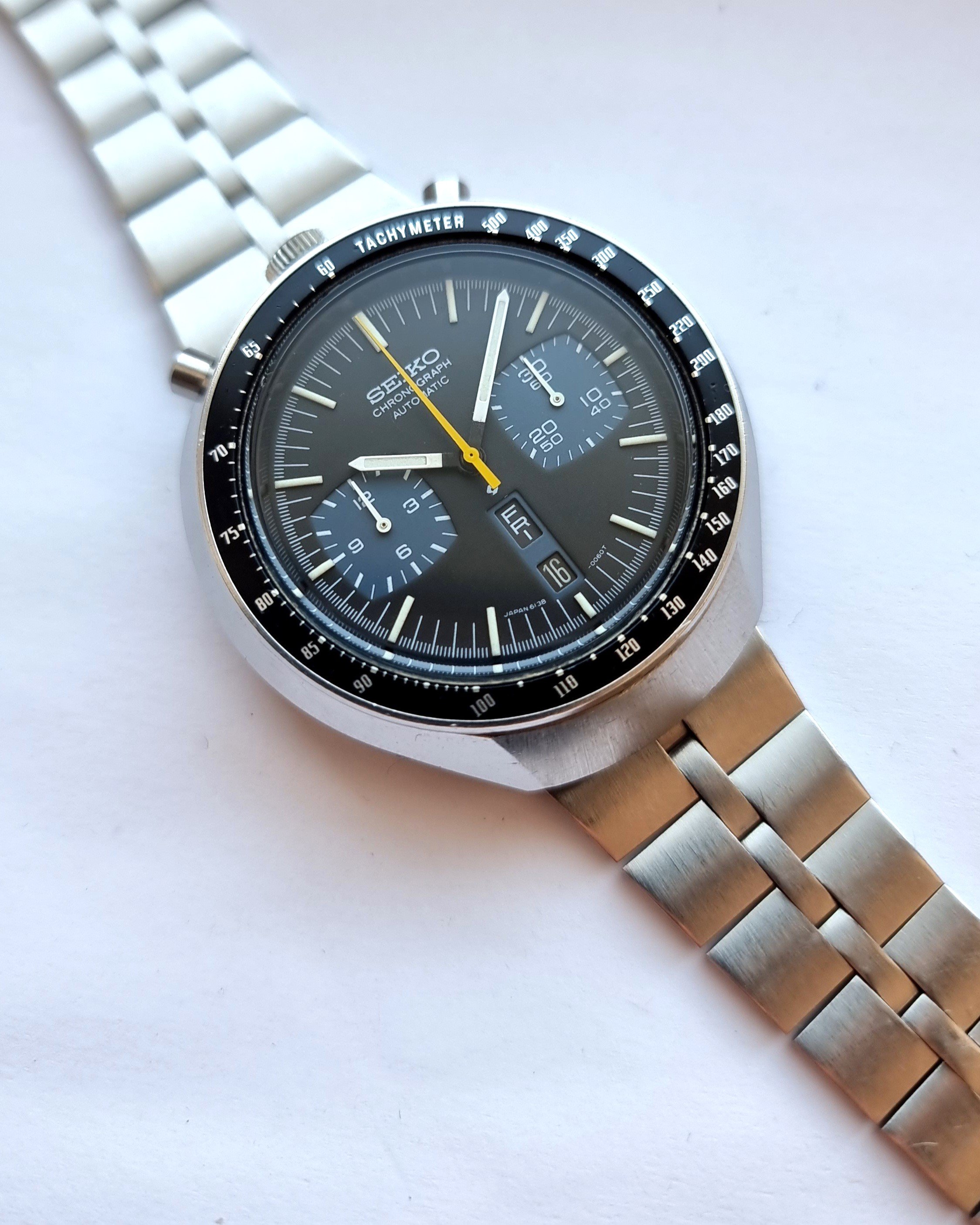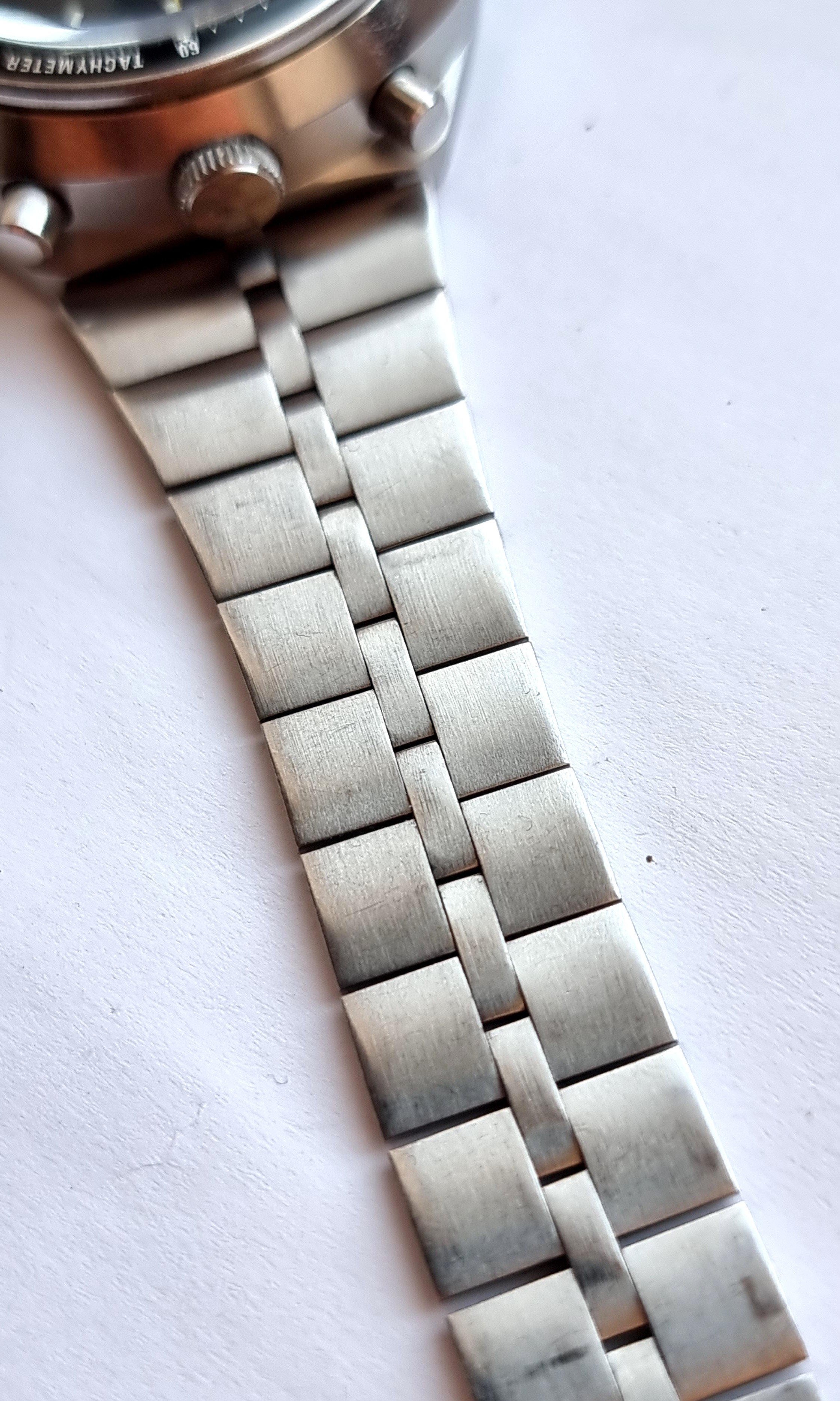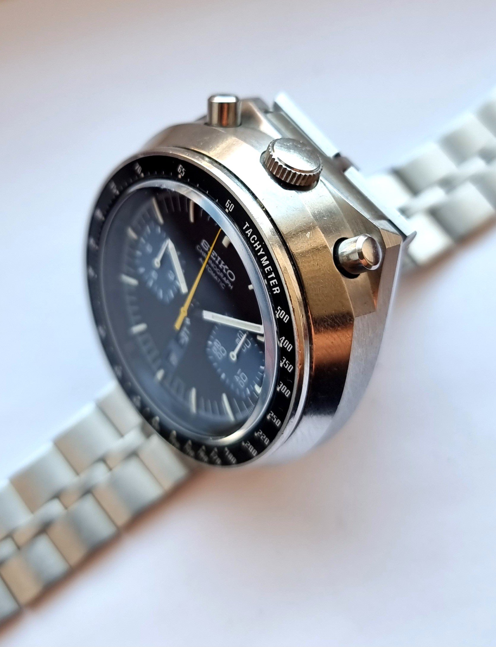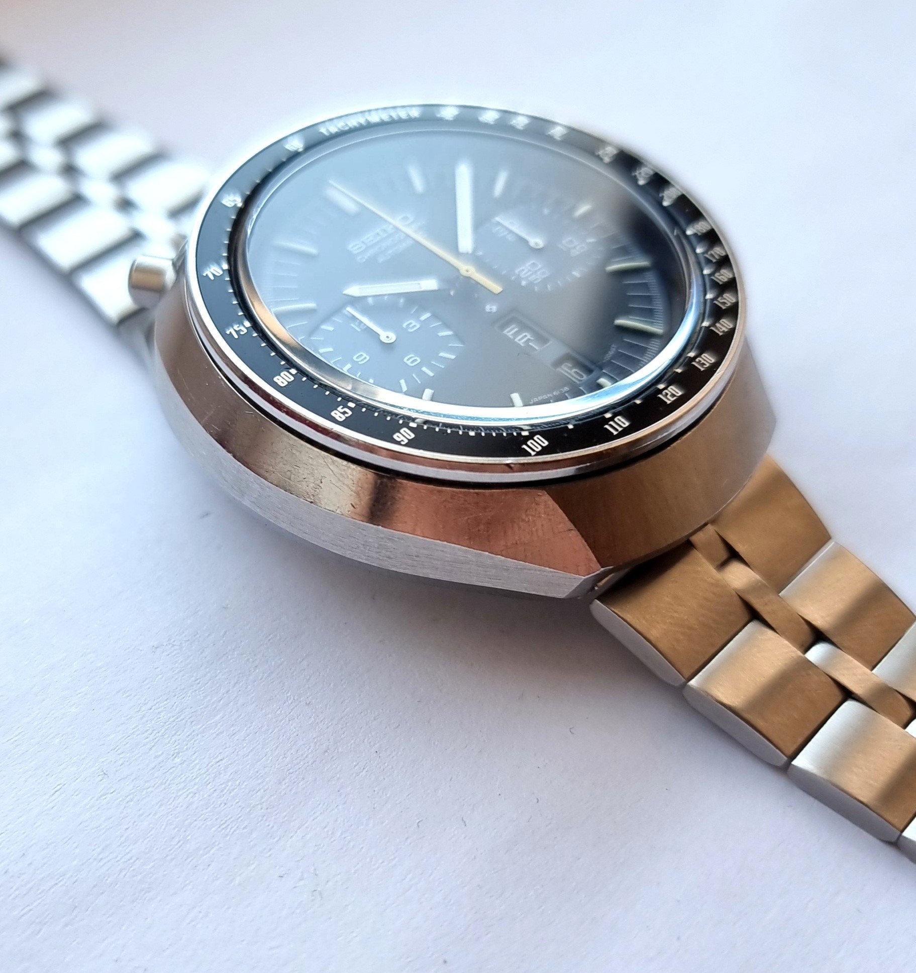 The Japan 6138 -0060 T dial is original, as are the hands. All lume is intact and unmarked. Bracelet is original fishbone with Z040s end links. Caseback serial 704836, dating the watch to October 1977. Original black bezel with TACHYMETER 500. Date wheel is English/Kanji. Original mineral glass without any scratches or chips.