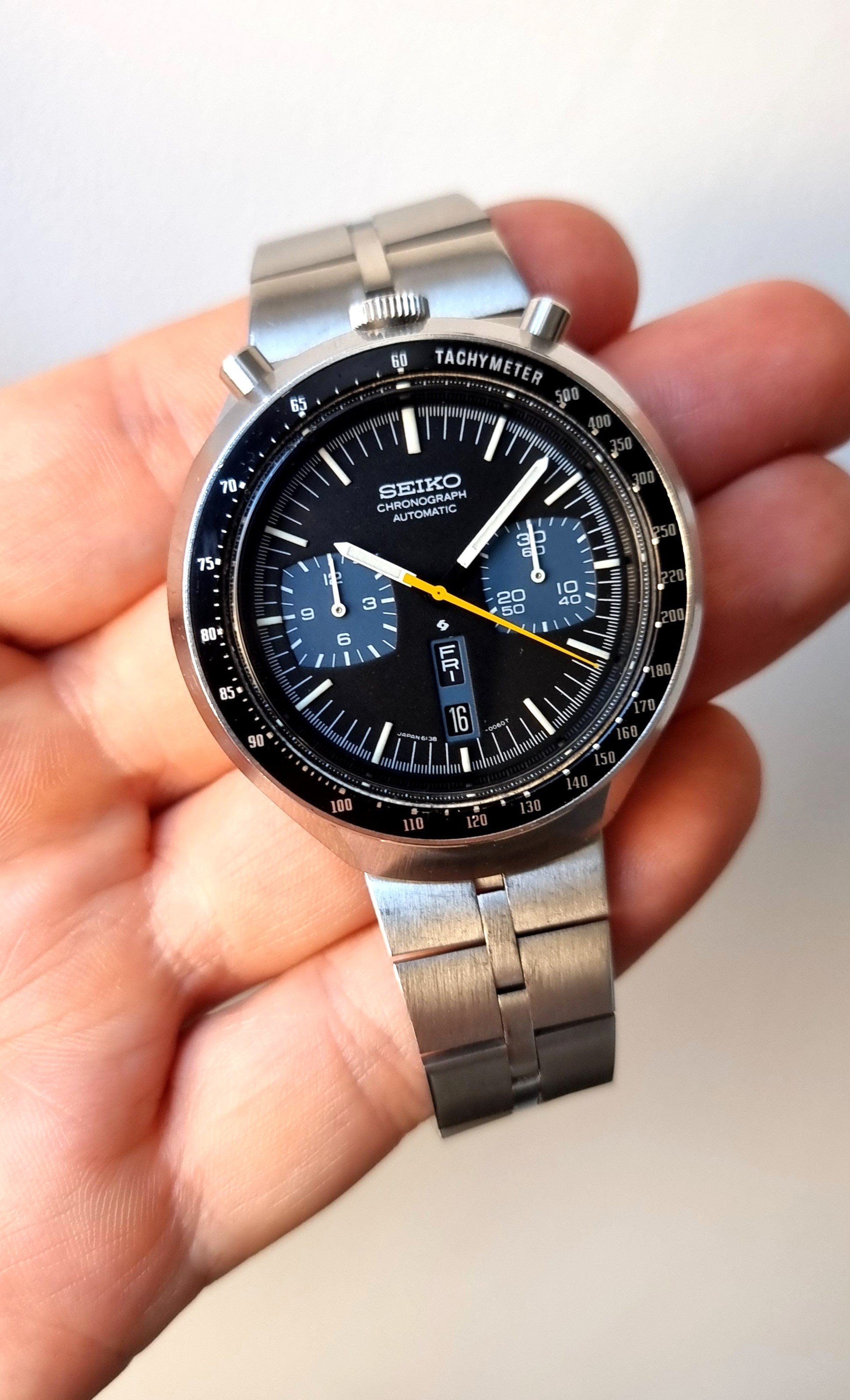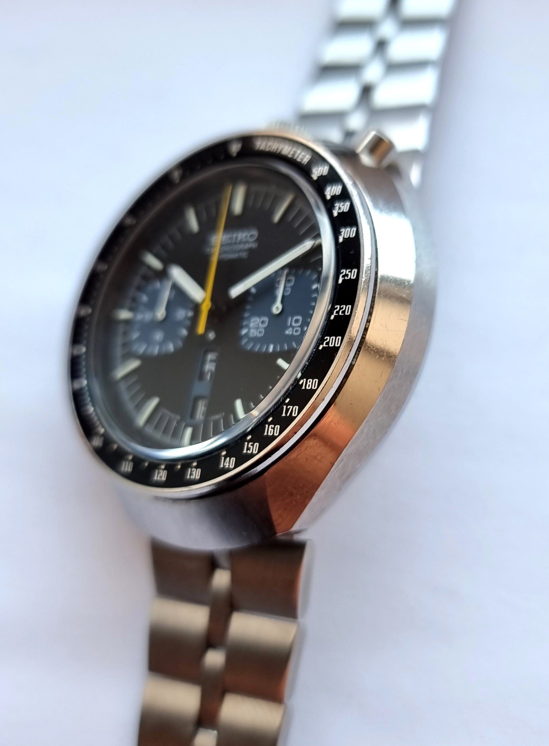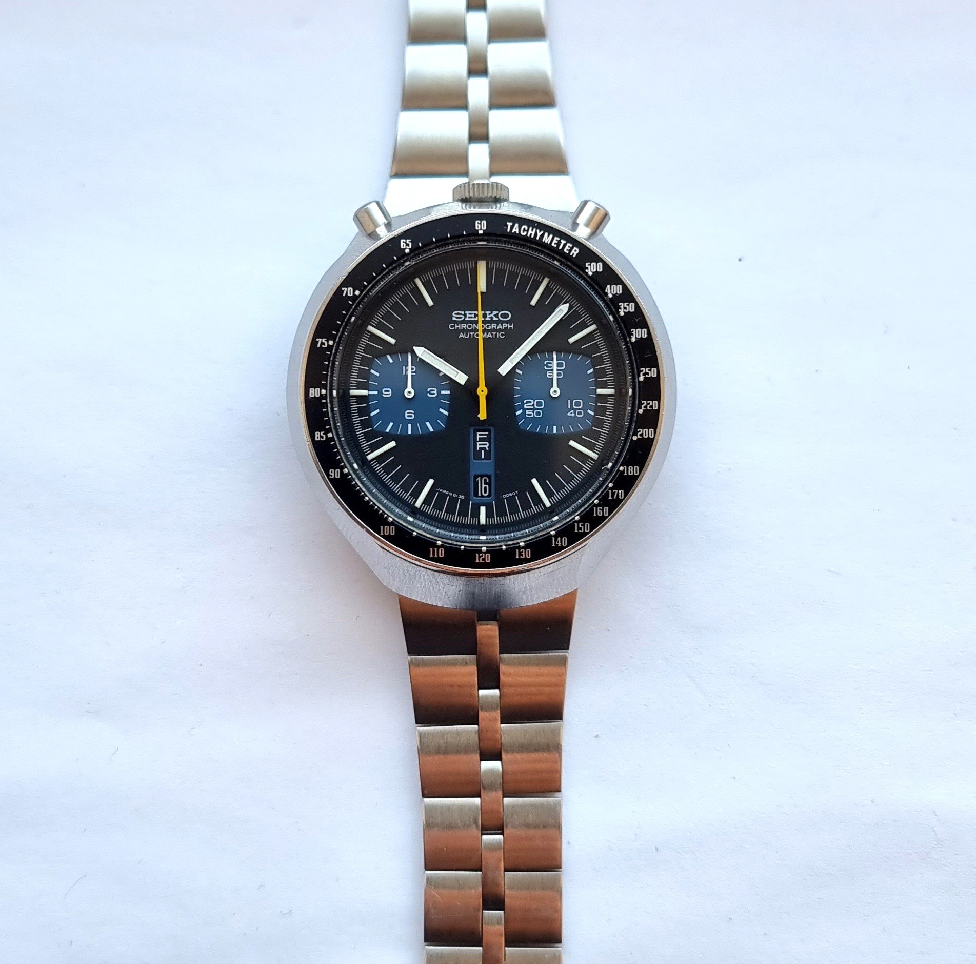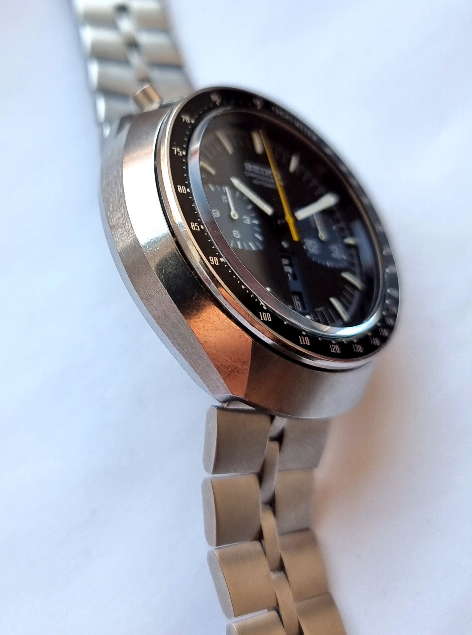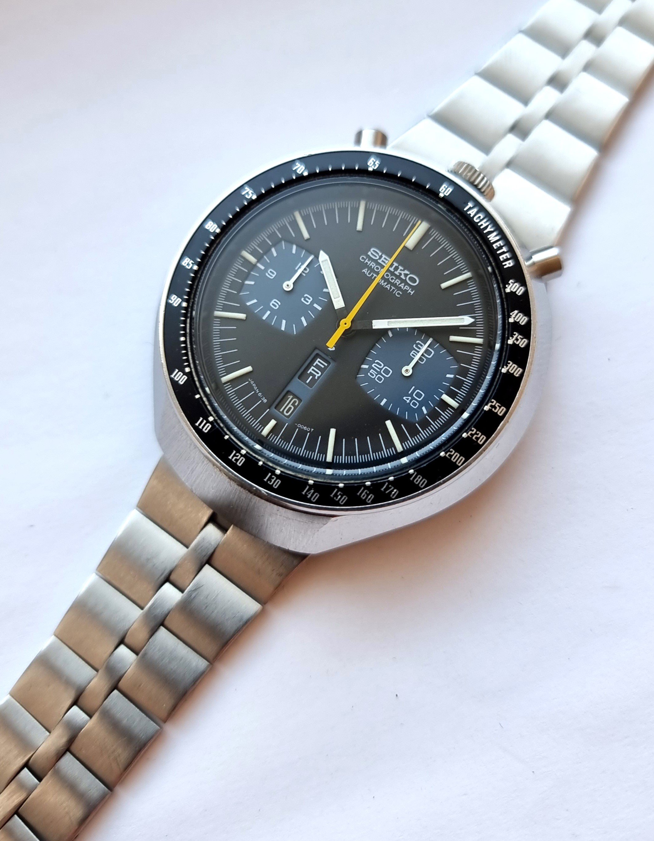 The Japan 6138 -0060 T dial is original, as are the hands. All lume is intact and unmarked. Bracelet is original fishbone with Z040s end links. Caseback serial 704836, dating the watch to October 1977. Original black bezel with TACHYMETER 500. Date wheel is English/Kanji. Original mineral glass without any scratches or chips.