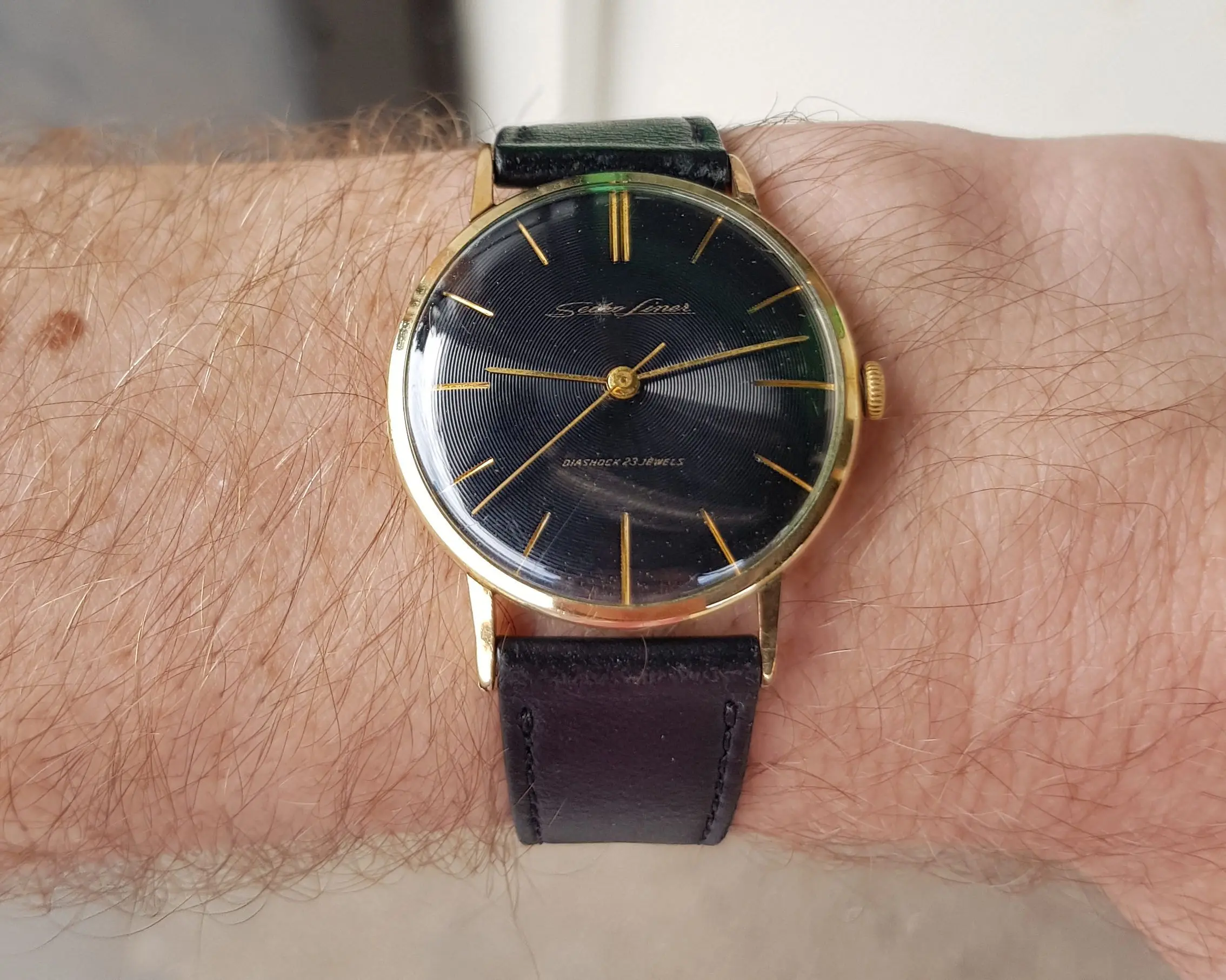 Love these early Seiko watches. This movement was an early water resistant super thin model. Your reference J14069 had this unusual black vinyl dial, but the absence of any print on your dial suggests it was repainted/overpainted at some point. Some references below. Liner was only produced for couple of years early 60s as mid level model below the GS First.