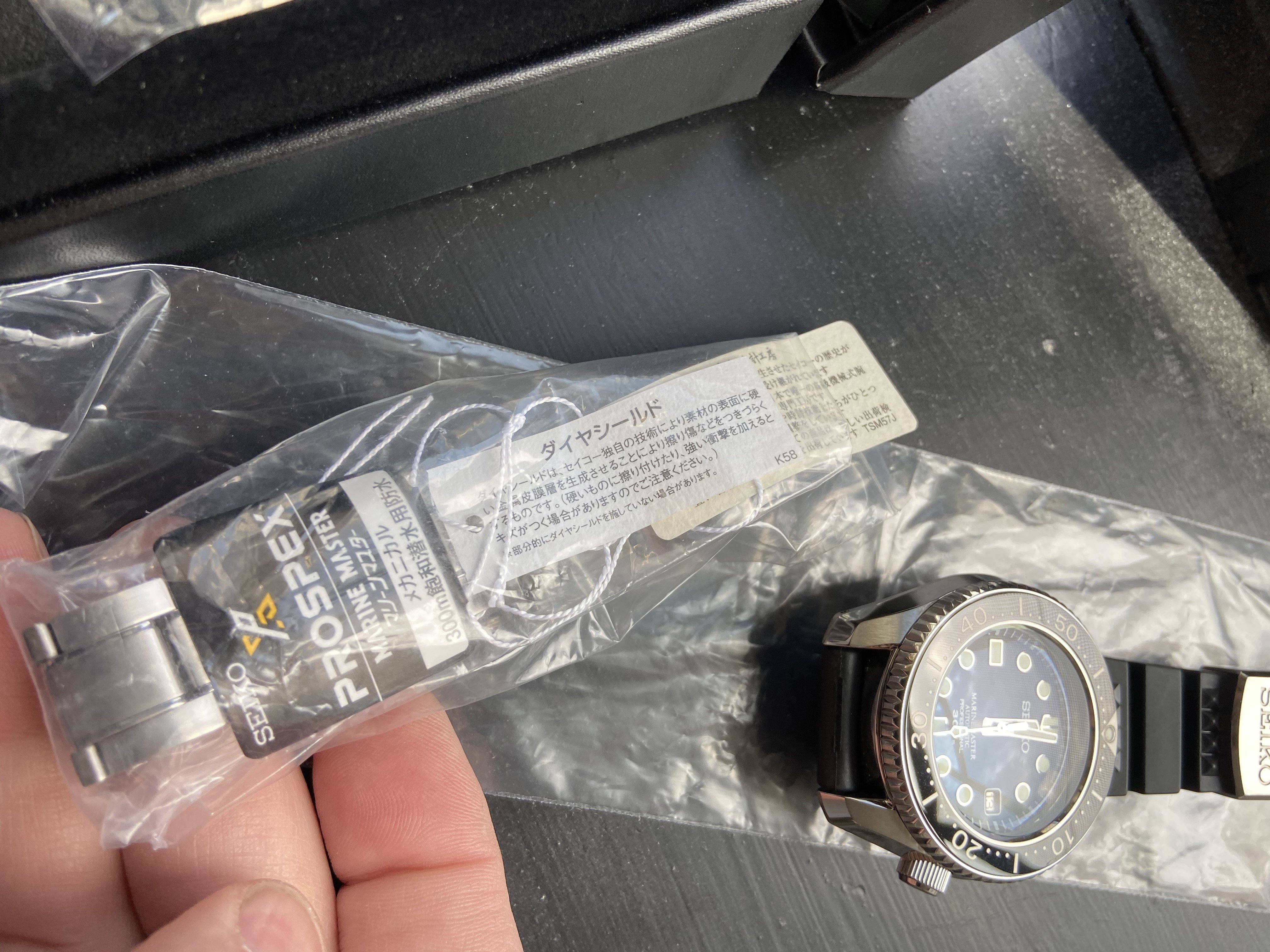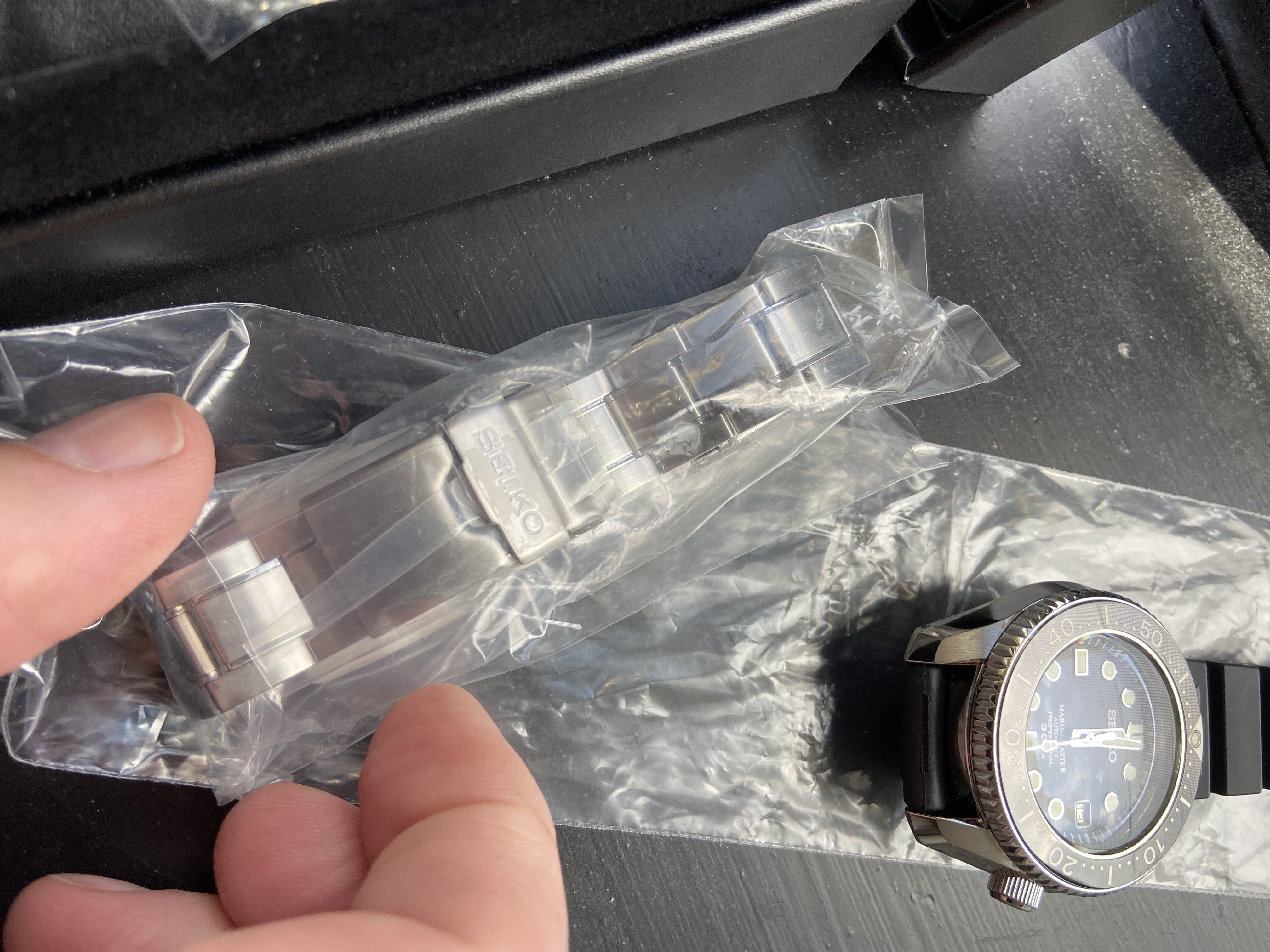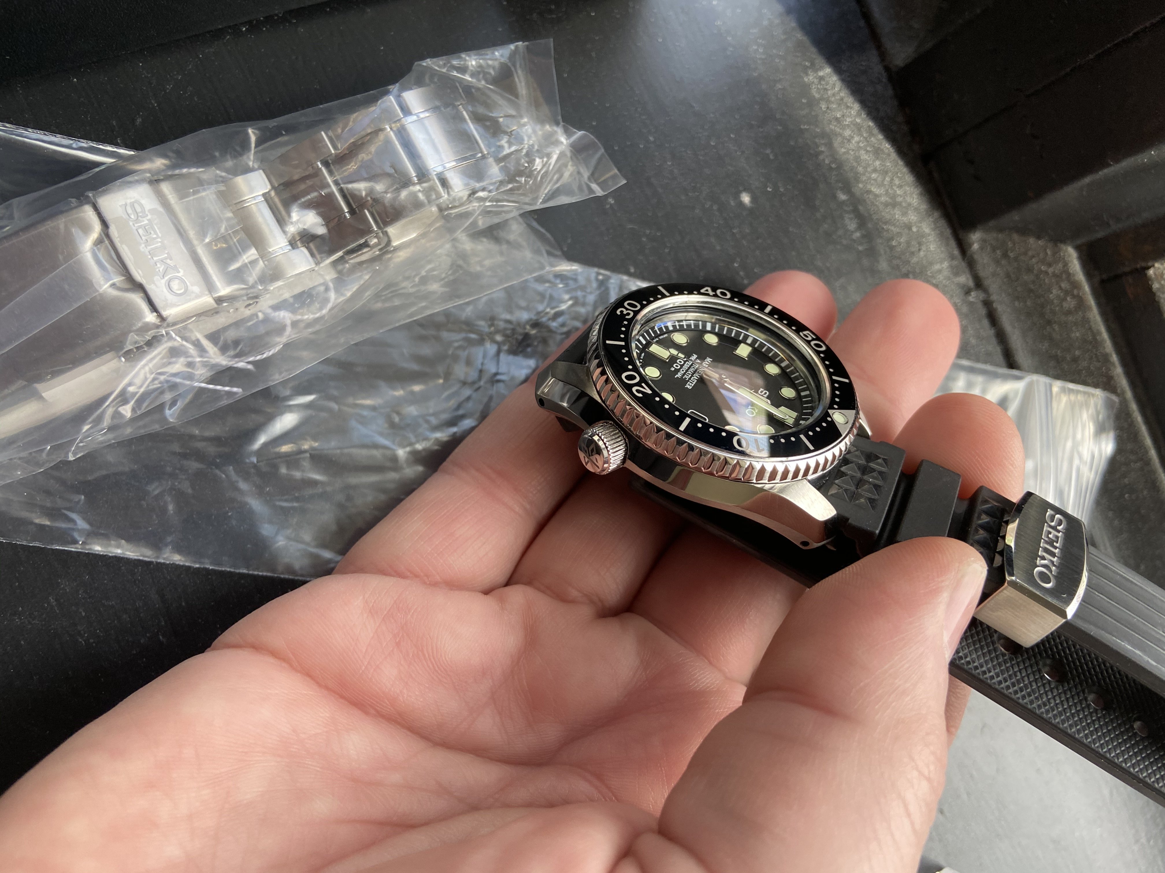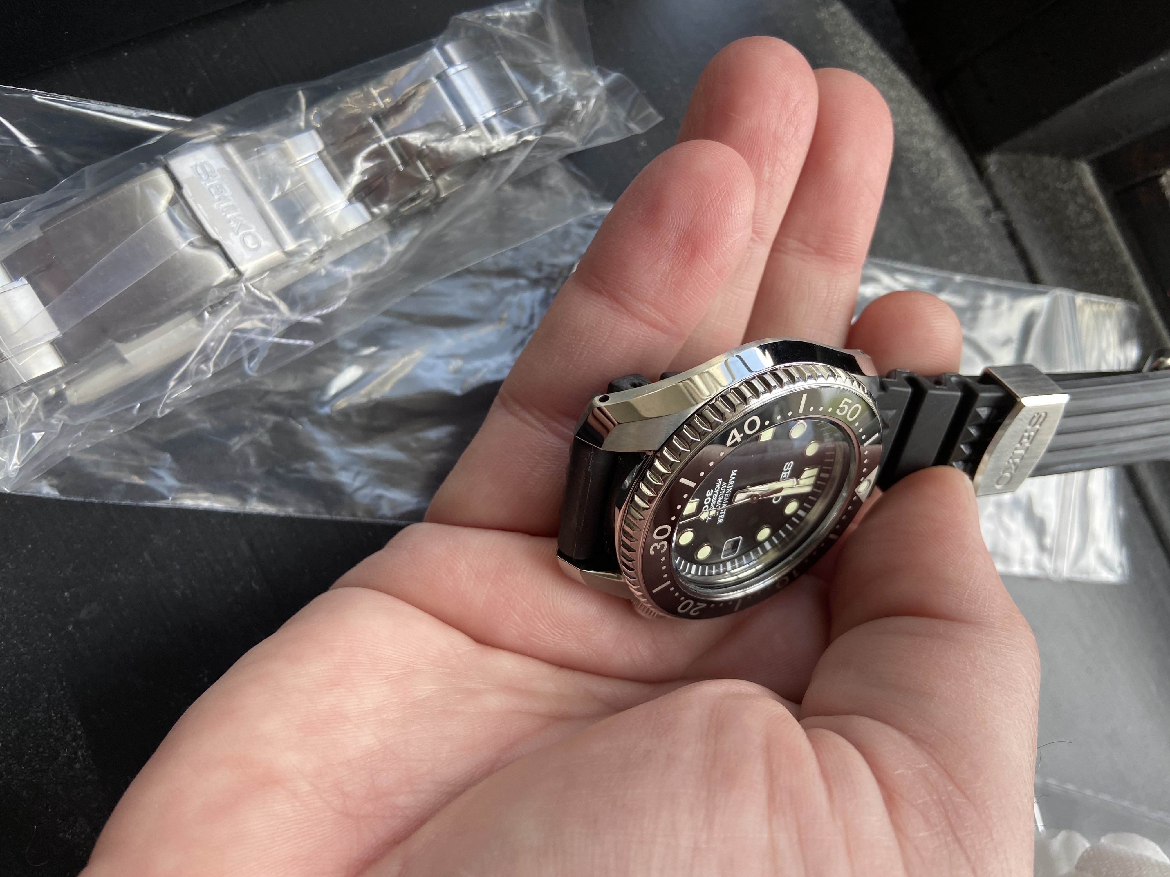 Basically NOS MM300 The bracelet and seiko rubber are unused. The bracelet was rmoved from the watch and the strap installed. Looks like it was never worn, buckle and keeper looks perfect . The clasp still wrapped in plastic ... Keeps great time as it has the 8L35 Automatic movement ( an underfinished version of the Grand Seiko 9S55 movement. I took pics at odd angles to show any wear or micro scratches which I cant seem to find all papers/ hang tags box included.