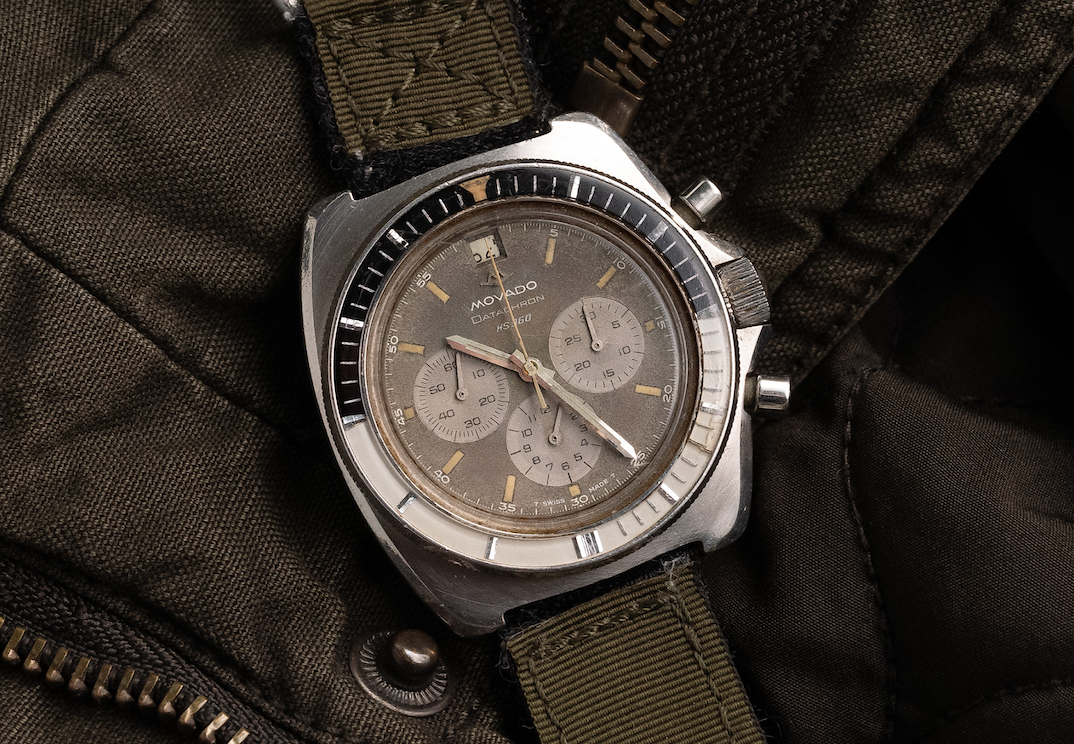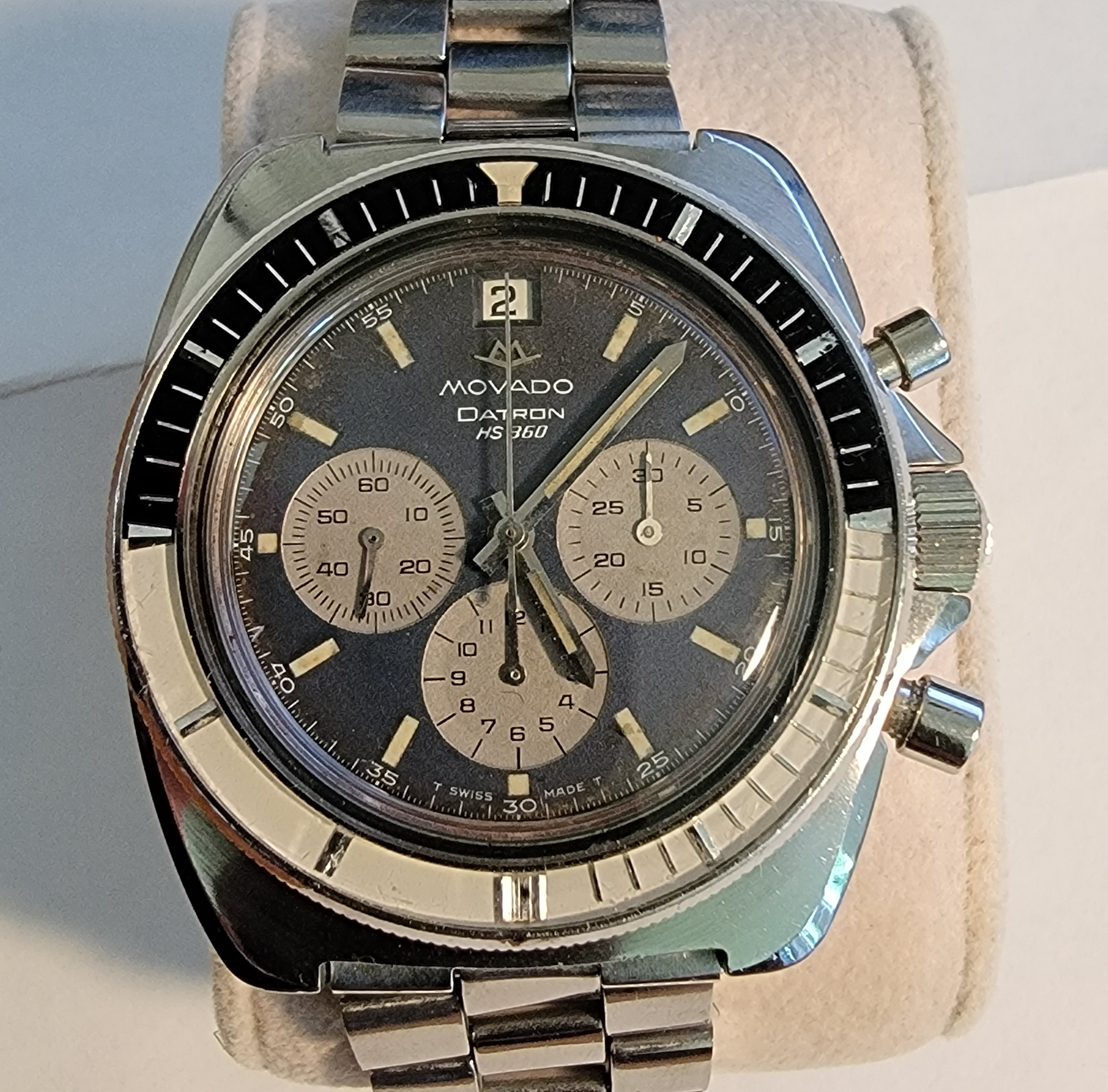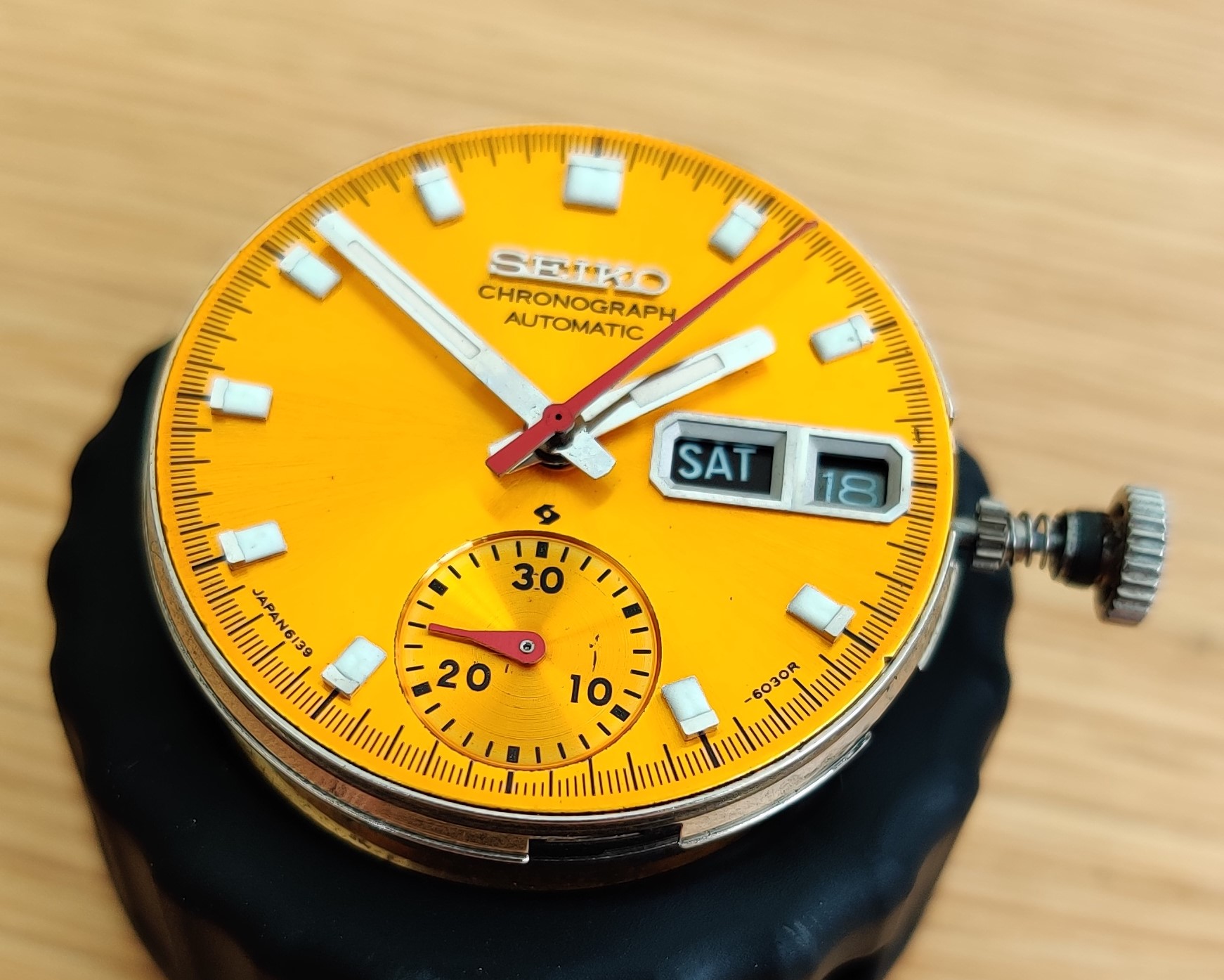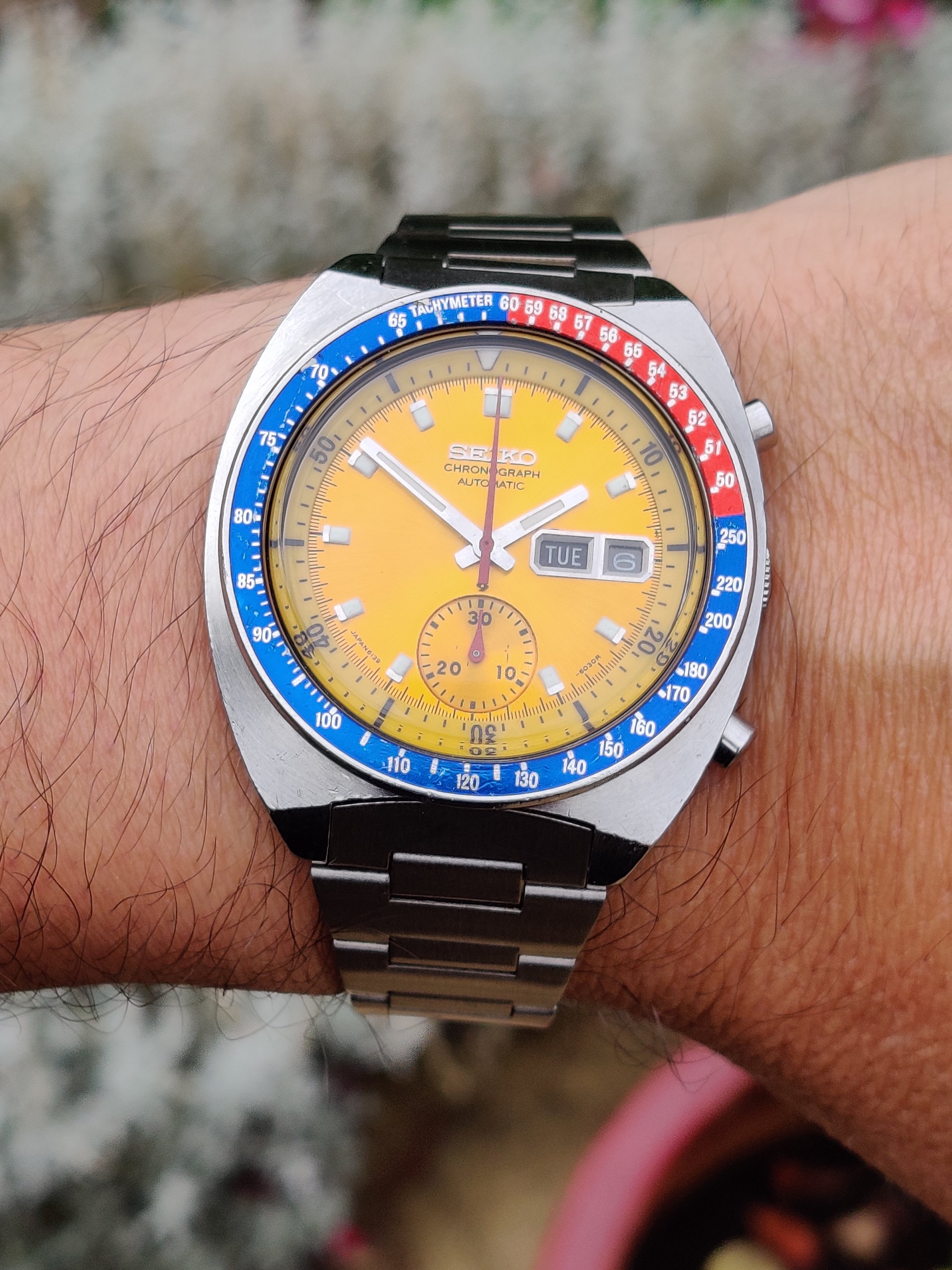 To come back to the OP watch, certainly an older AM dial and bracelet, outer bezel... and the chrono hands look a bit dicey to me too. Here's a naked May '75 6030R dial for comparison...