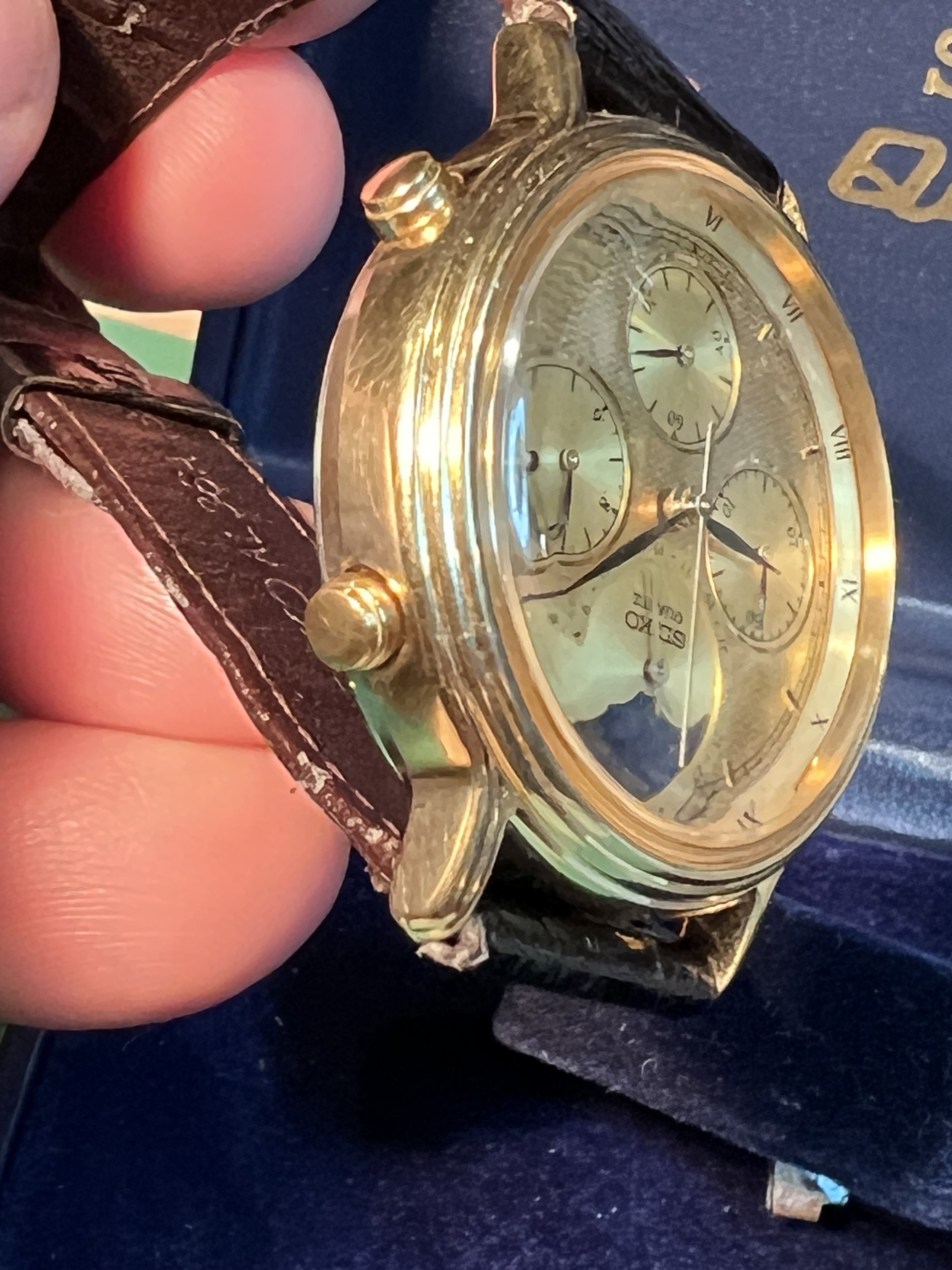 Dial: All gold with 4 subdials, 3:00 subdial shows tenths of seconds, 6:00 subdial seconds counter, 9:00 subdial 30 min counter, and 12:00 subdial is the Moonphase with hand showing the Day and gold Moon that glides across the starry sky over 29 days moonphase . Dial in excellent condition no scratches or marks seen