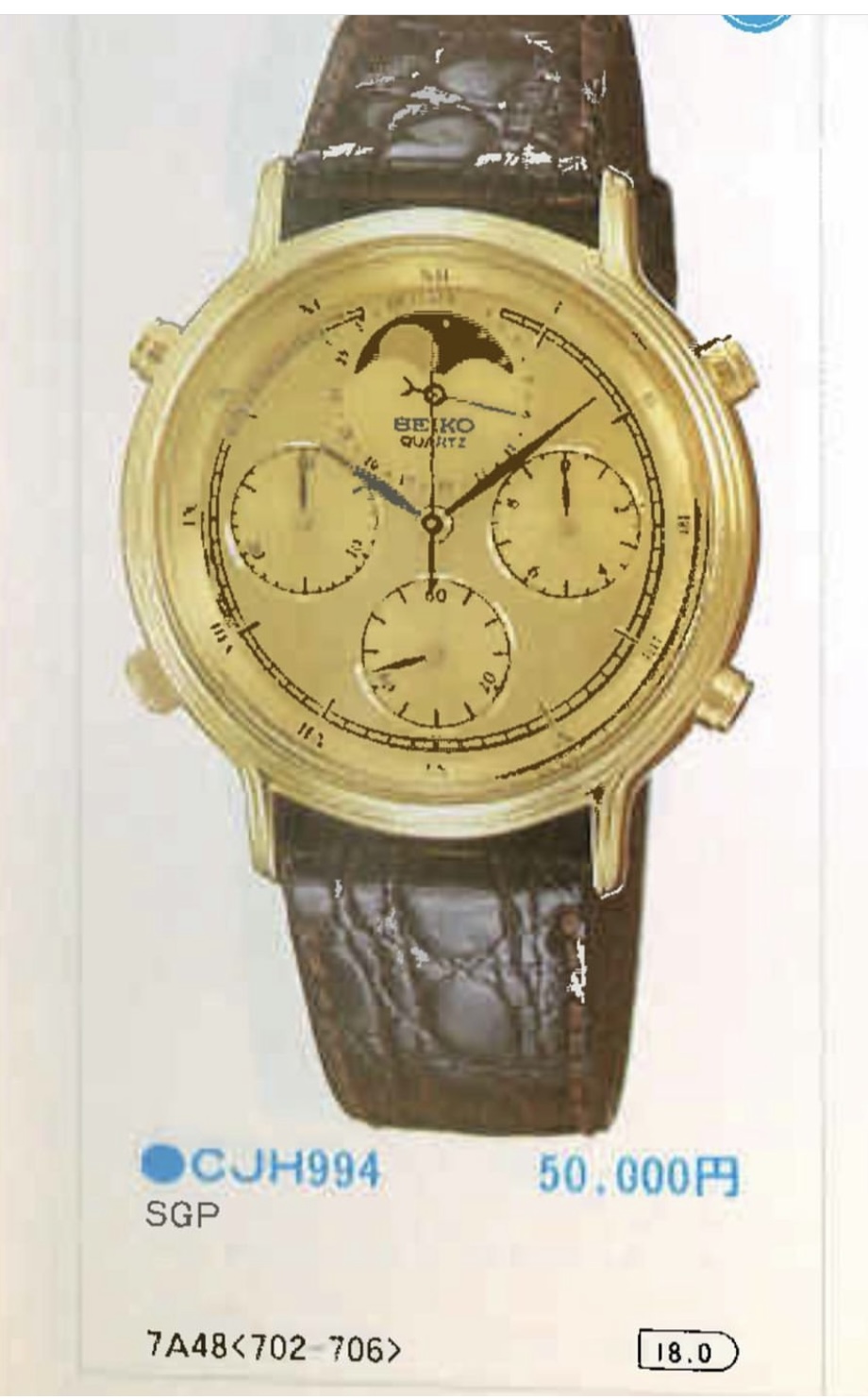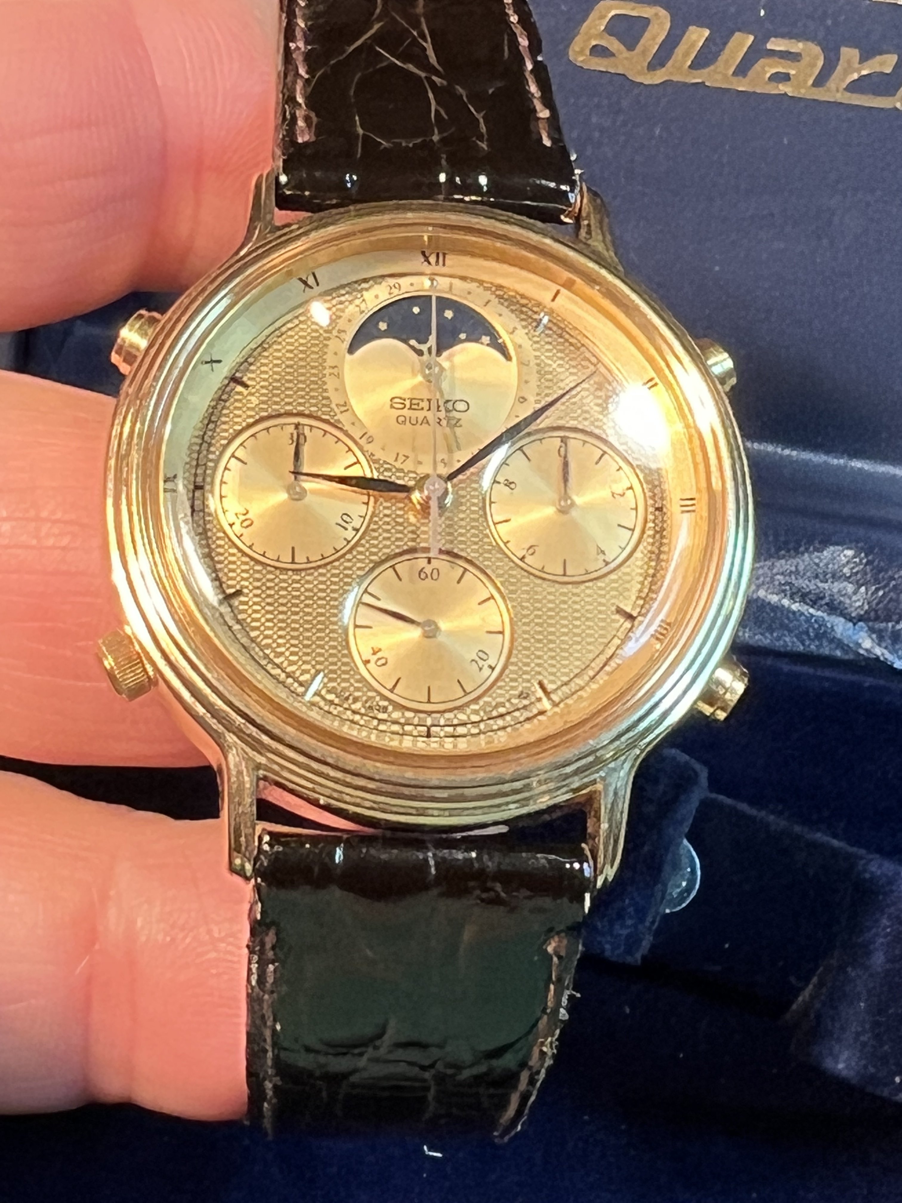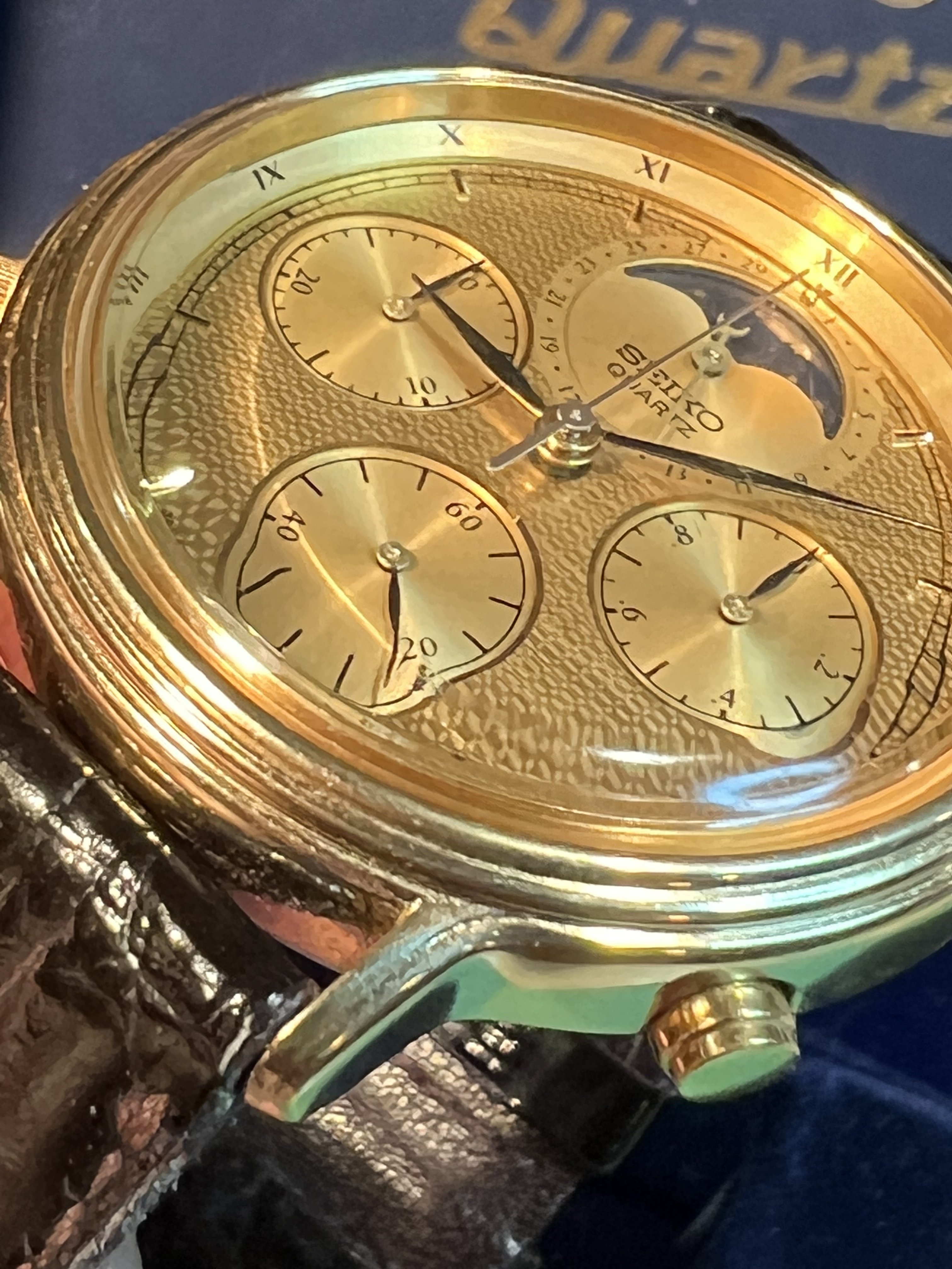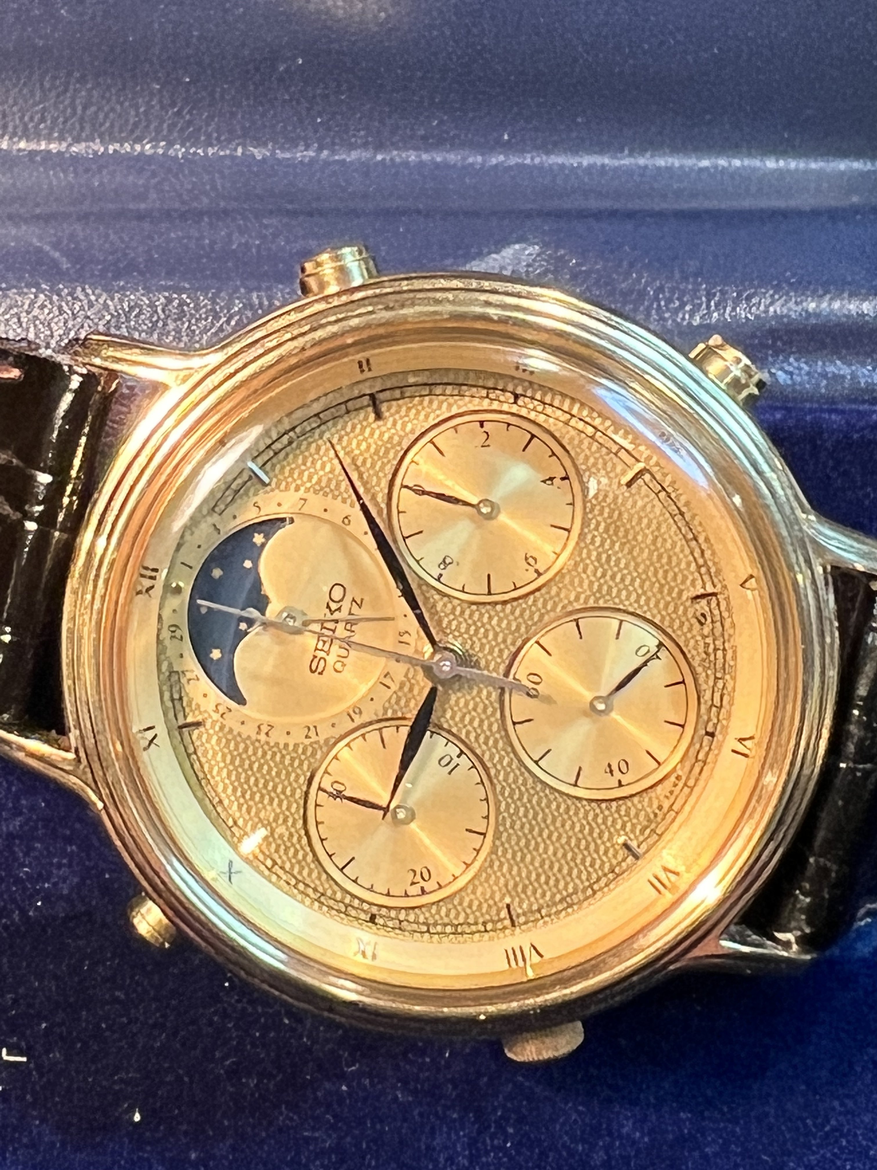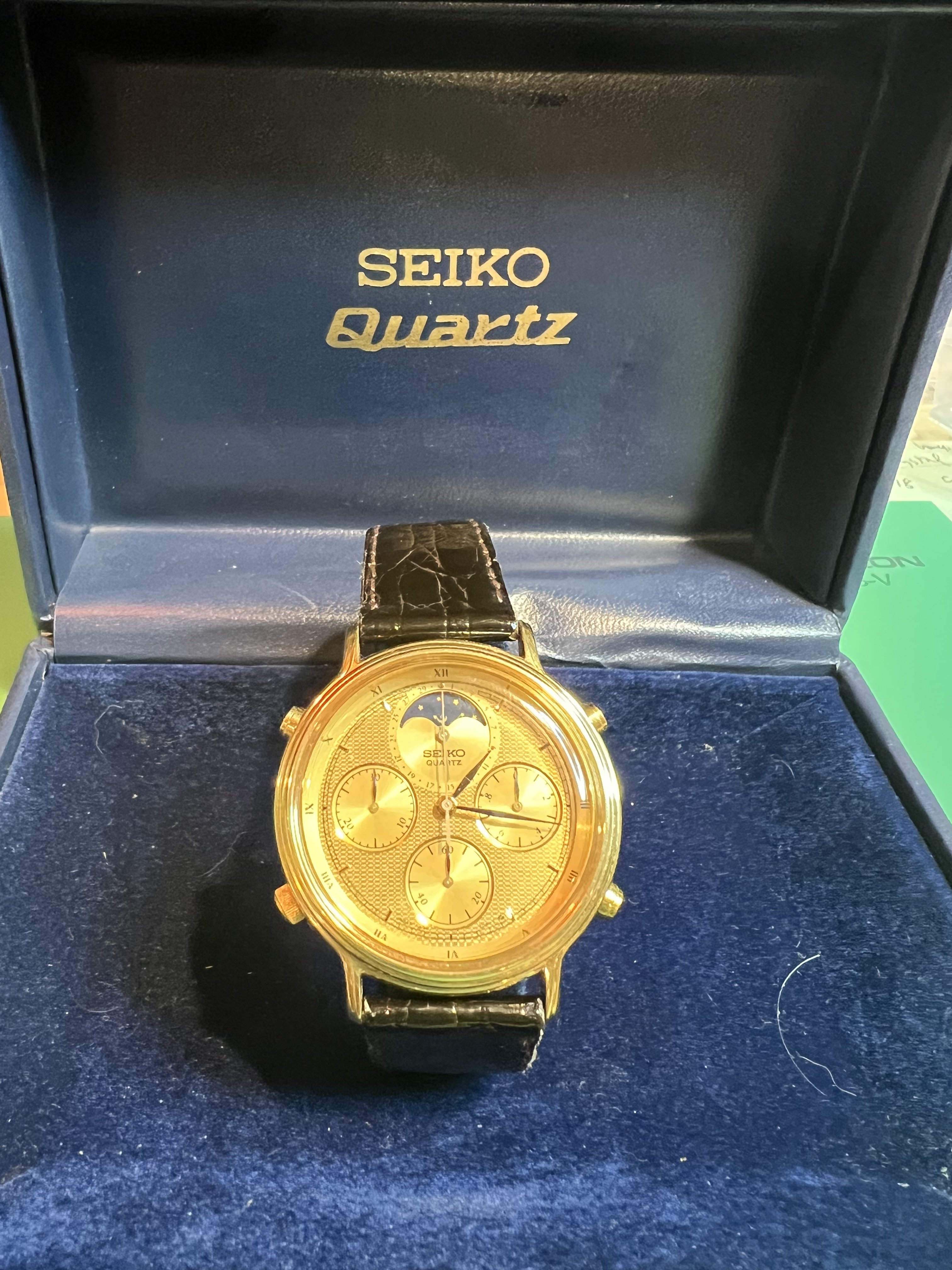 All original example of what is said to be the first Quartz Moonphase chronograph. This is part of the 7A28 family, considered to be one of the best quartz movements made by Seiko or any brand. These watches were made with metal parts and are designed to be fully serviceable. This beautiful gold reference has full chronograph functions plus moonphase complication which takes a full rotation in 29 days. Everything functions as it should. It is in used but excellent overall condition. It is all original and running great.