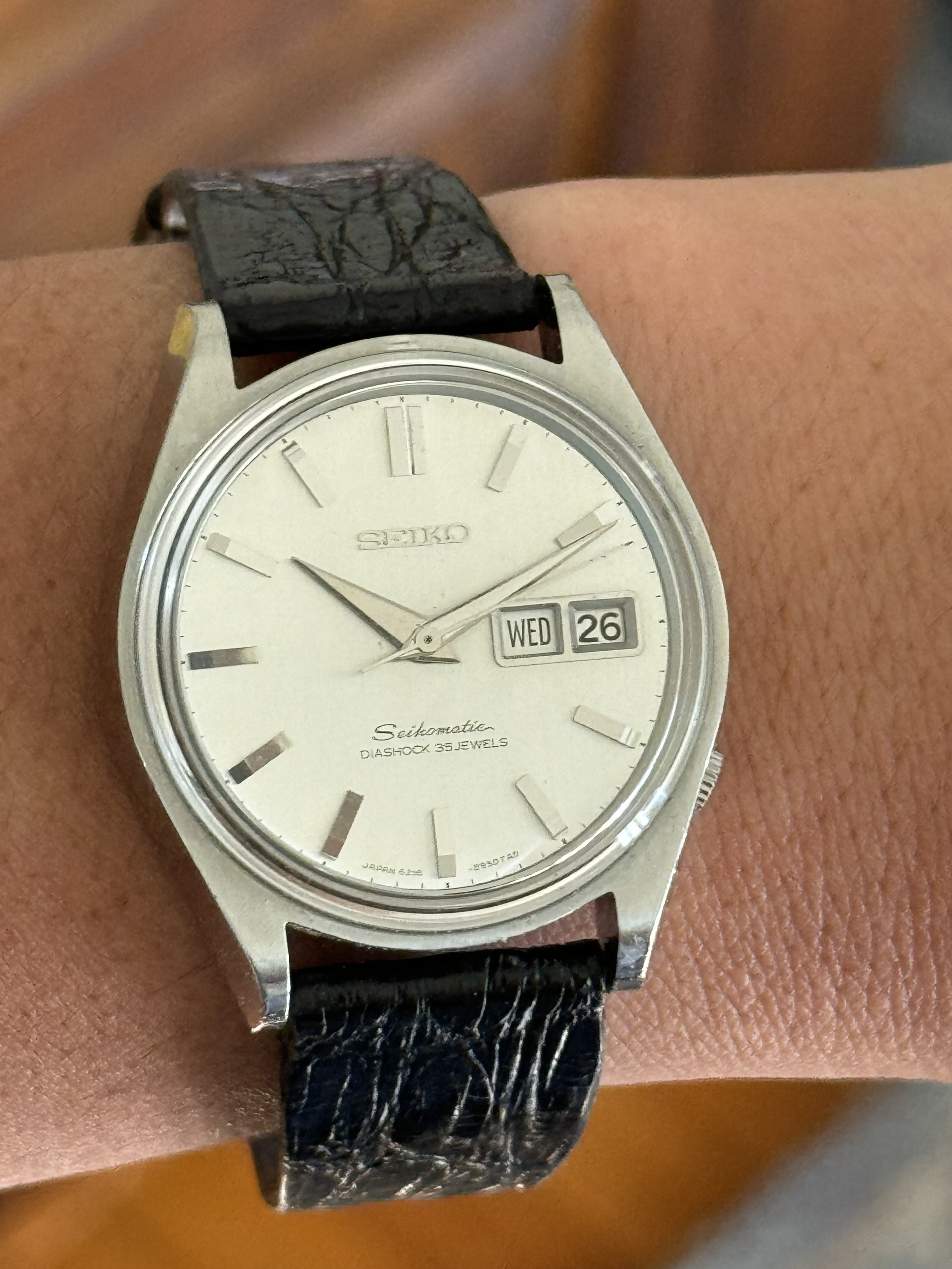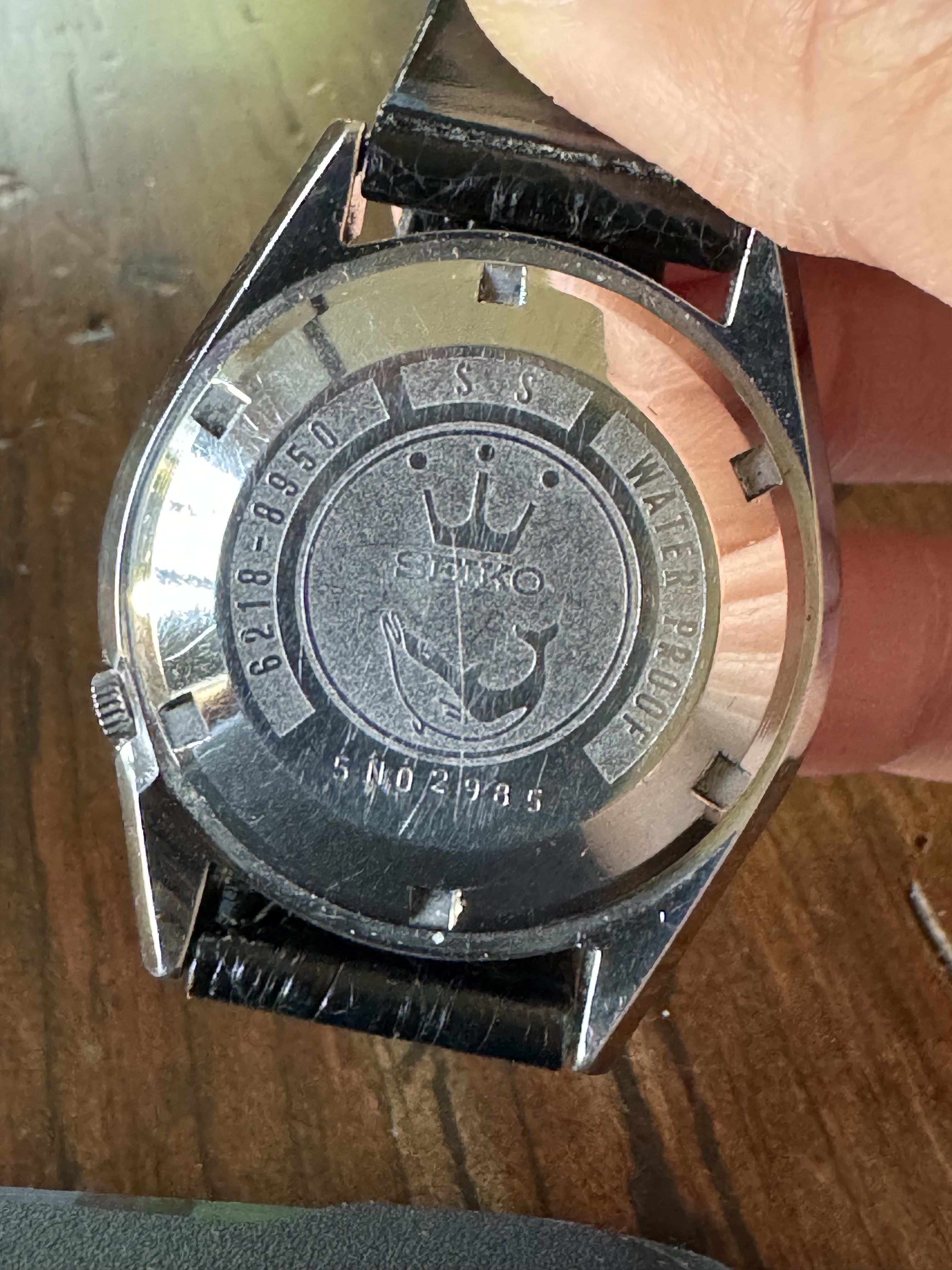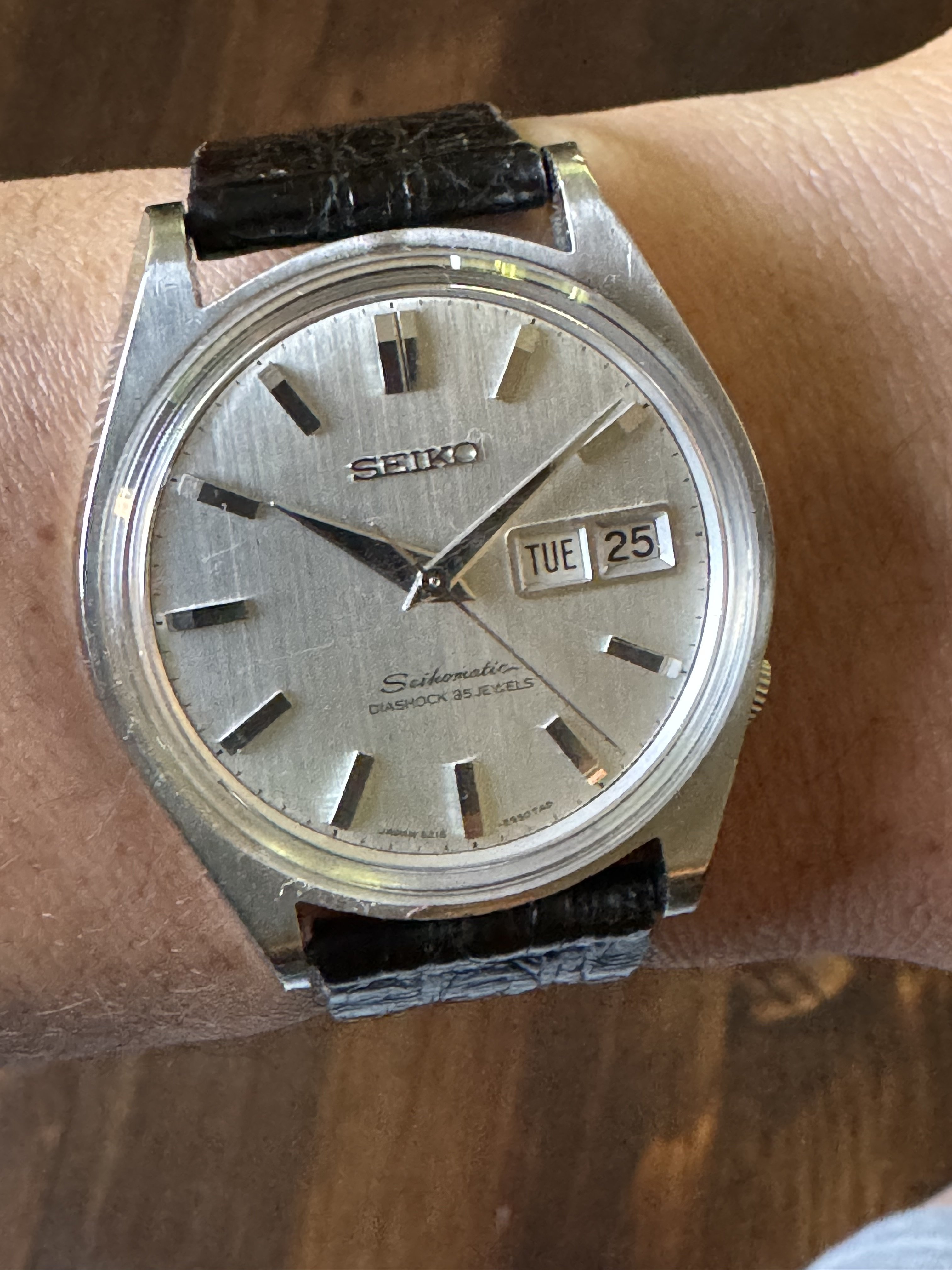 ·Up for sale is this Seikomatic 6218-8950. Day date, 35 jewel movement. The dial is really nice, no flaws that I can see (the line that looks like a scratch by 9 is on the crystal). The hands and markers are quite stunning and the facets reflect light in a Grand Seiko esque way. All functions are working and seems to be keeping time well. The caseback is interesting for the dolphin design. Keep in mind the movement is wound by shaking, the watch has no manual wind function.