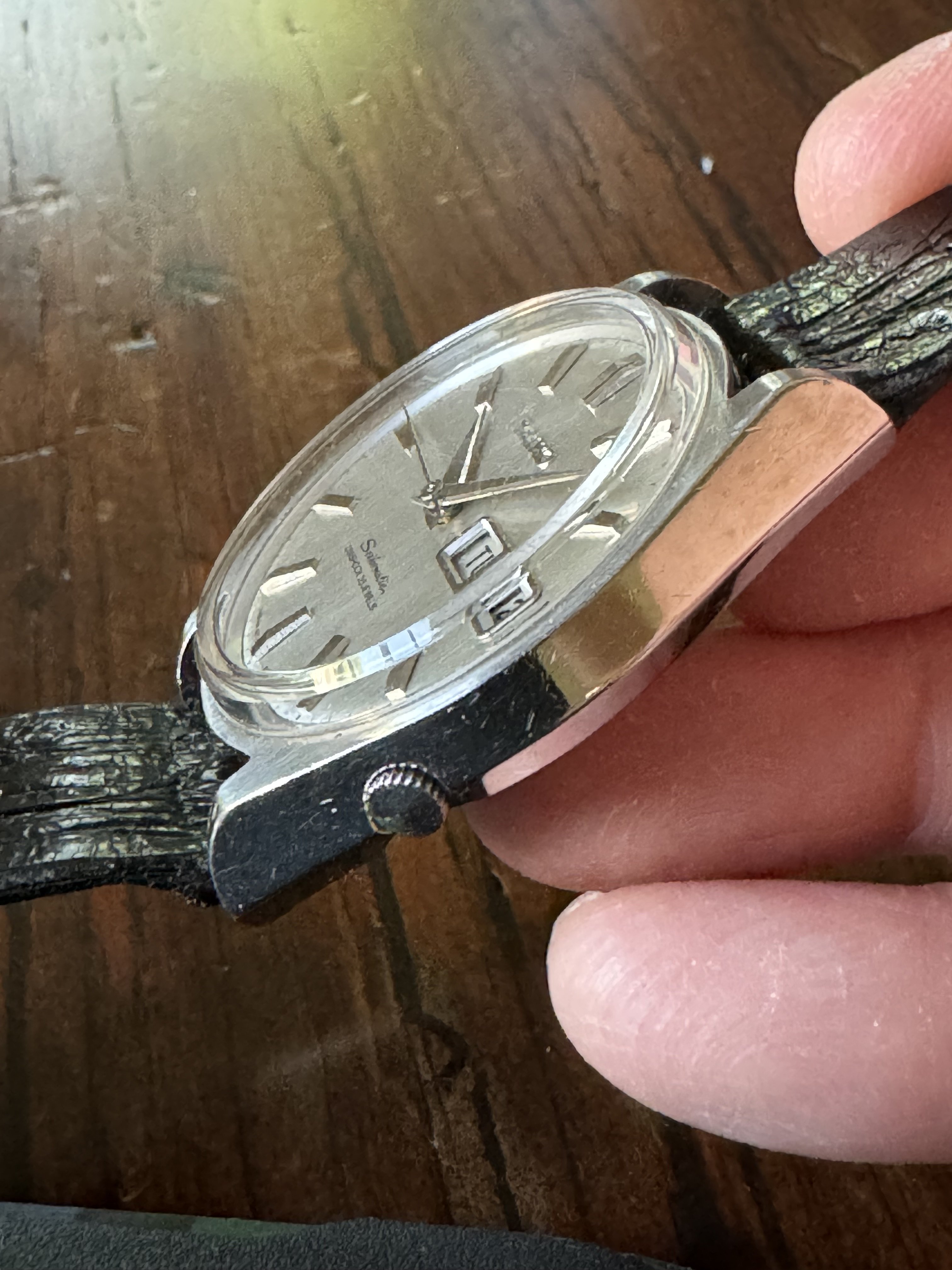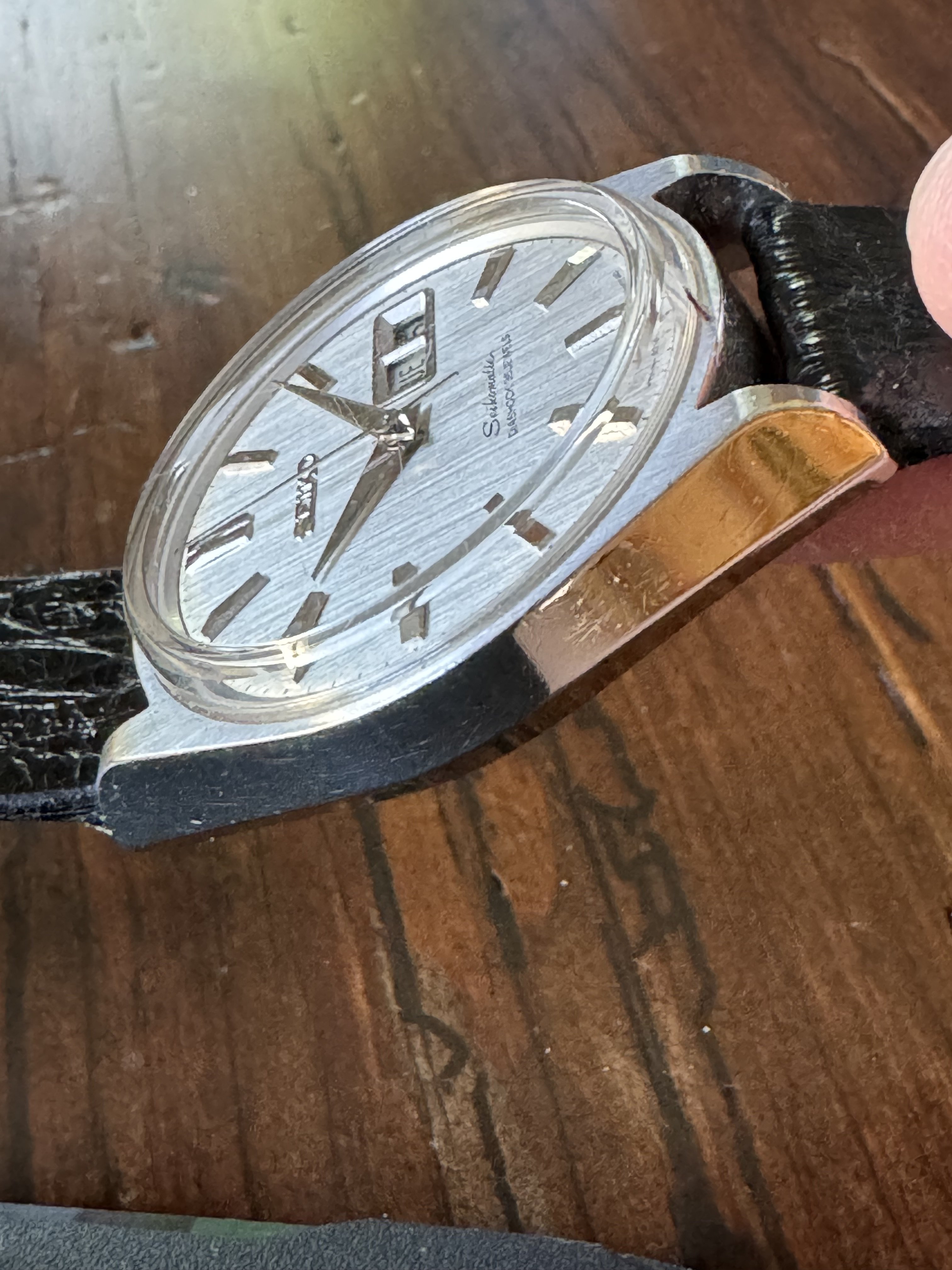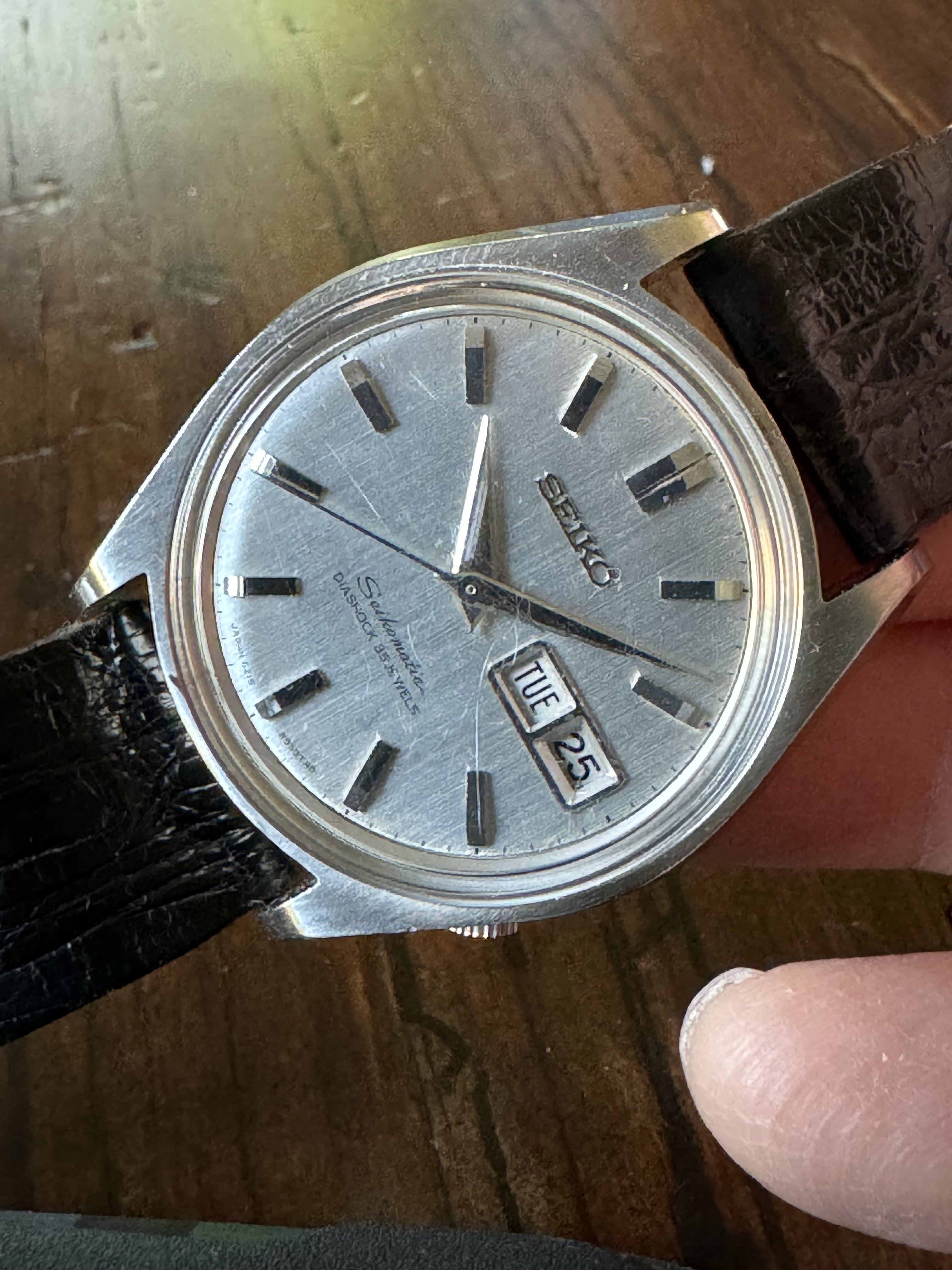 ·Up for sale is this Seikomatic 6218-8950. Day date, 35 jewel movement. The dial is really nice, no flaws that I can see (the line that looks like a scratch by 9 is on the crystal). The hands and markers are quite stunning and the facets reflect light in a Grand Seiko esque way. All functions are working and seems to be keeping time well. The caseback is interesting for the dolphin design. Keep in mind the movement is wound by shaking, the watch has no manual wind function.